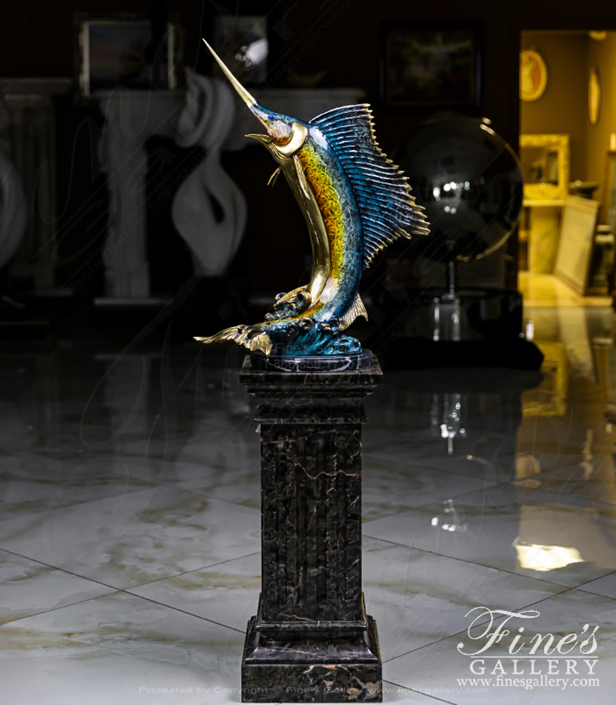 26 Inch Bronze Sailfish Statue included with Nero Marquina marble plinth. Perfect for the top of a mantel or pedestal decor.