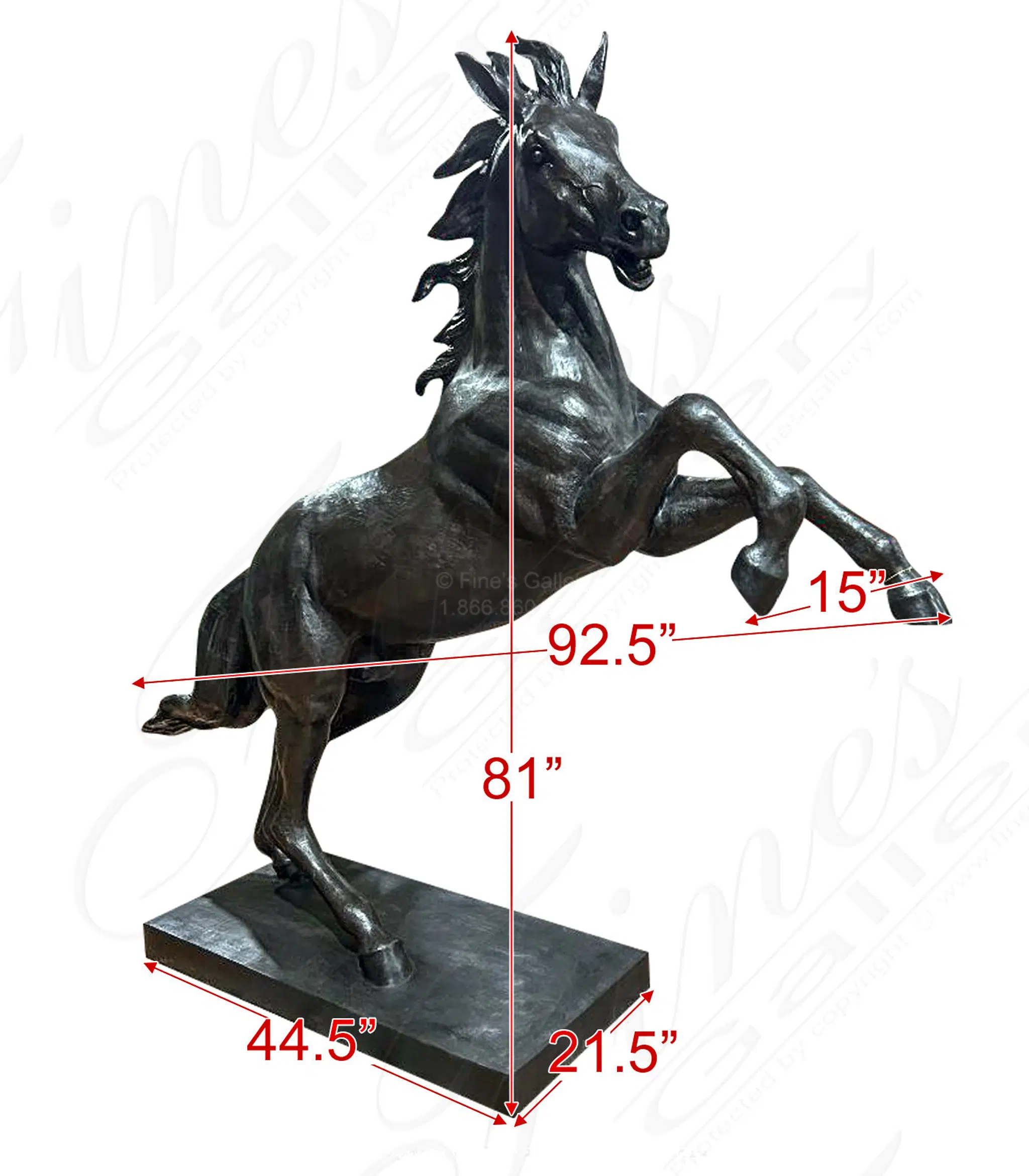 A Pair of Rearing Bronze Horses cast from a very high quality classic bronze. Size is approximate per piece size. Footprint measures 44 x 21 1/2 inches. Only one of the horses from the set is presently in-stock for the advertised price.