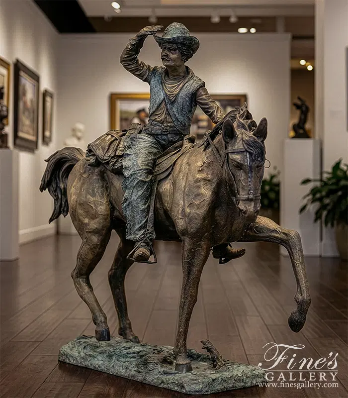 This Bronze Cowboy riding a horse statue a pioneer of the old West, making a large impact with his sense of adventure and integrity. The artist has brought this larger than life adventurer of the old American West back with his amazing details and colors.
