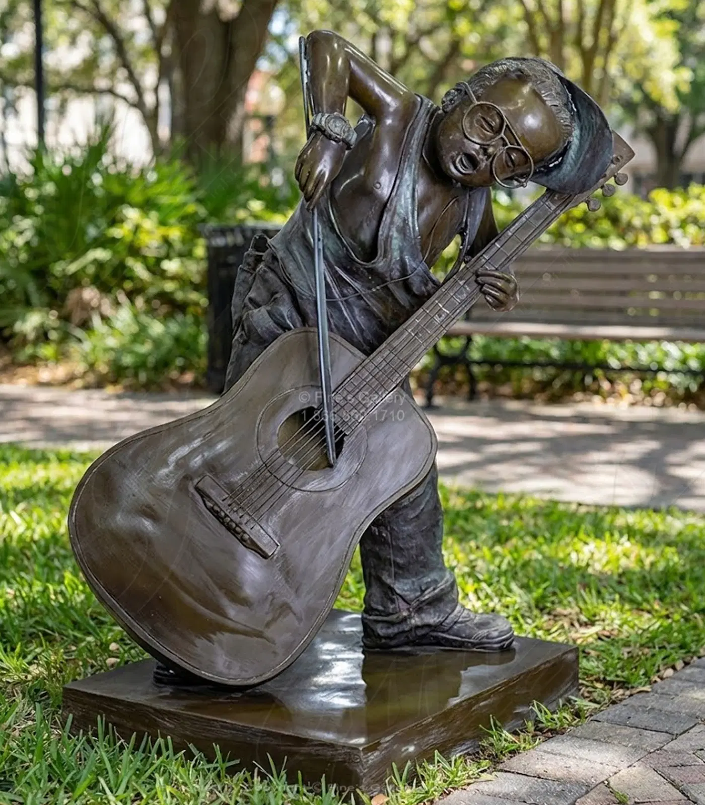 Vintage Bronze Statue - Young Boy Playing Guitar Like Cello - Lost Wax Museum Quality Sculpture