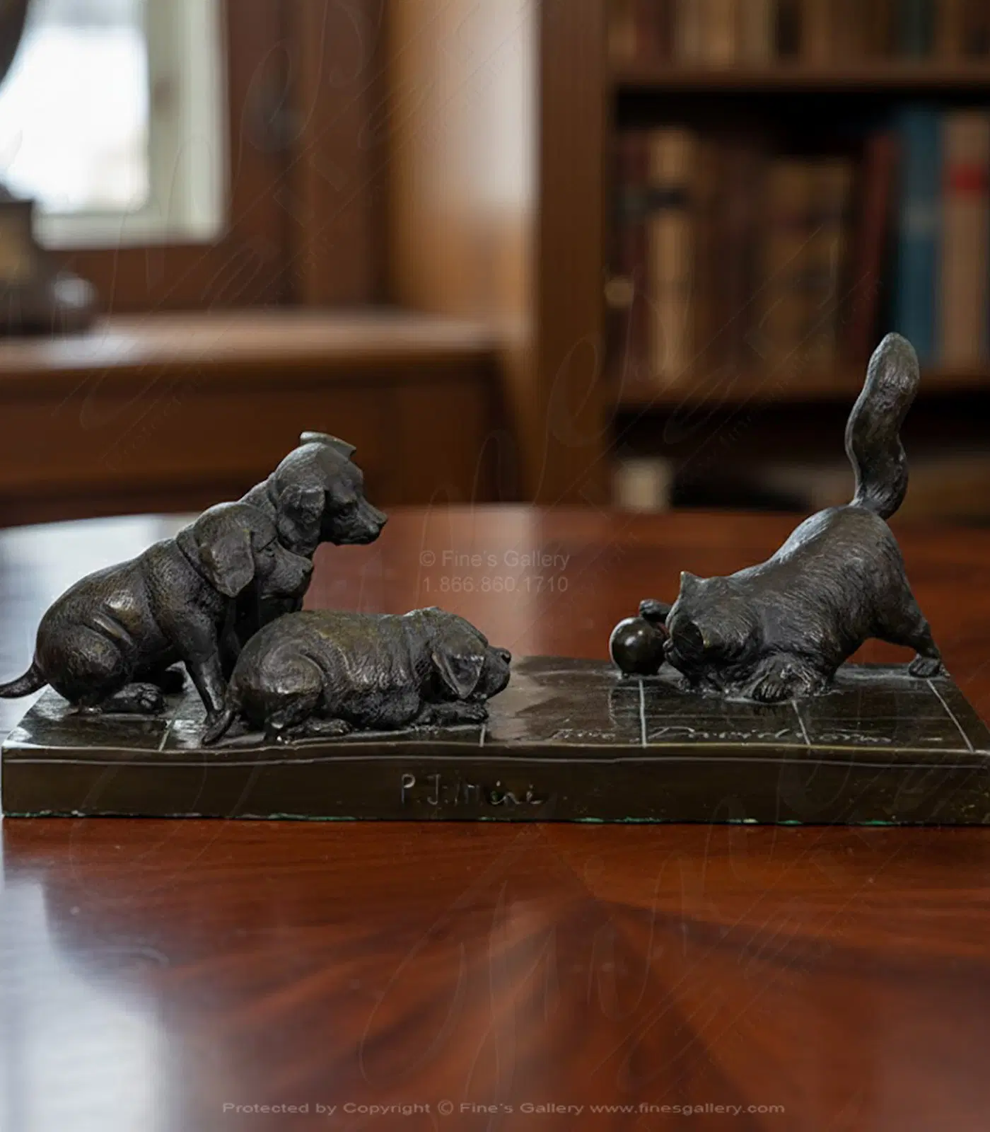 This playful statue is made of bronze with a special patina to give it definition. Three puppies watch with inquisitiveness as a kitten plays with a ball. Great detail went into this piece to express the curiosity of the puppies.