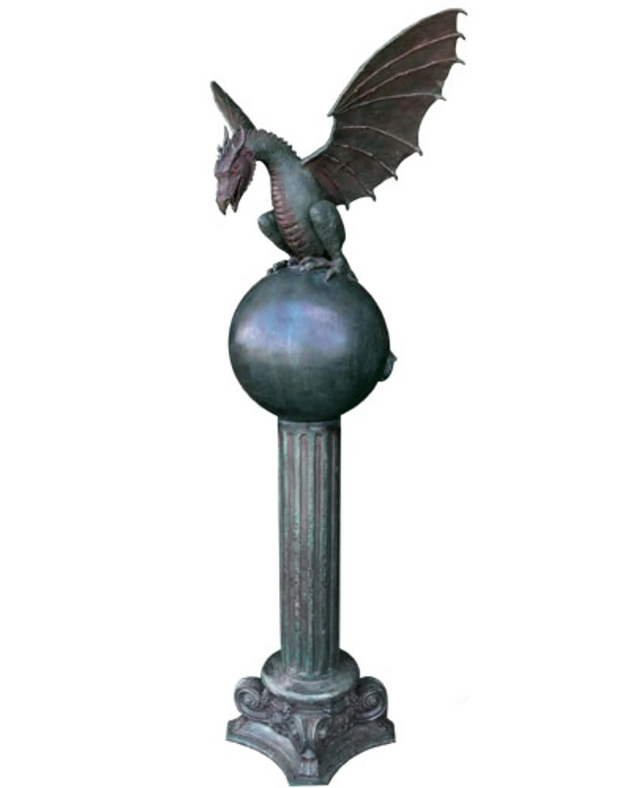 This exotic bronze statue depicts a Gothic dragon perched upon a sphere. The artist used a perfectly blended bronze to depict the dragon and finished the base with a beautiful patina. This extraordinary piece brings out the beauty of the bronze.