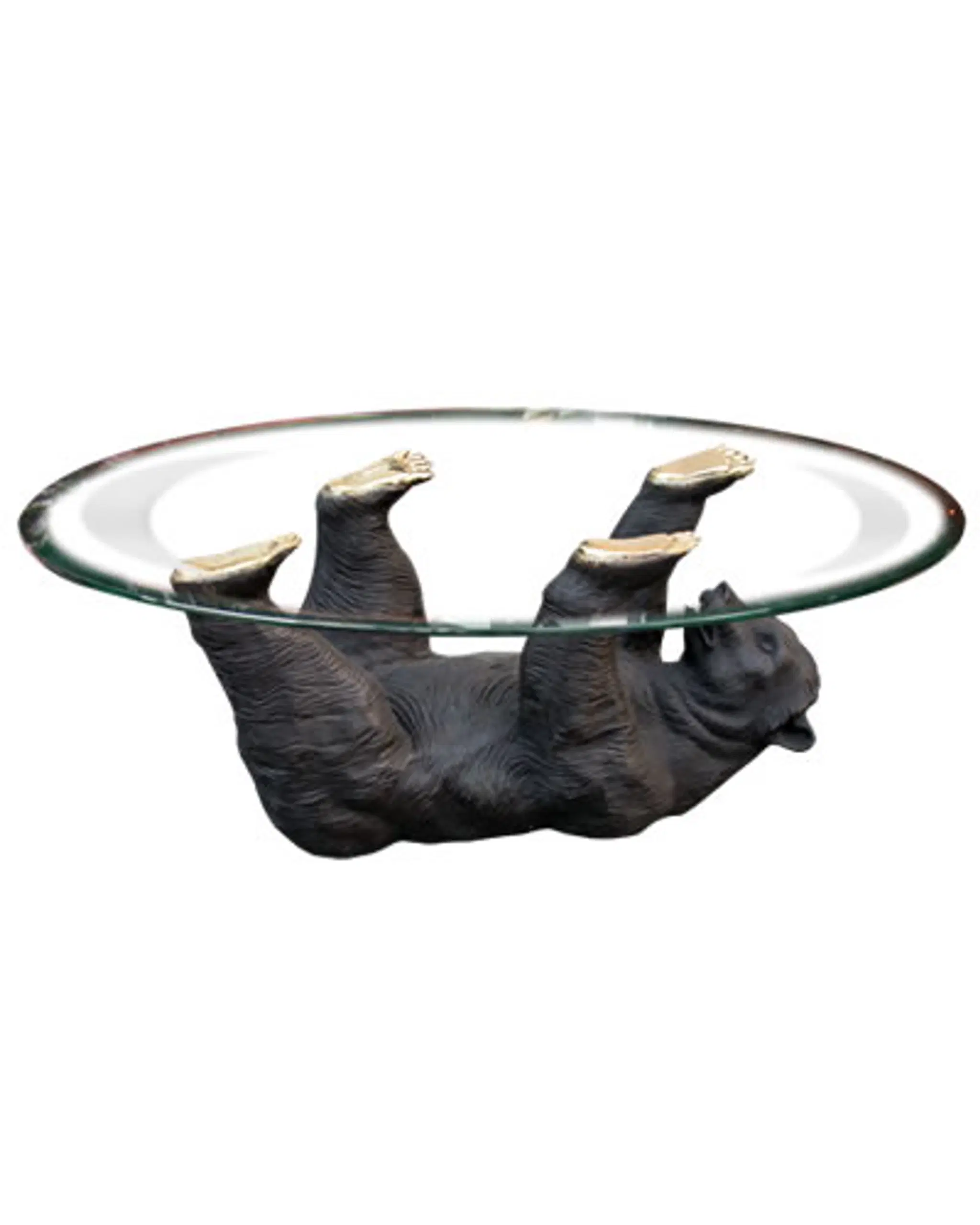 Make this fascinating Bronze Bear Table the focal point?in your living room. A spectacular piece of artwork and perfect likeness of this creature, who lies on his back and supports a glass top with his golden paws. Contact our gallery today.