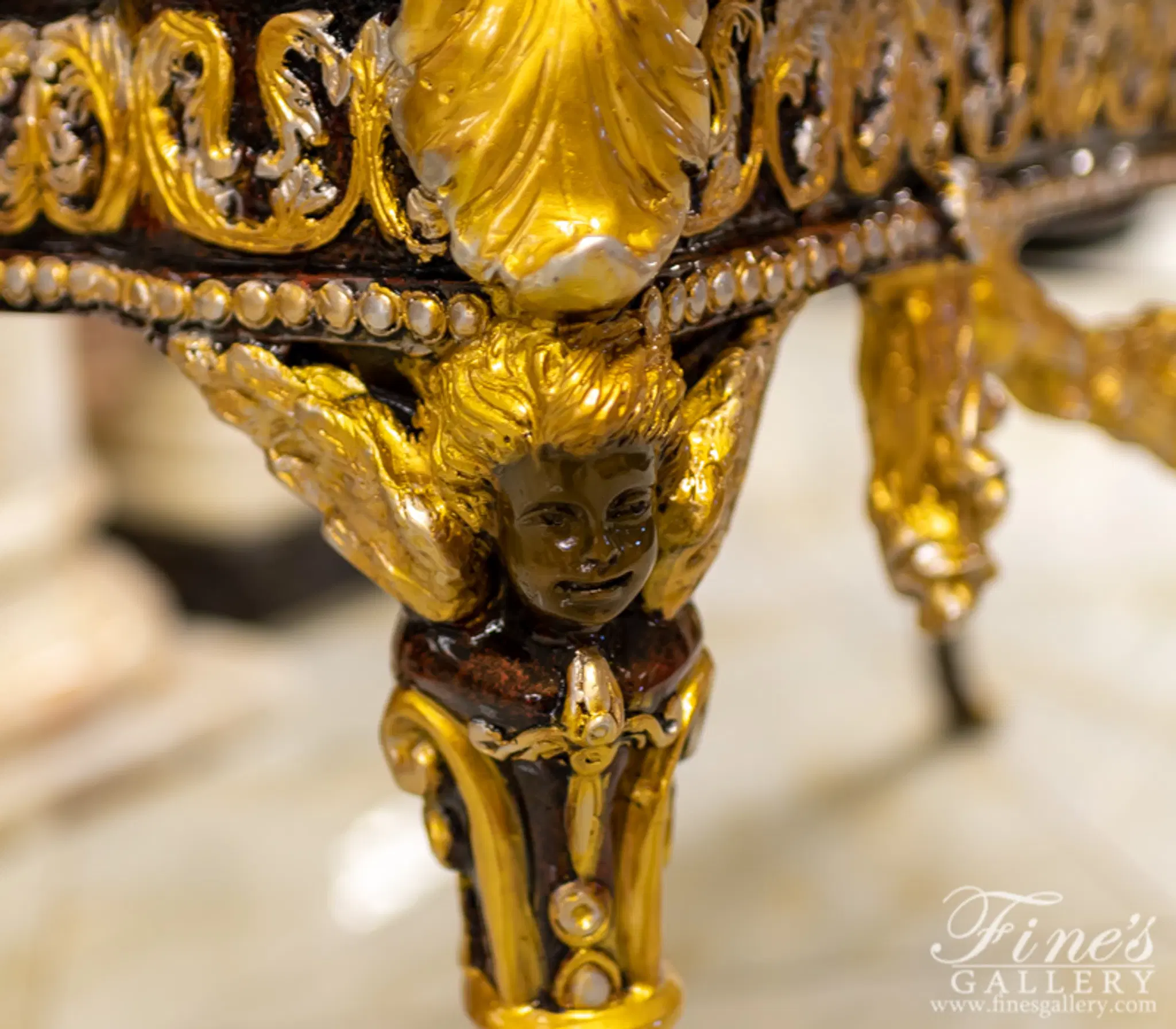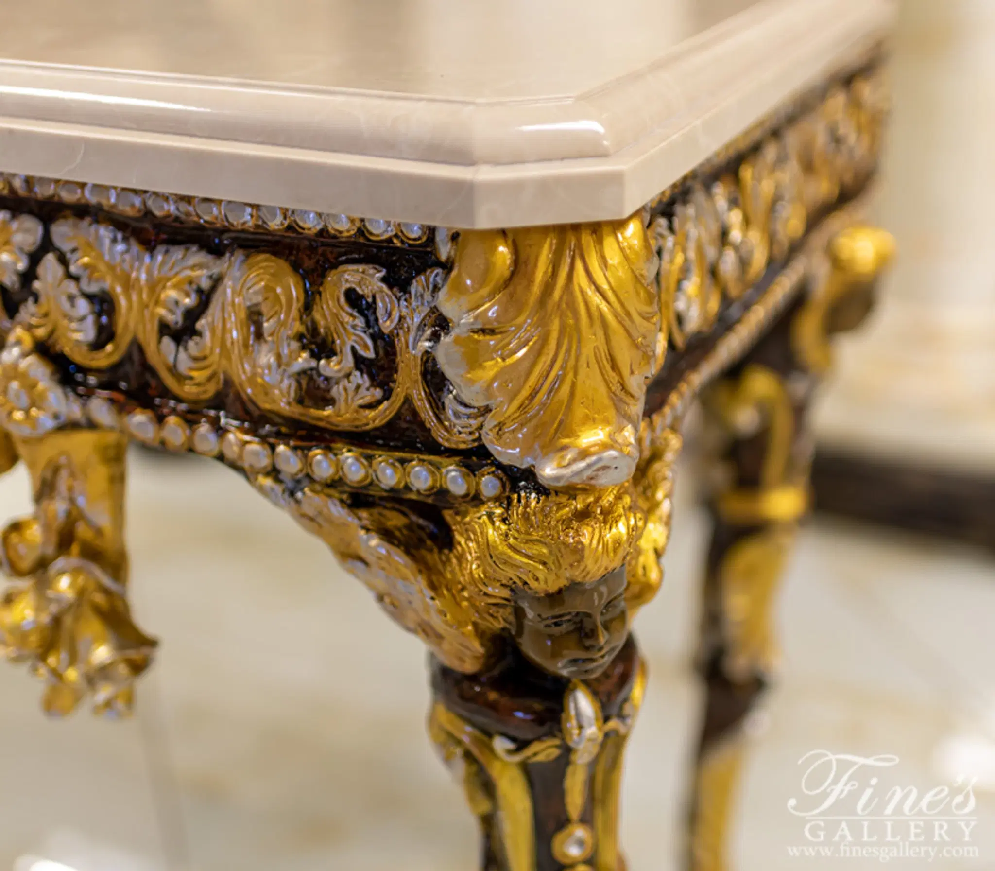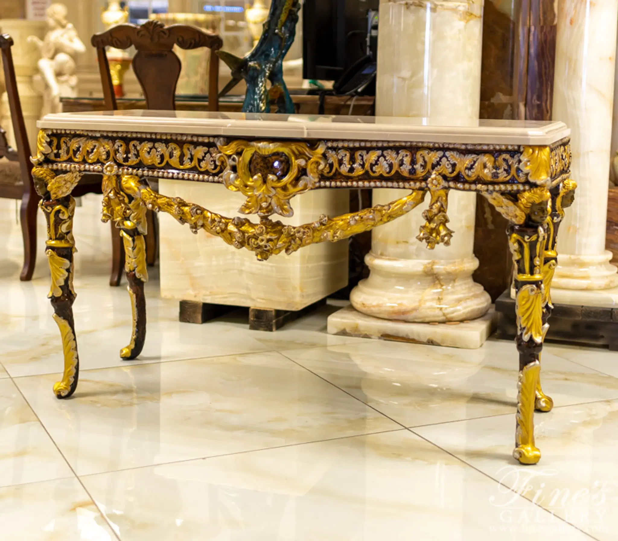 This spectacular bronze entry table features a gold finished enamel bronze with ornate and decorative detail including floral garlands and mystical cherubs. A french antique style bronze piece. The light cream marble slab shown here is included!