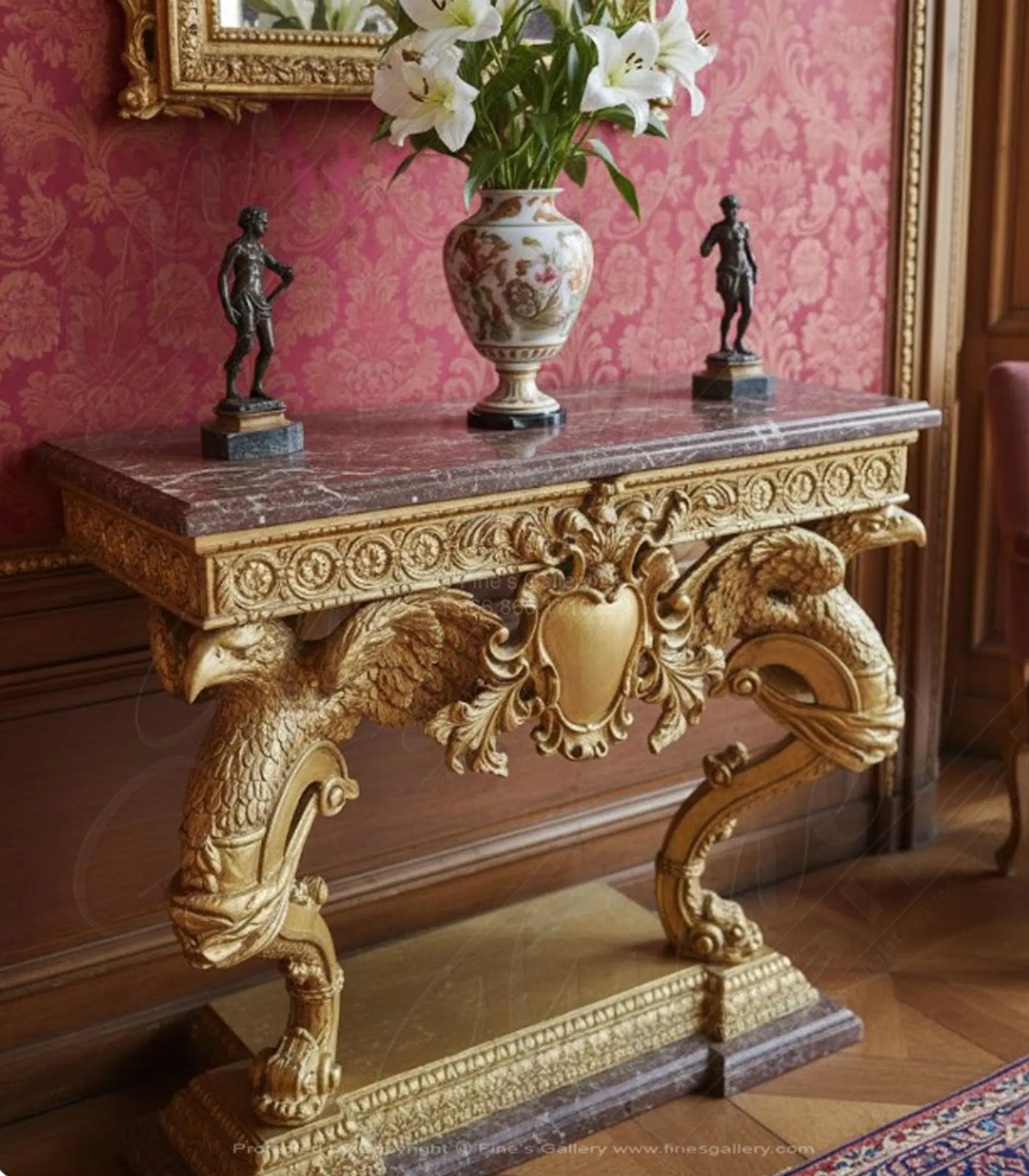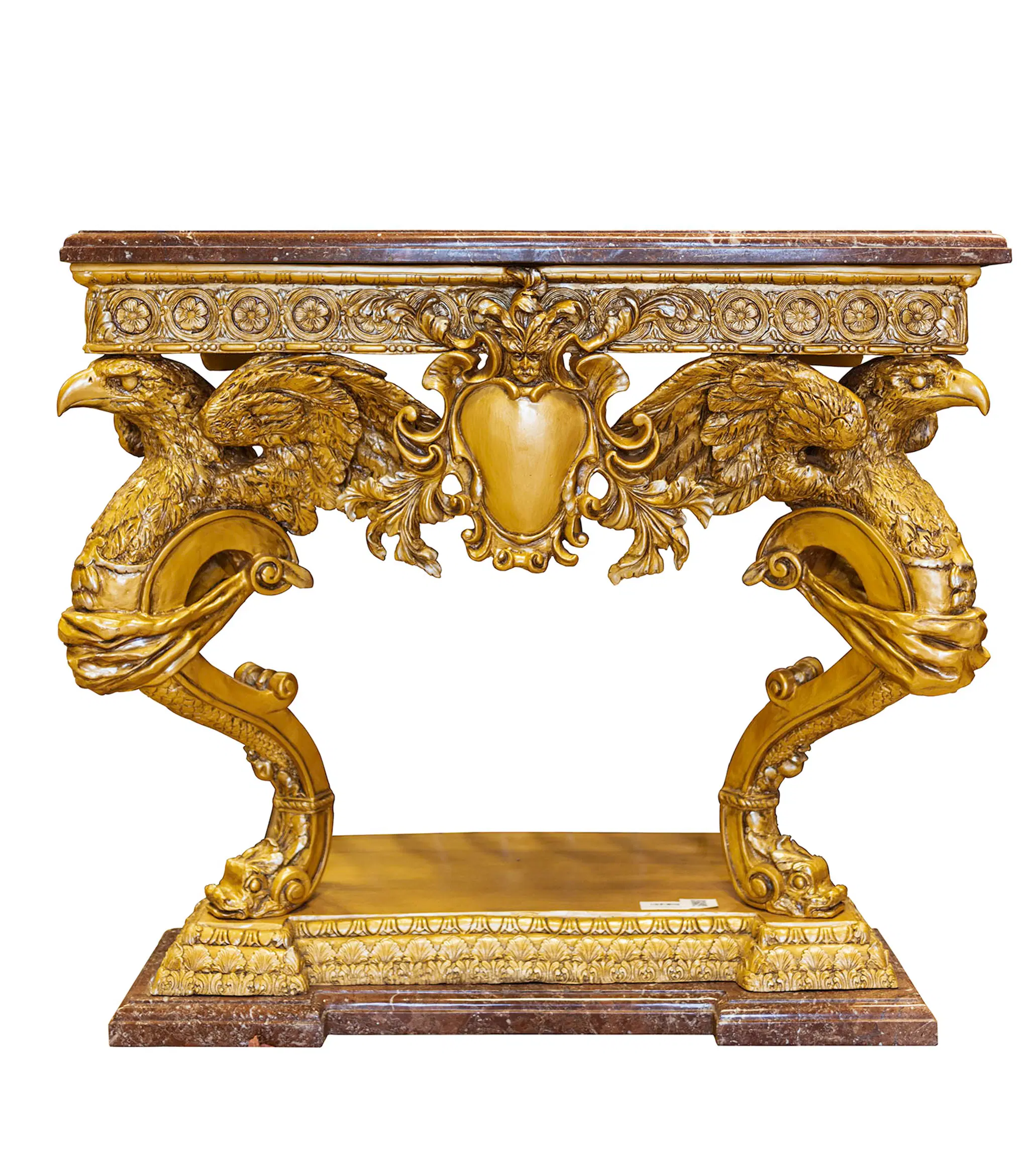Bronze Table with Marble Top. Featuring regal bronze eagle and decorative crest. Very fine worksmanship throughout in highest quality bronze and marble.