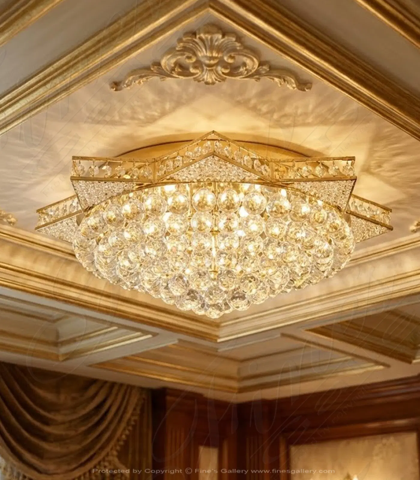 Large crystal balls are adorned in a gold color plated star design. A perfect choice for rooms with limited a height area with its shallow but elegant star shaped design. The large crystals cause a dramatic lighting refraction that you will truly love.