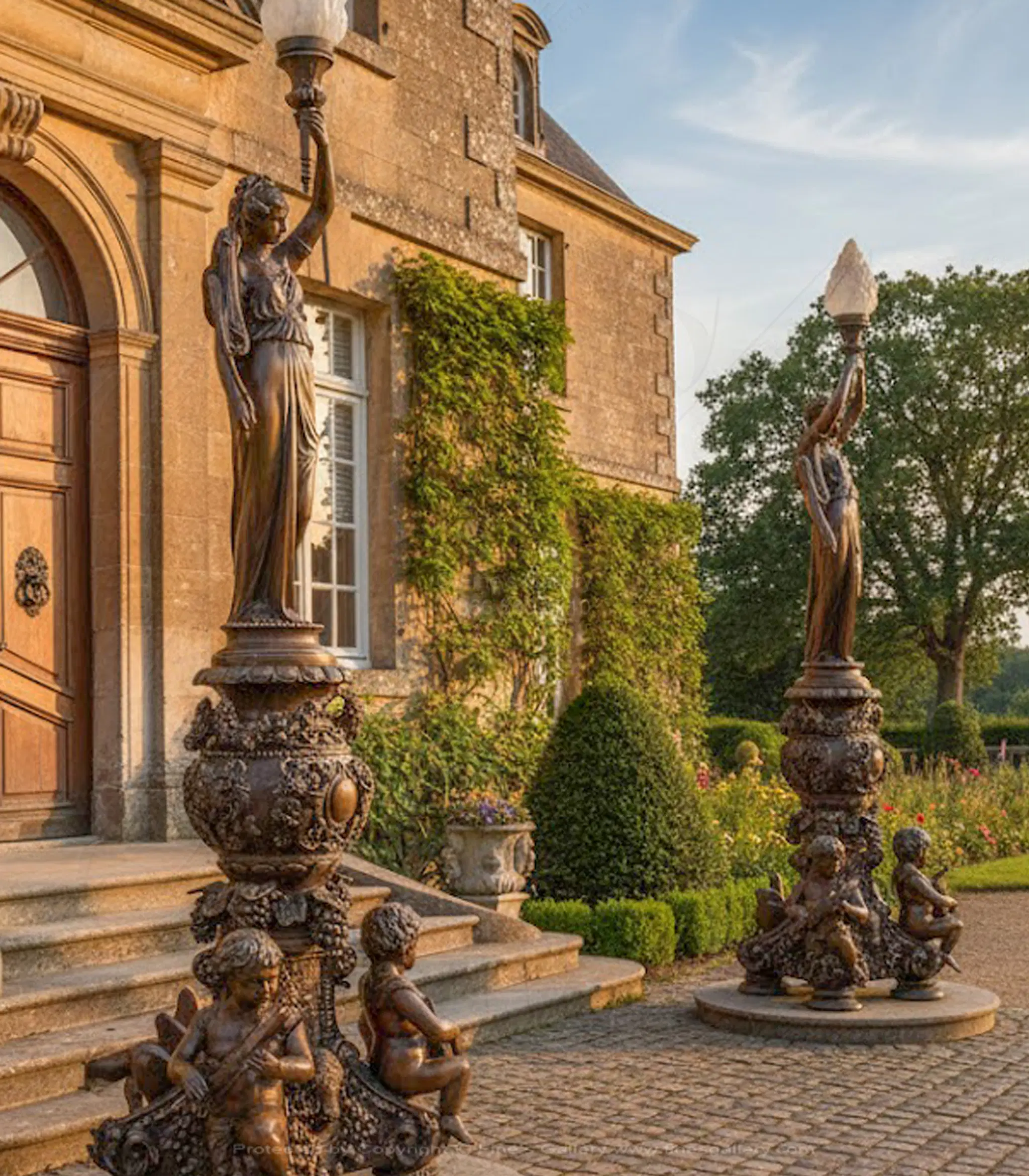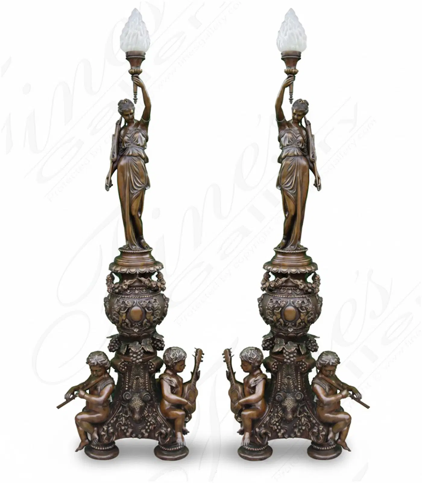 Light your way magnificently with these classic bronze cast and ornately carved lampposts. Softly draped, torch carrying maidens stand upon a pedestal of rich detail. Cherubs hold musical instruments as they sit at the base. Price per pair