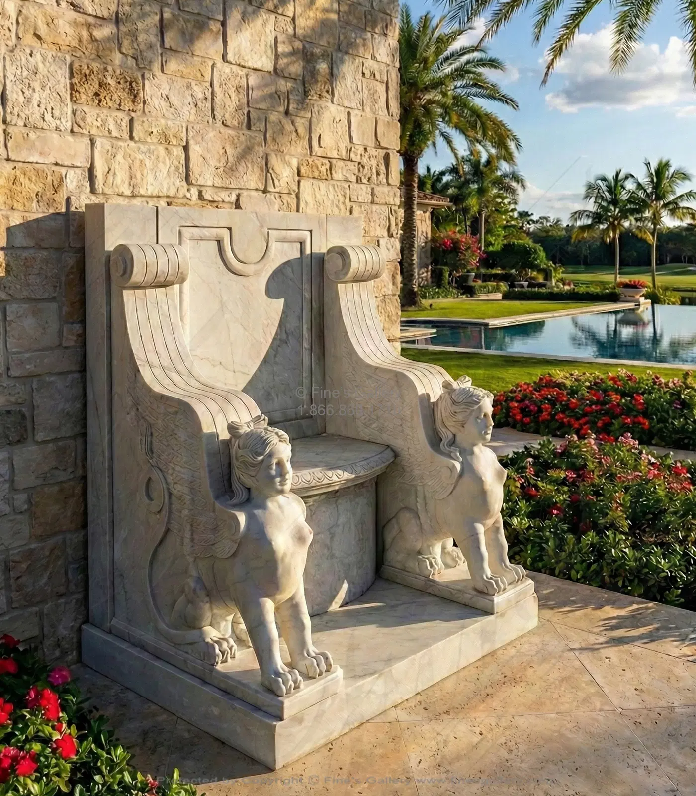Two beautiful sphinx figurines compliment the decadent design of this gorgeous marble bench. Lovely hand carved detail is featured throughout to give this piece elegance and beauty.