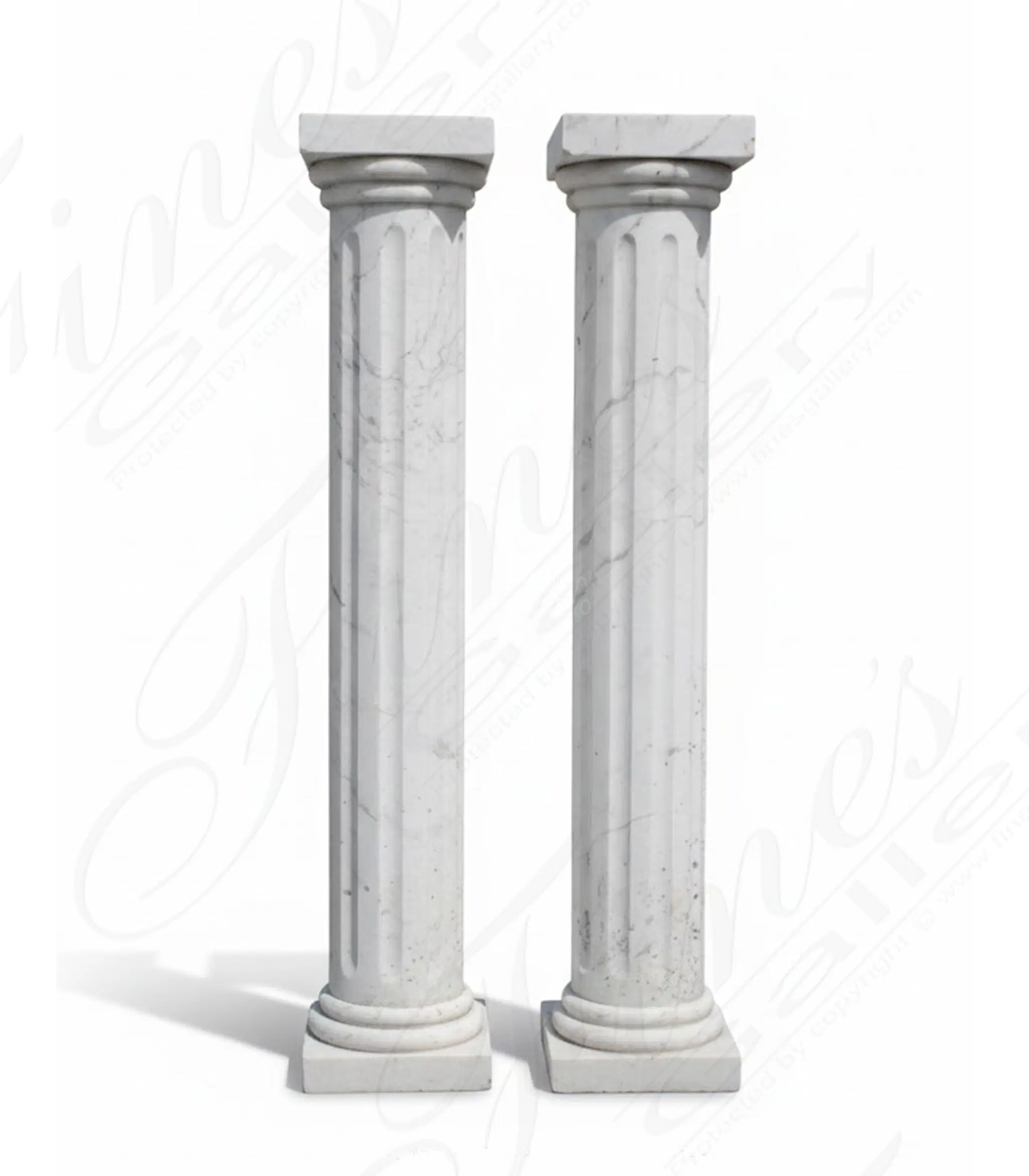 Elegant 49" White Marble Column Base Pair with Fluted Design - Genuine marble featuring a rounded shaft with square top and bottom, perfect for displaying artwork or floral arrangements. These sophisticated pedestals showcase beautiful gray veining throughout the pristine white marble, adding timeless elegance to any space. Exclusively from Fine's Gallery, the world leader in custom marble designs.