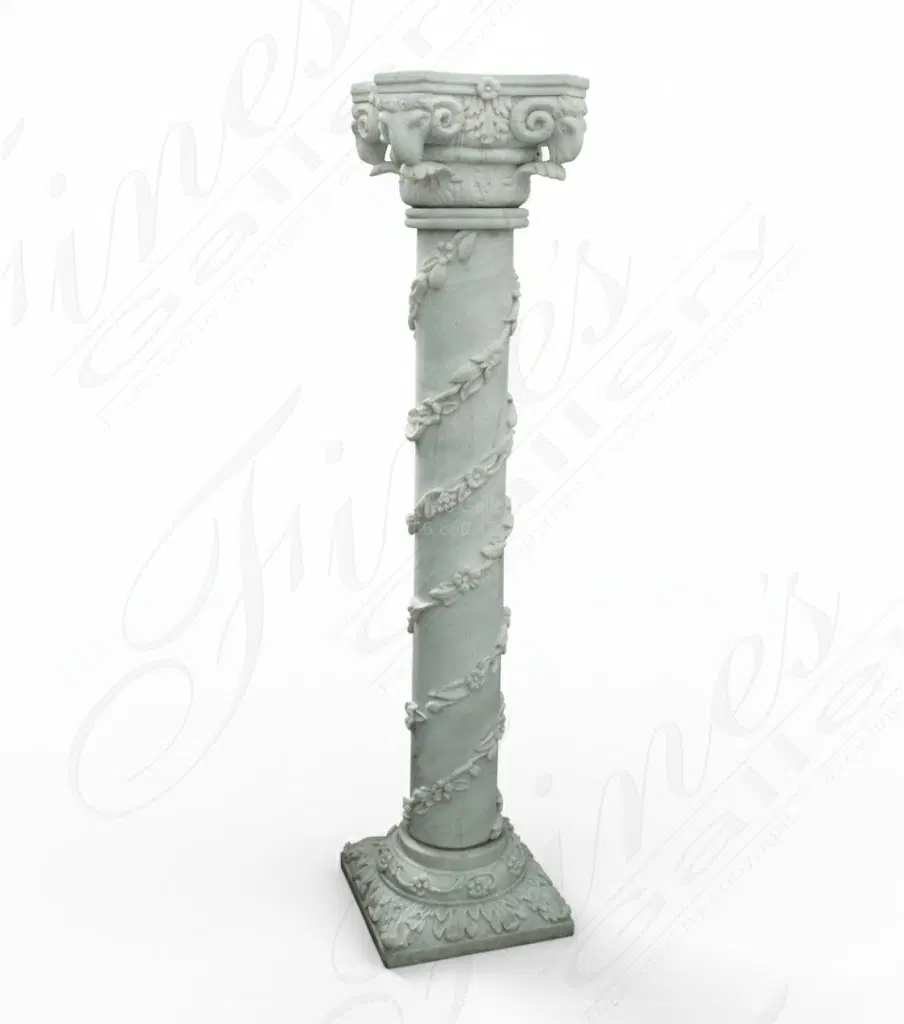Elevate your home decor with this exquisite 59" Ram Head & Flower Spiral Marble Base (MBS-076). Crafted from fine white marble, this stunning column features intricate flower vines spiraling upward to an elaborate capital adorned with detailed ram heads. The round column design offers timeless elegance that serves as a perfect pedestal for sculptures, busts, or decorative pieces. This statement piece combines classical artistry with luxurious craftsmanship, making it an ideal