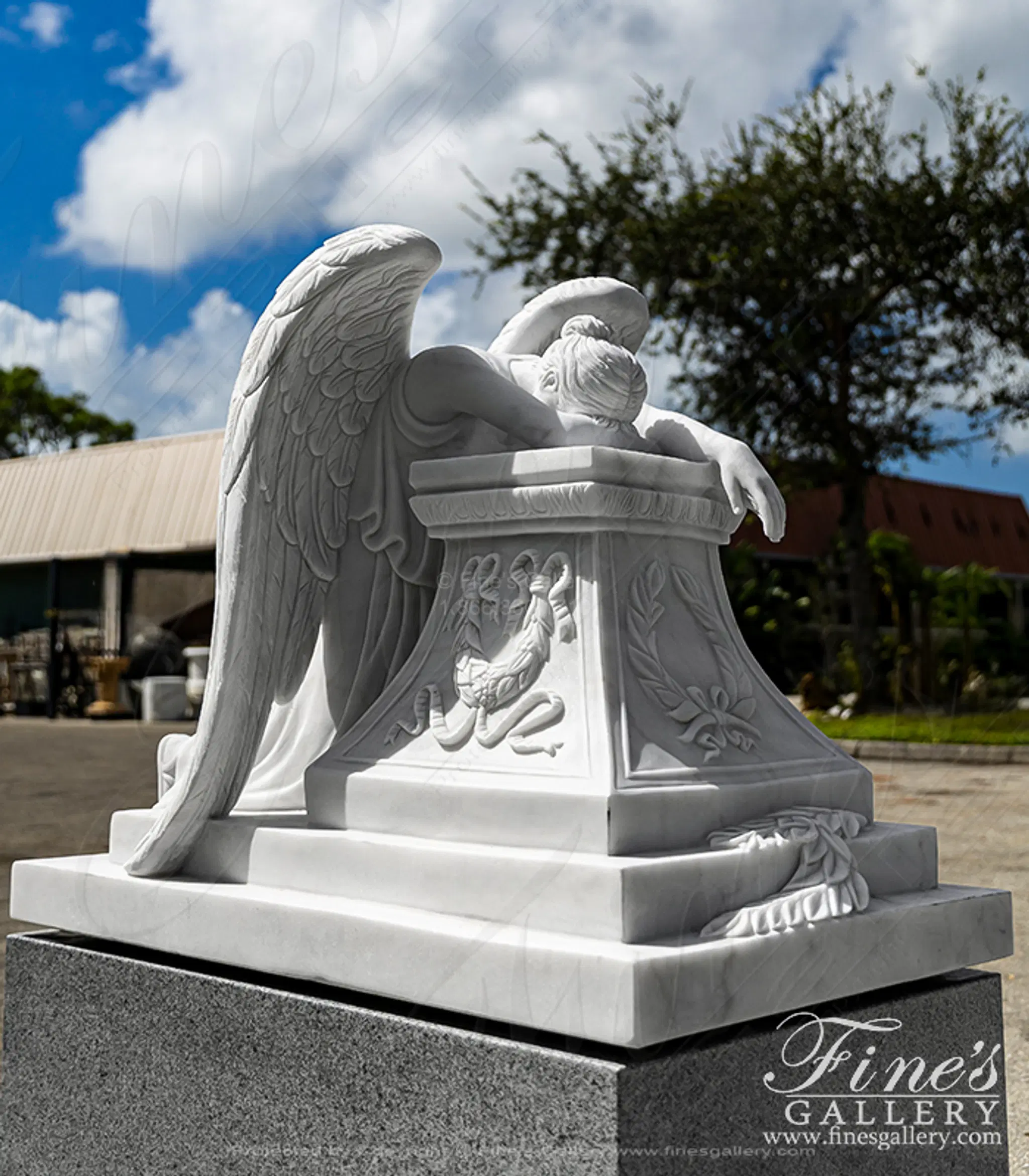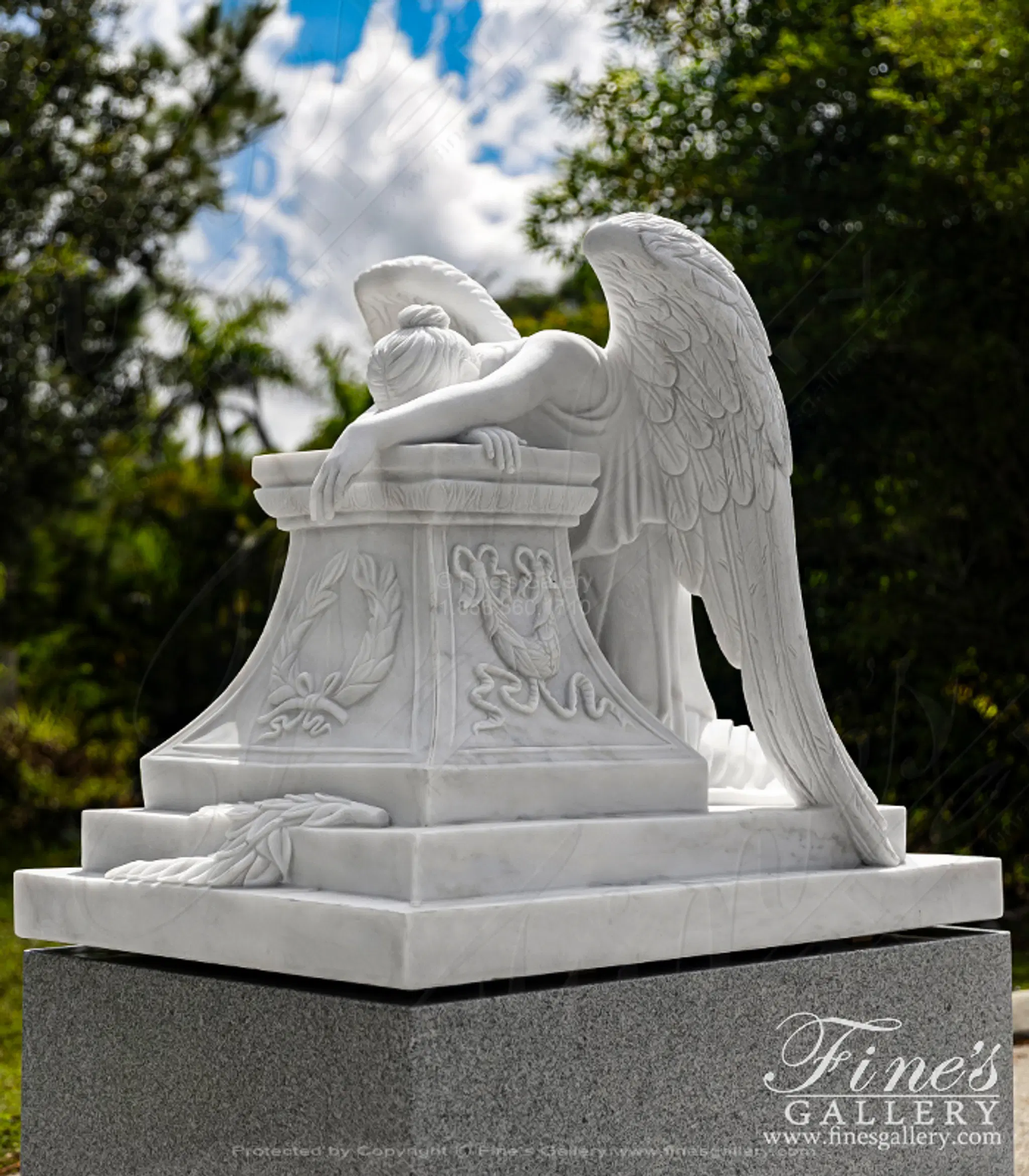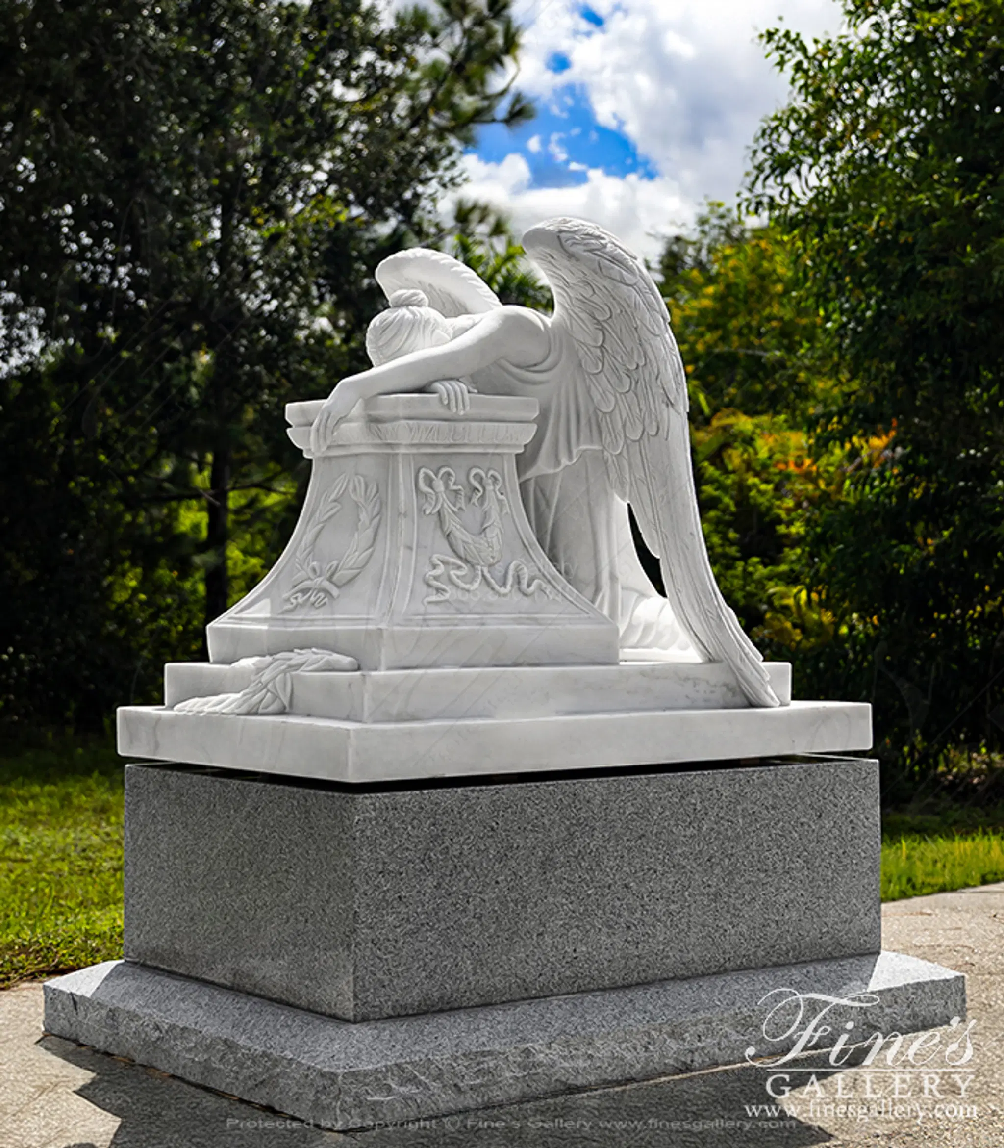 A Museum Quality Weeping Angel Marble Memorial Statue and Base Set. The set includes museum quality weeping angel statue in statuary marble and Solid Imperial Granite Base with Rocky Edge Sub Base.. Statue Size: 39" height x 49" length x 32" width. Base Size: 20" height x 56" length x 39" depth.