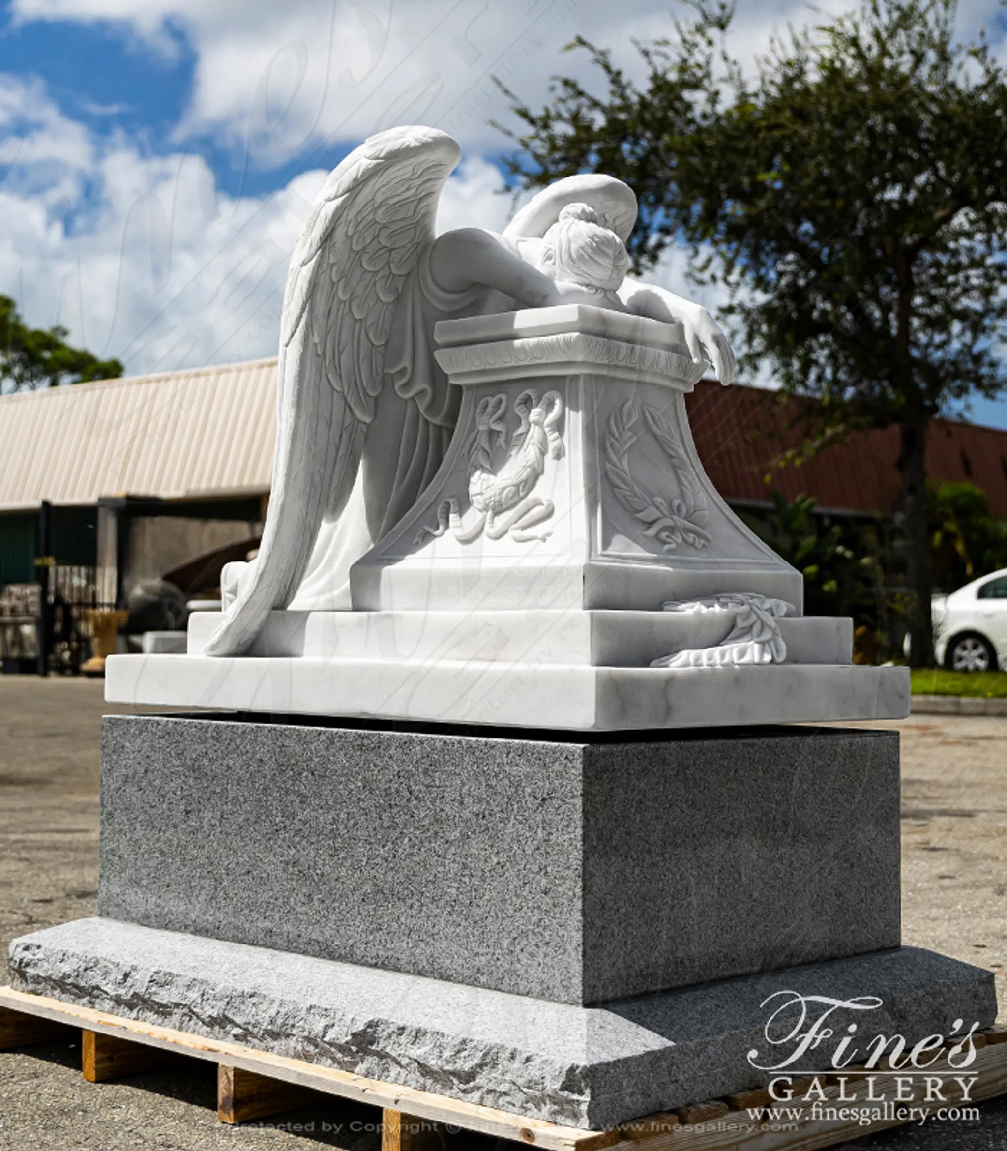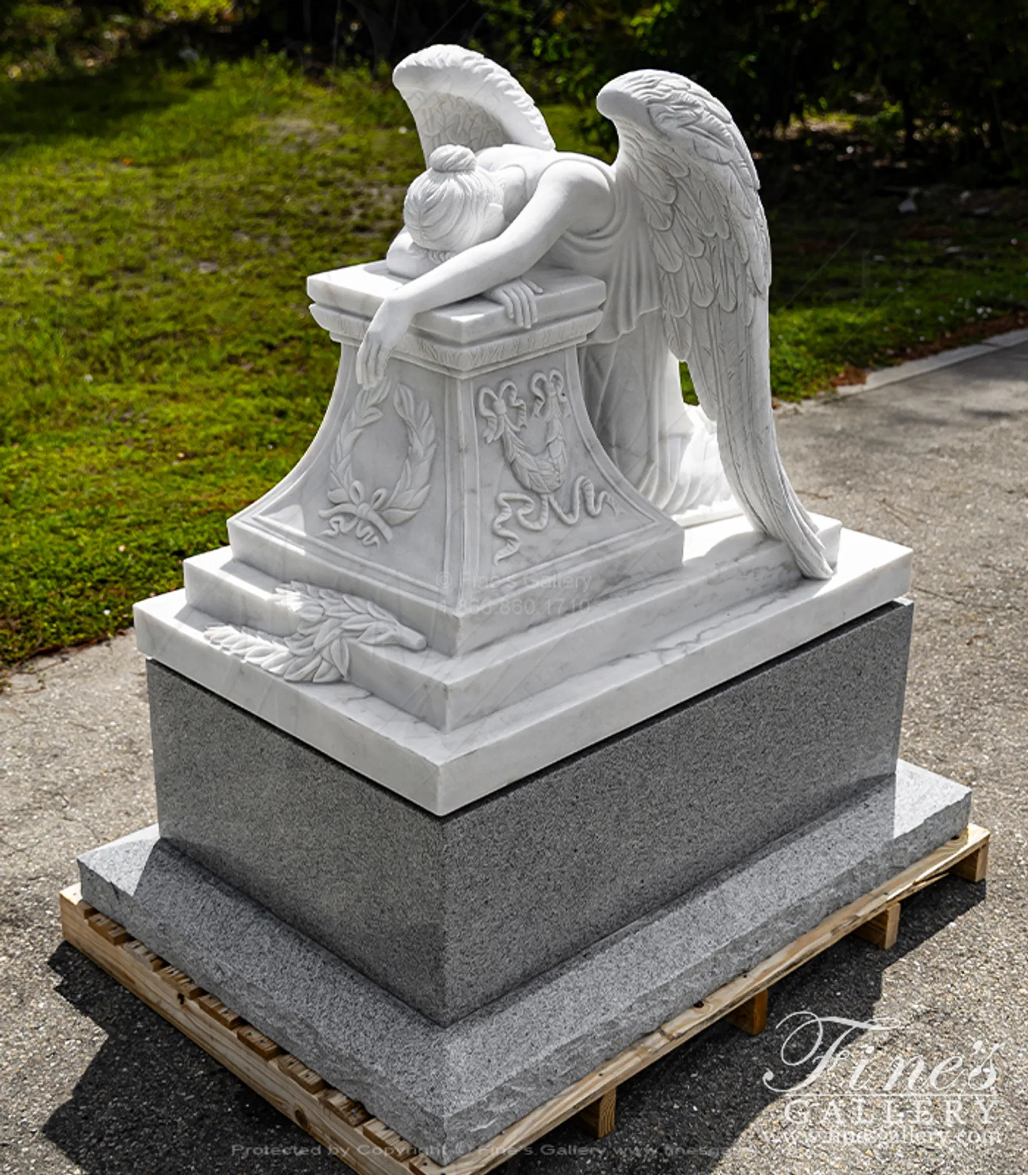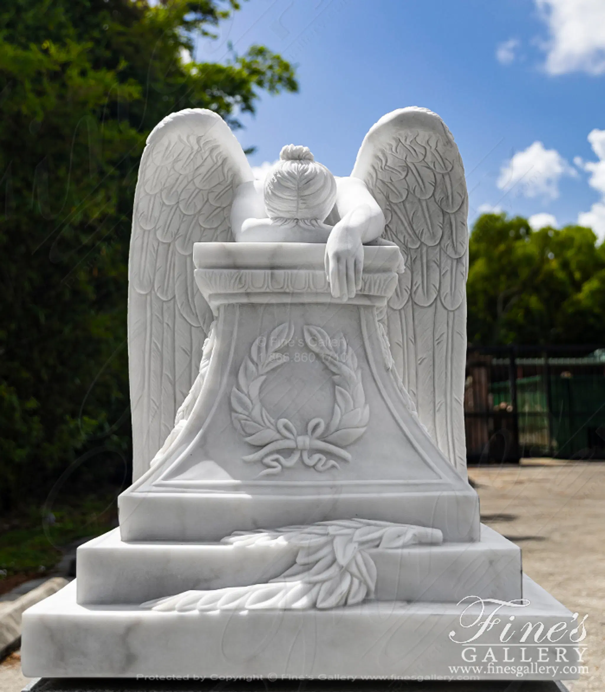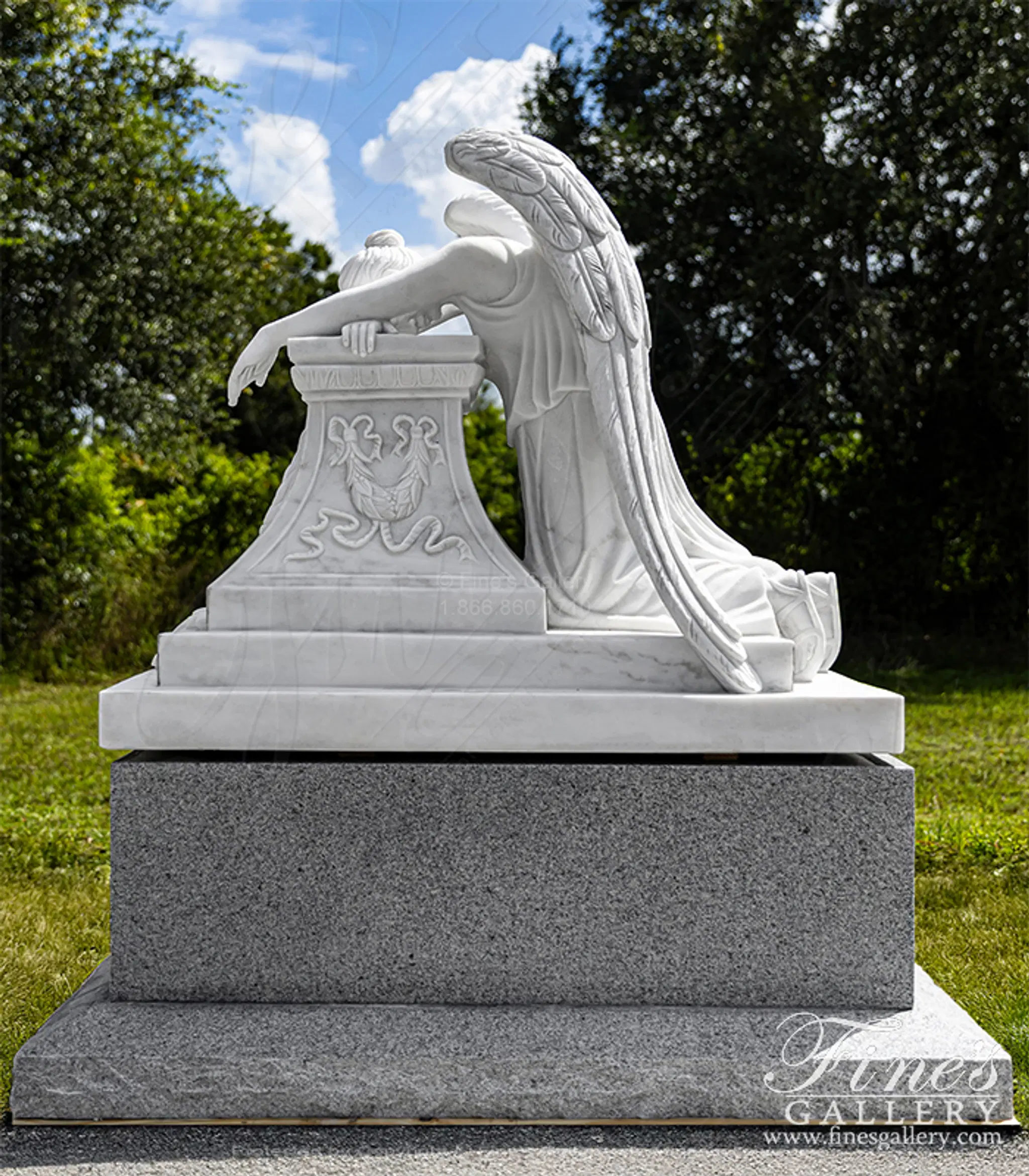 A Museum Quality Weeping Angel Marble Memorial Statue and Base Set. The set includes museum quality weeping angel statue in statuary marble and Solid Imperial Granite Base with Rocky Edge Sub Base.. Statue Size: 39" height x 49" length x 32" width. Base Size: 20" height x 56" length x 39" depth.