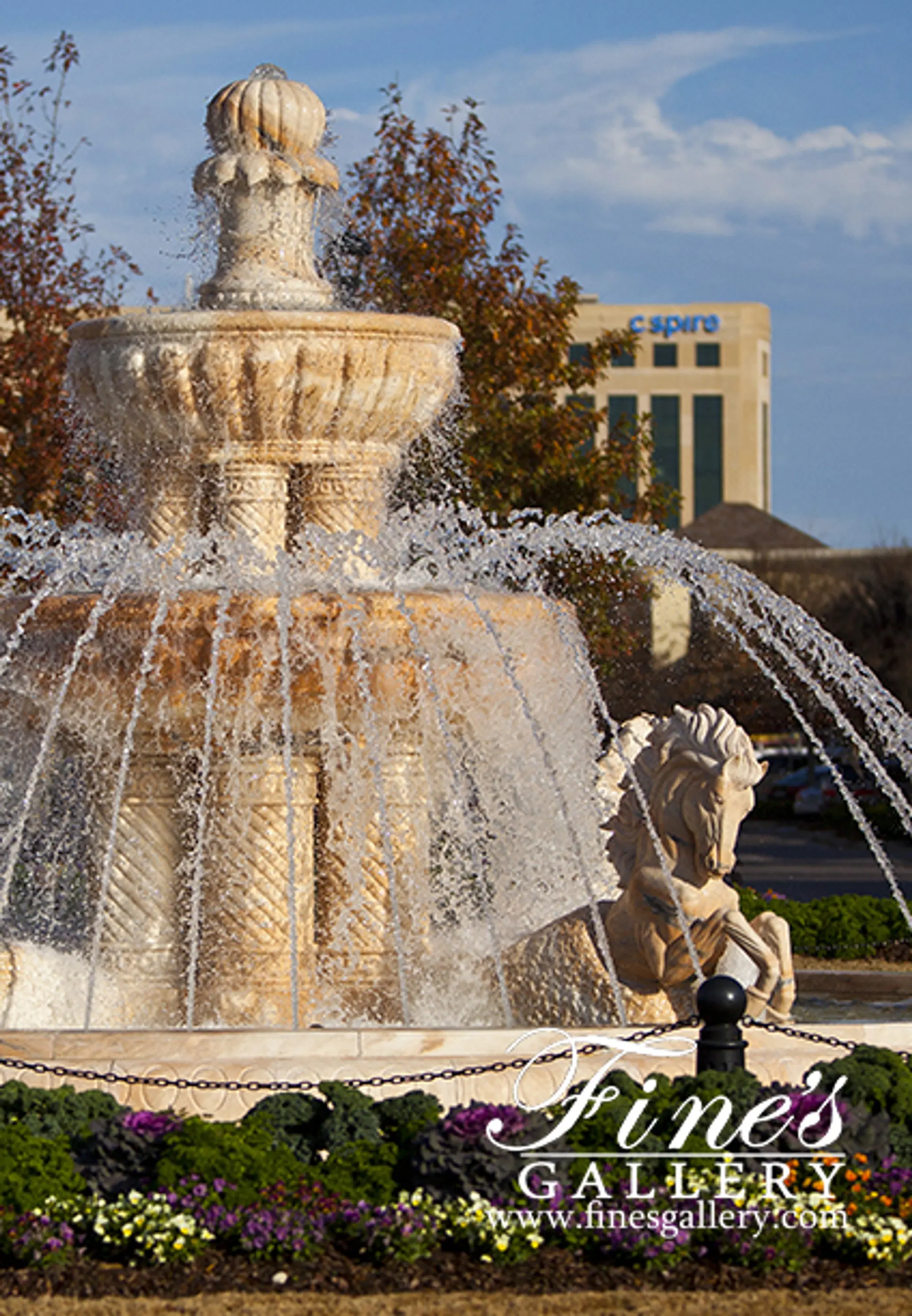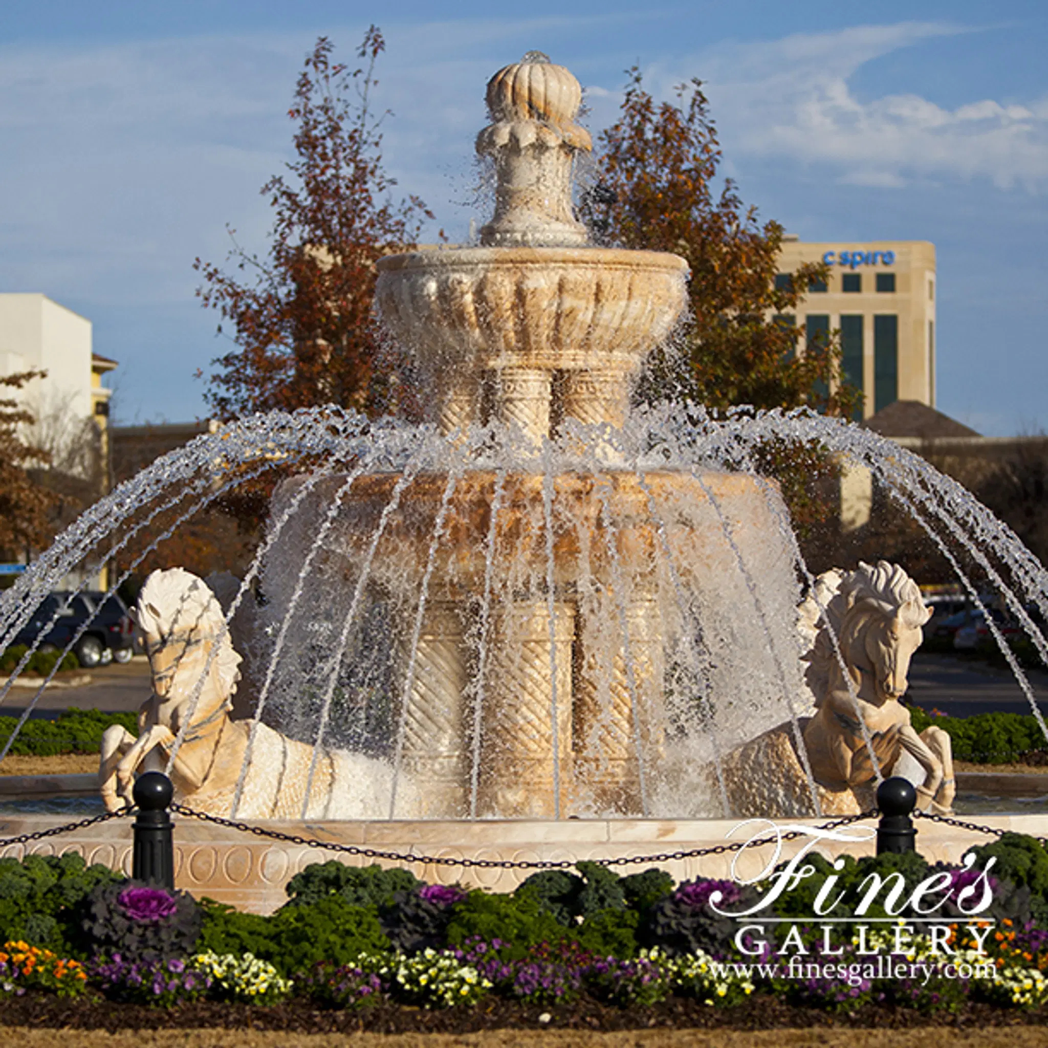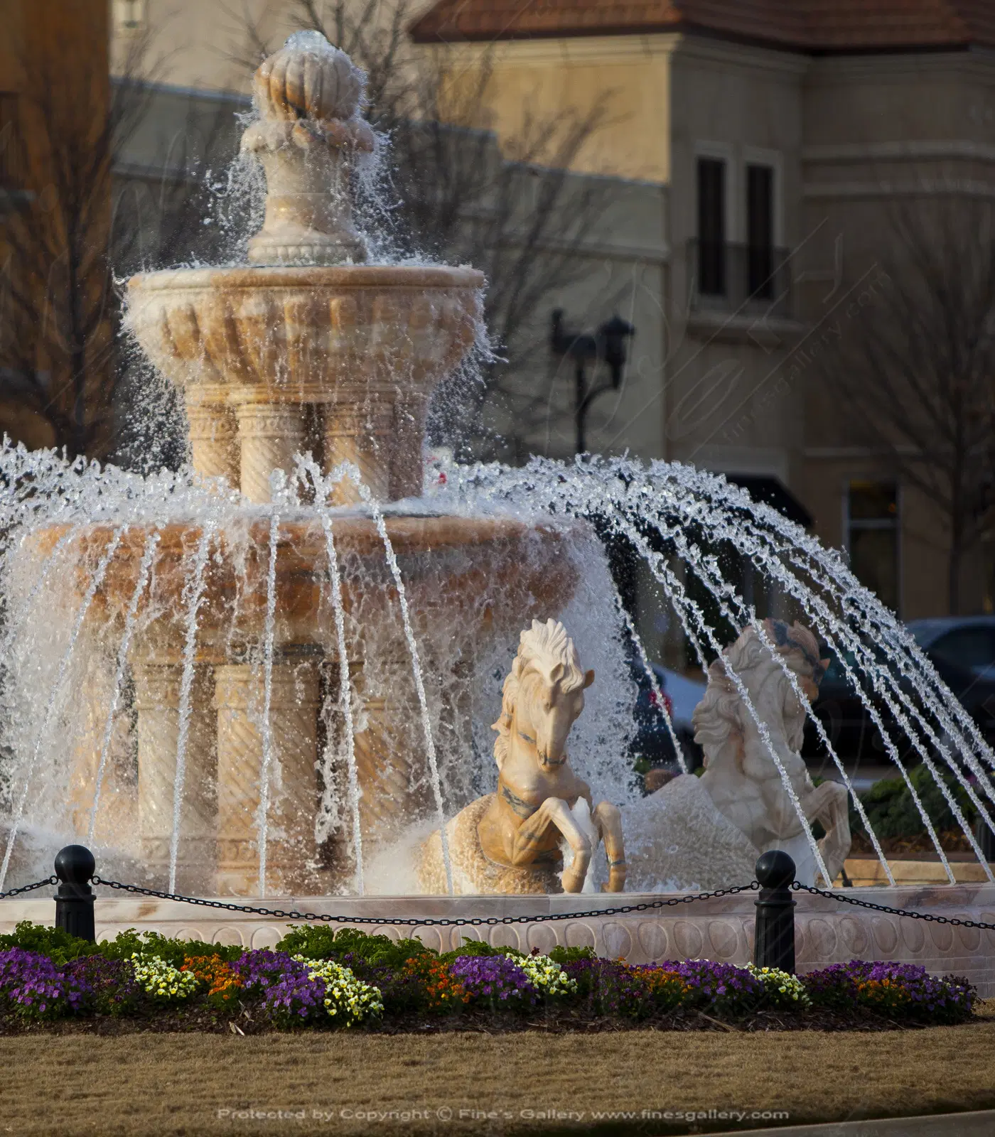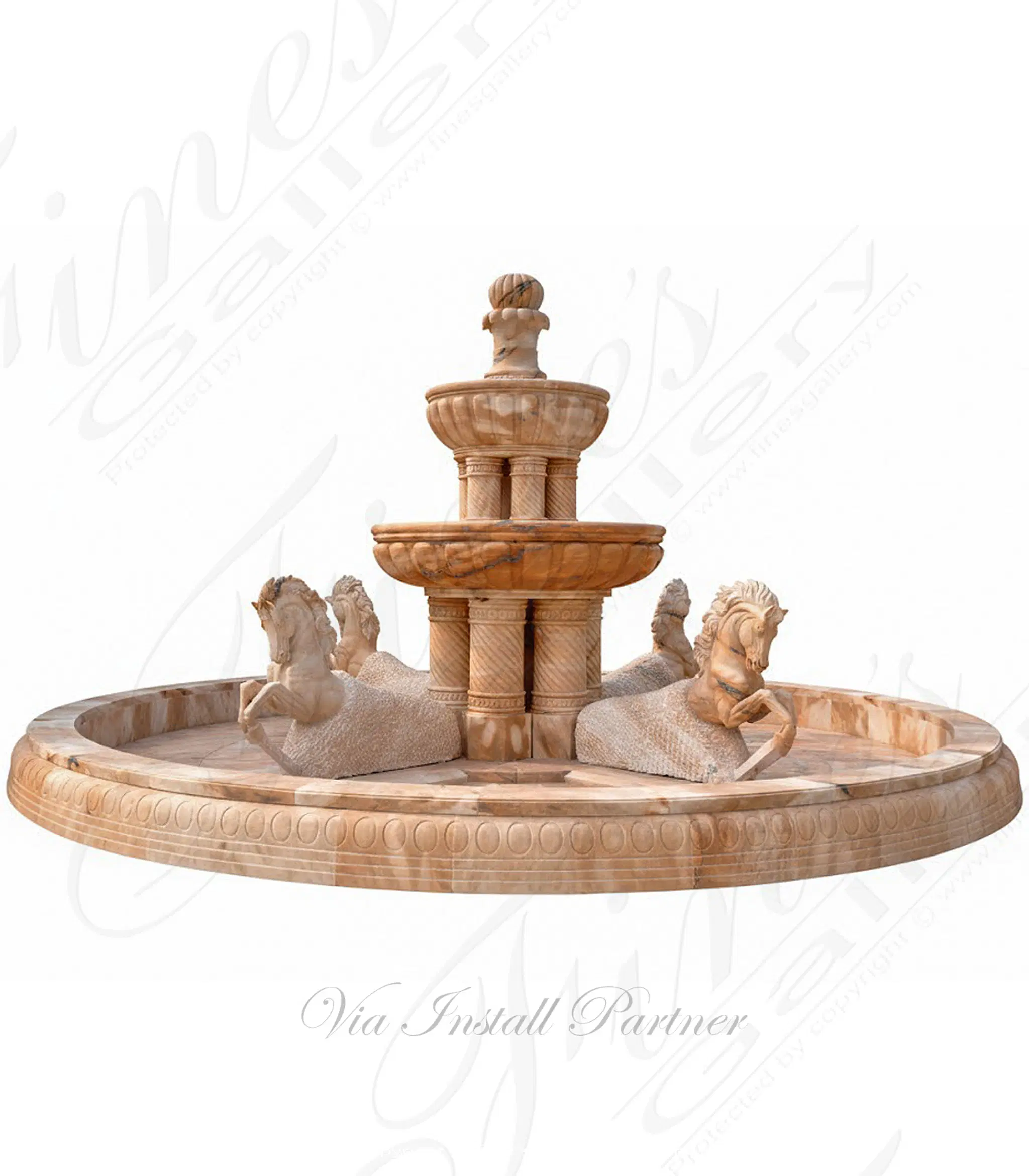 Rearing Horses Grecian Marble Fountain in a stunning pink colored rosetta marble. Create a grand entrance to your estate with this spectacular marble fountain featuring a double tiered design with multiple columns and horse statuettes. Available in white