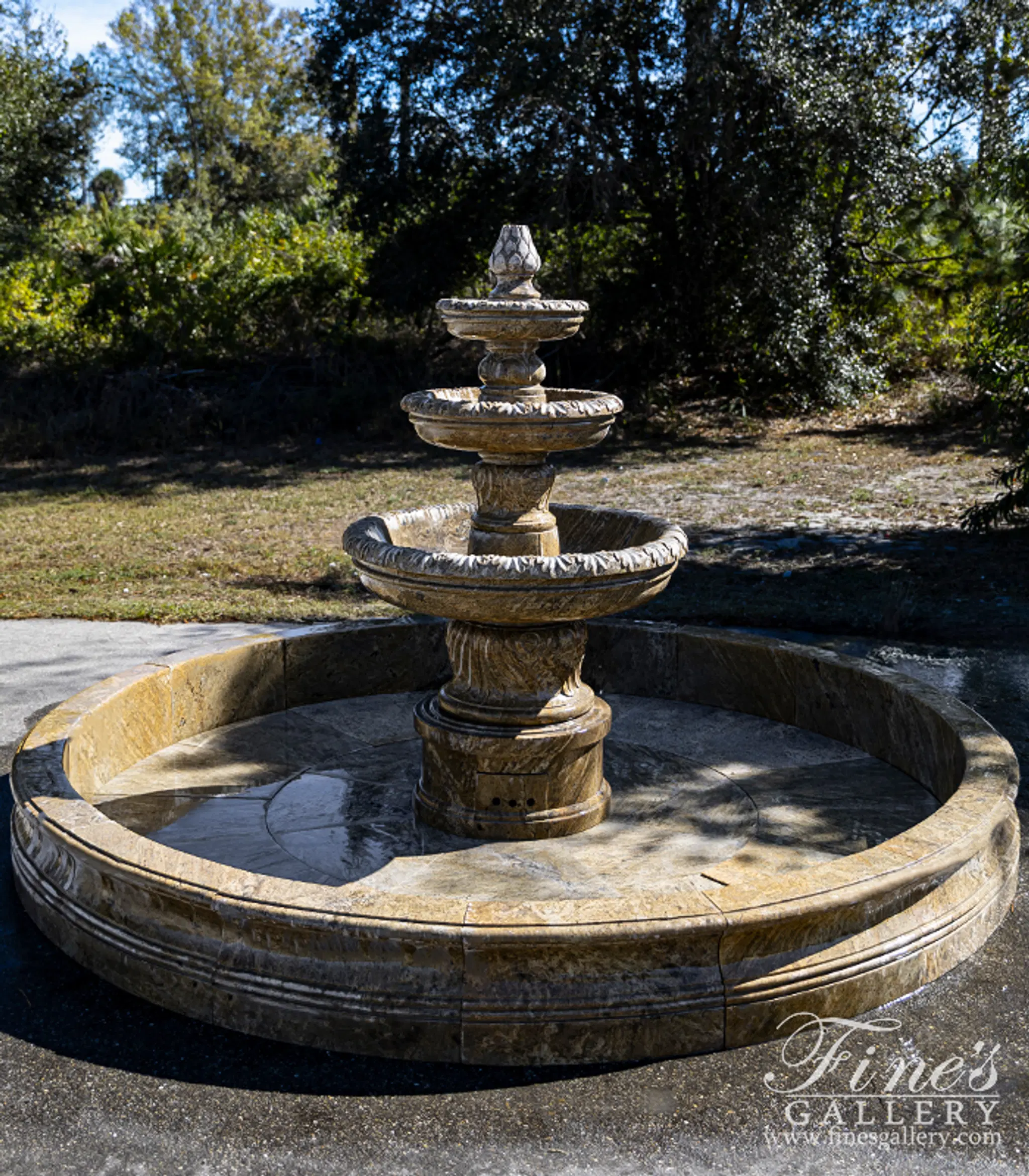 144" Diameter Traditional Acanthus Leaf Detail Fountain in Antique Gold Granite. This magnificent motor court fountain features stunning acanthus leaf detailing and an impressive 144" diameter. Crafted from premium antique gold granite , it creates an awe-inspiring focal point for any luxury property. Producing a spectacular waterfall effect both day and night. Enjoy turnkey national delivery and professional installation from Fine's Gallery & install partners, the world leader in custom marble and bronze designs.