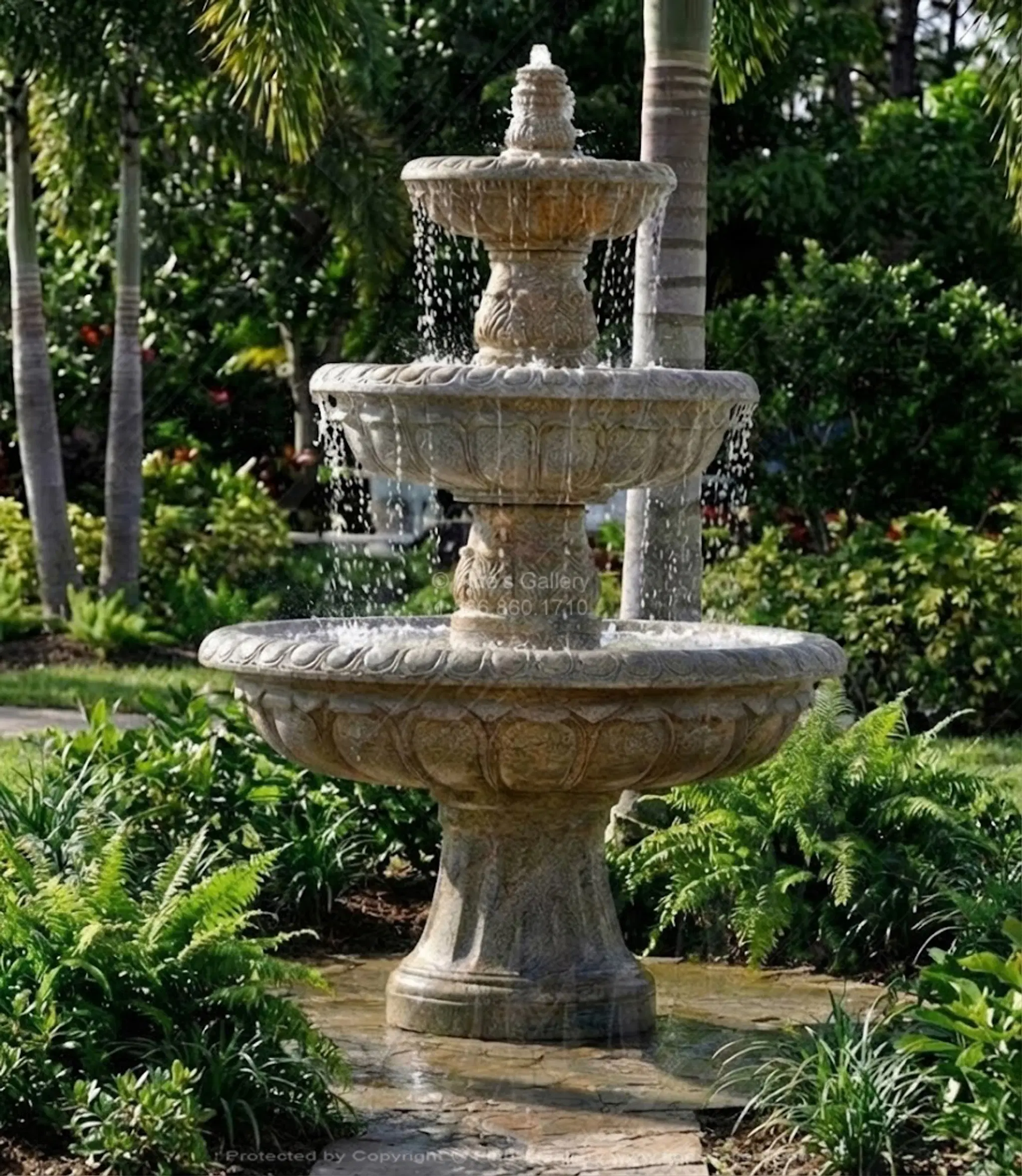 Classic Granite Garden Fountain XL - A carved granite outdoor water fountain, this stunning piece is very detailed and scaled impressively at just shy of 9 feet tall and 6 feet in diameter. Includes accanthus leaf with egg and dart detail.