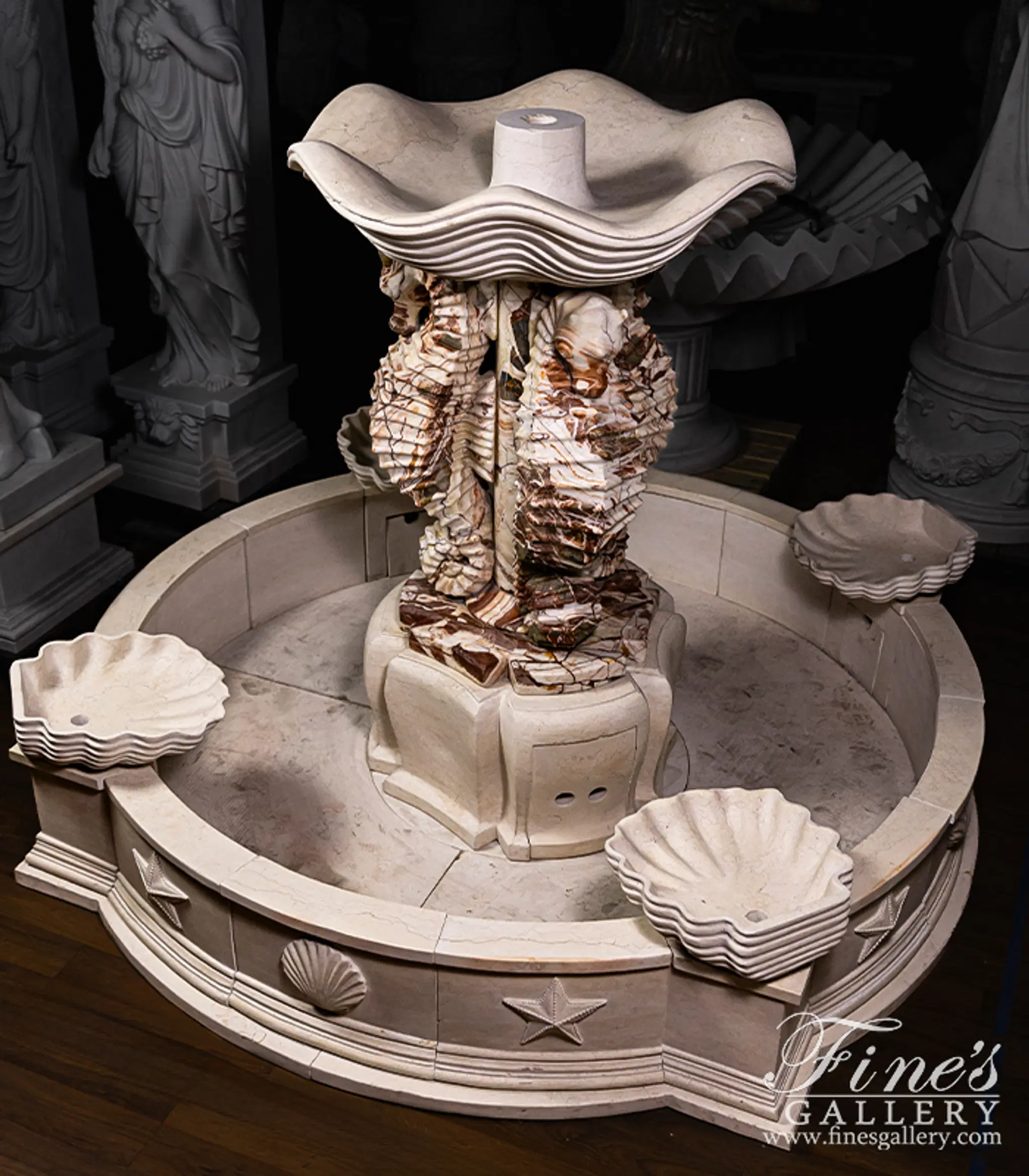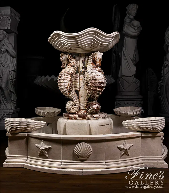 Exquisite Seahorse Marble Fountain with Two-Tone Red, White and Cream Exotic Marble featuring Multi-Tier Water Feature. This stunning decorative fountain showcases intricate craftsmanship with water cascading from the top shell tier and four smaller shells for dynamic water movement. Designed by Fine's Gallery of Bonita Springs, this elegant outdoor water feature adds sophisticated charm to gardens, patios, or luxury landscapes. Model MF-1540.