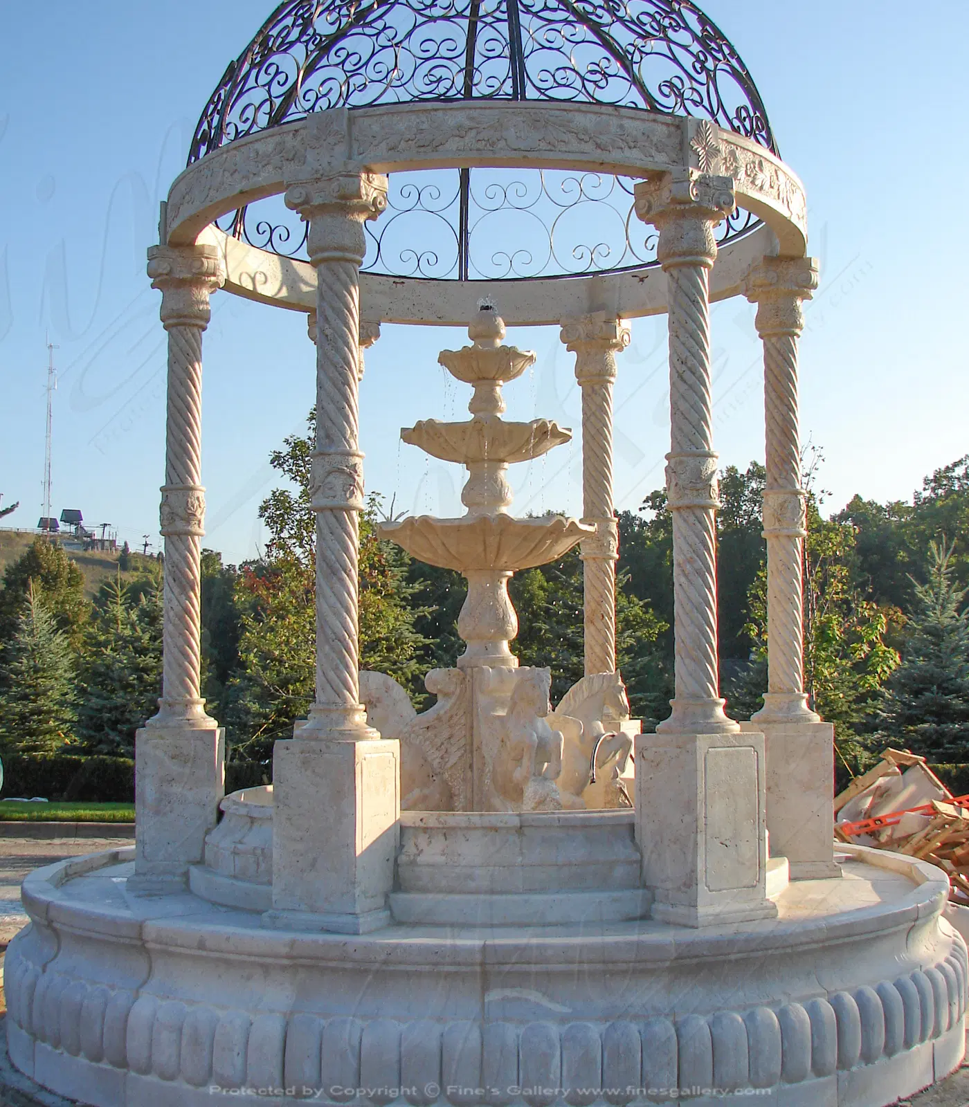 This impressive old world Extra Large Outdoor Fountain in Antique Marble includes three tiered fountain with rearing horses at the base, a complete gazebo structure all set up on a raised circular natural marble bed. Available in granite.