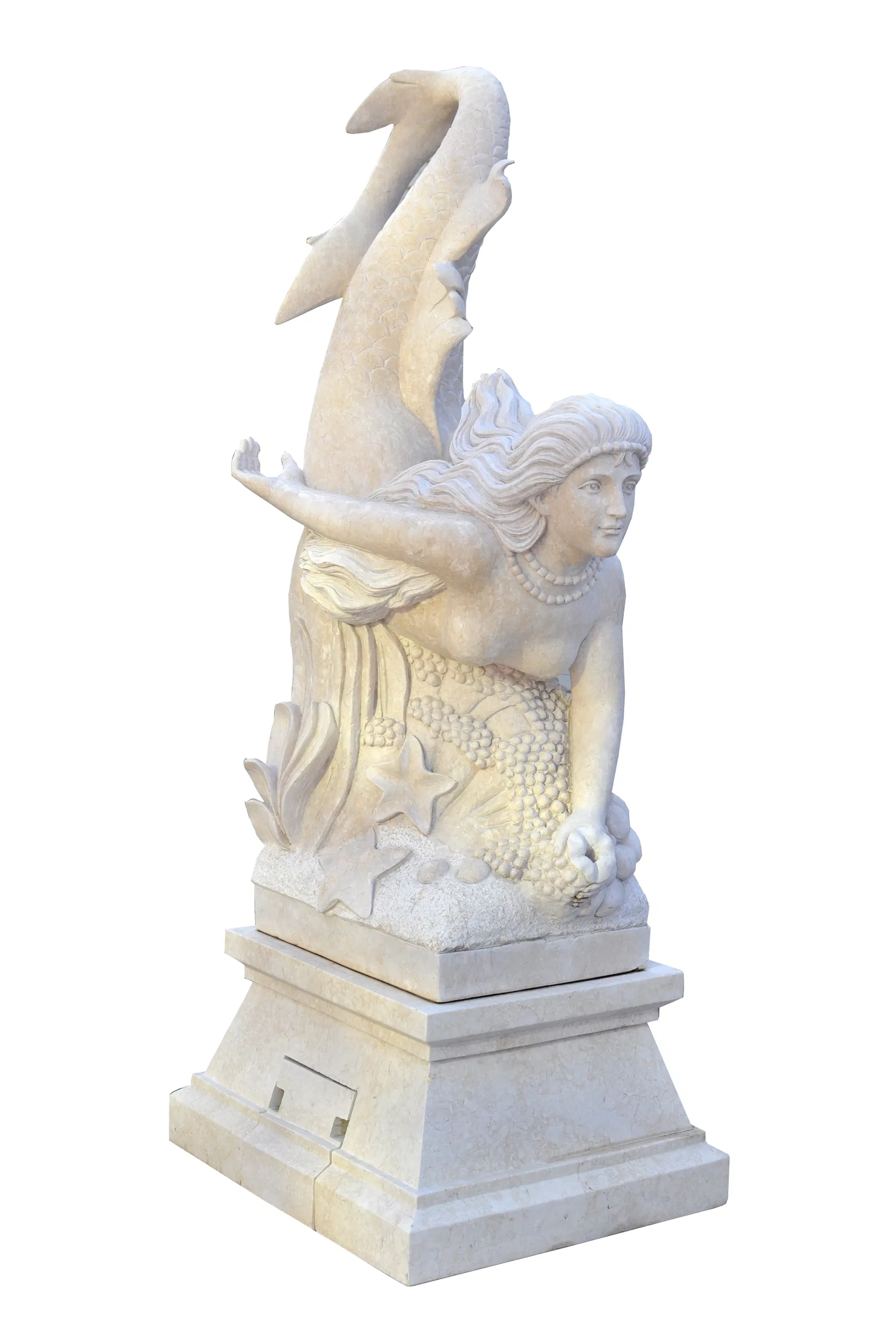 Marble Mermaid Fountain - Light Cream Outdoor Water Feature with Pool - Elegant Garden Decor - MF-1558