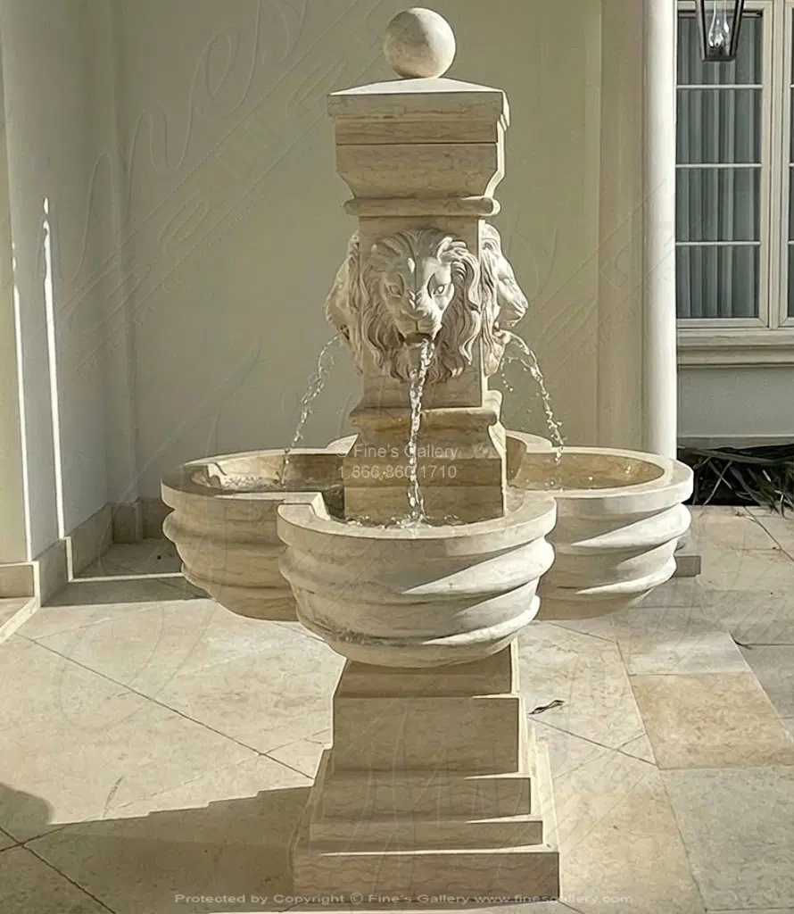 Majestic Lions Cream Marble Garden Fountain. Light cream color, hand carved marble four sided lion head fountain feature. Euro inspired tuscan italian villa style fits perfectly in your luxurious garden setting.