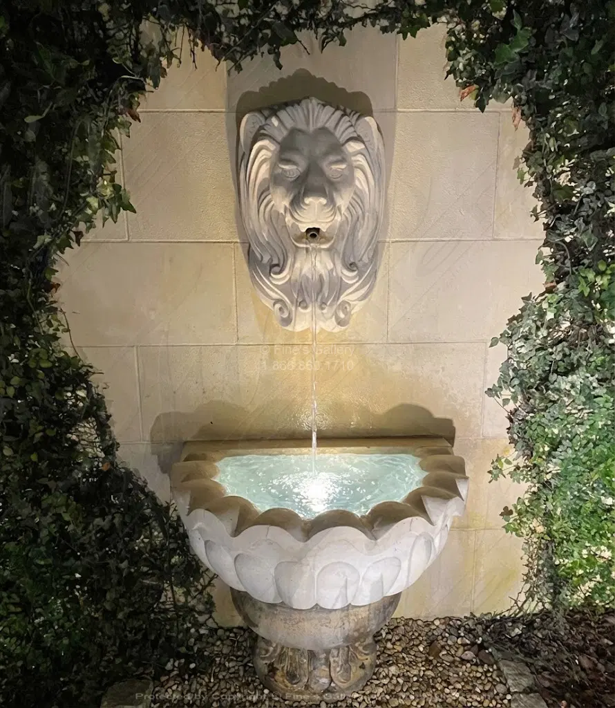 Majestic Marble Lion Wall Mount carved from solid cream marble. Lion head measures 21 in x 14 in x 11. Bowl measures 32 in x 18.75 in x 21 in.