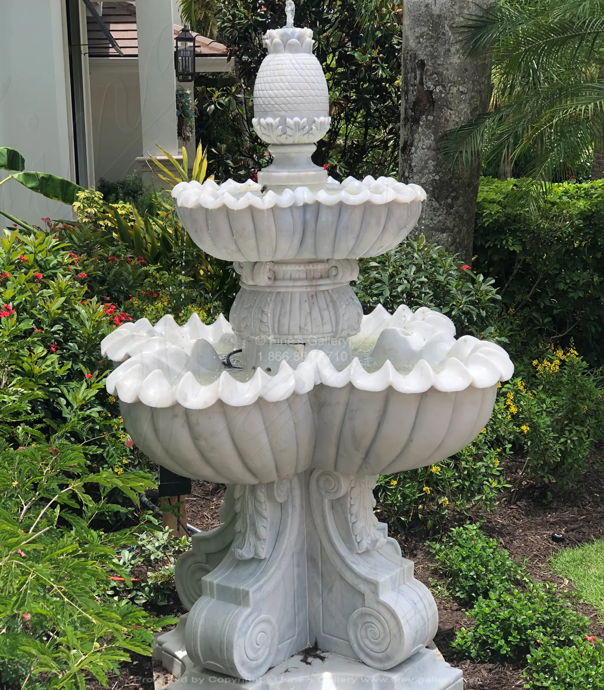 Luxurious Two Tiered White Marble Fountain. Features include a pineapple finial, acanthus leaf scroll work, fluted bowls and scalloped edges.