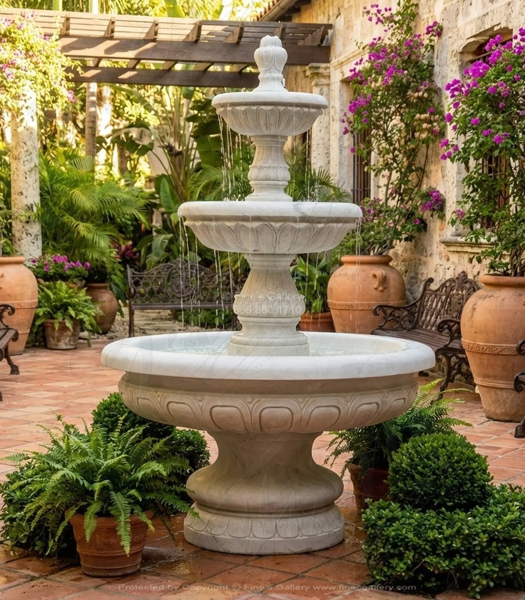 Tuscan Outdoor Marble Fountain. This solid white marble fountain is carved from a beautiful light white marble with light gray veins. At just over eight feet tall this fountain is perfect for a circle drive or garden application.