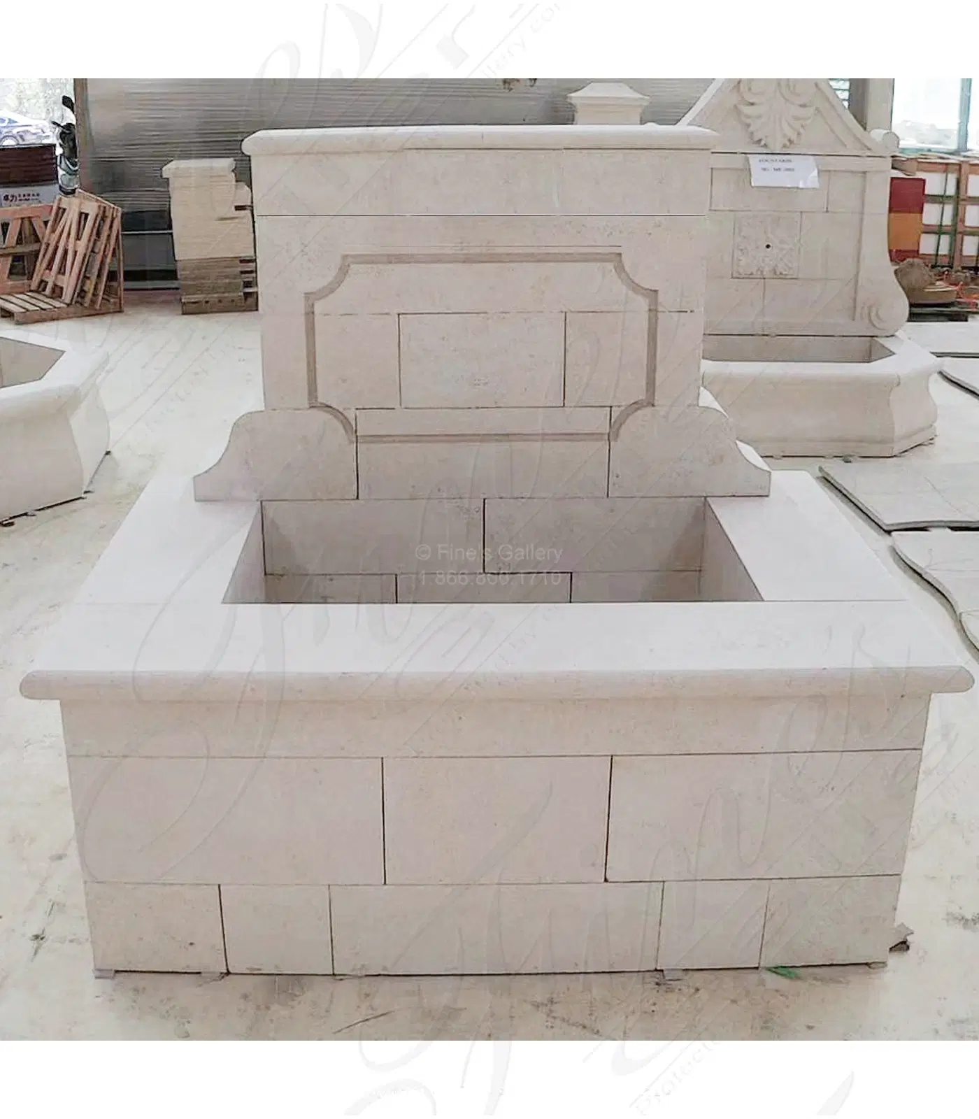 French Limestone Countryside Wall Fountain quarried in the South of France! Old world masonry brick style assembly cut from a french quarried limestone. This authentic wall fountain is installed by a stone mason, call us for assistance today.