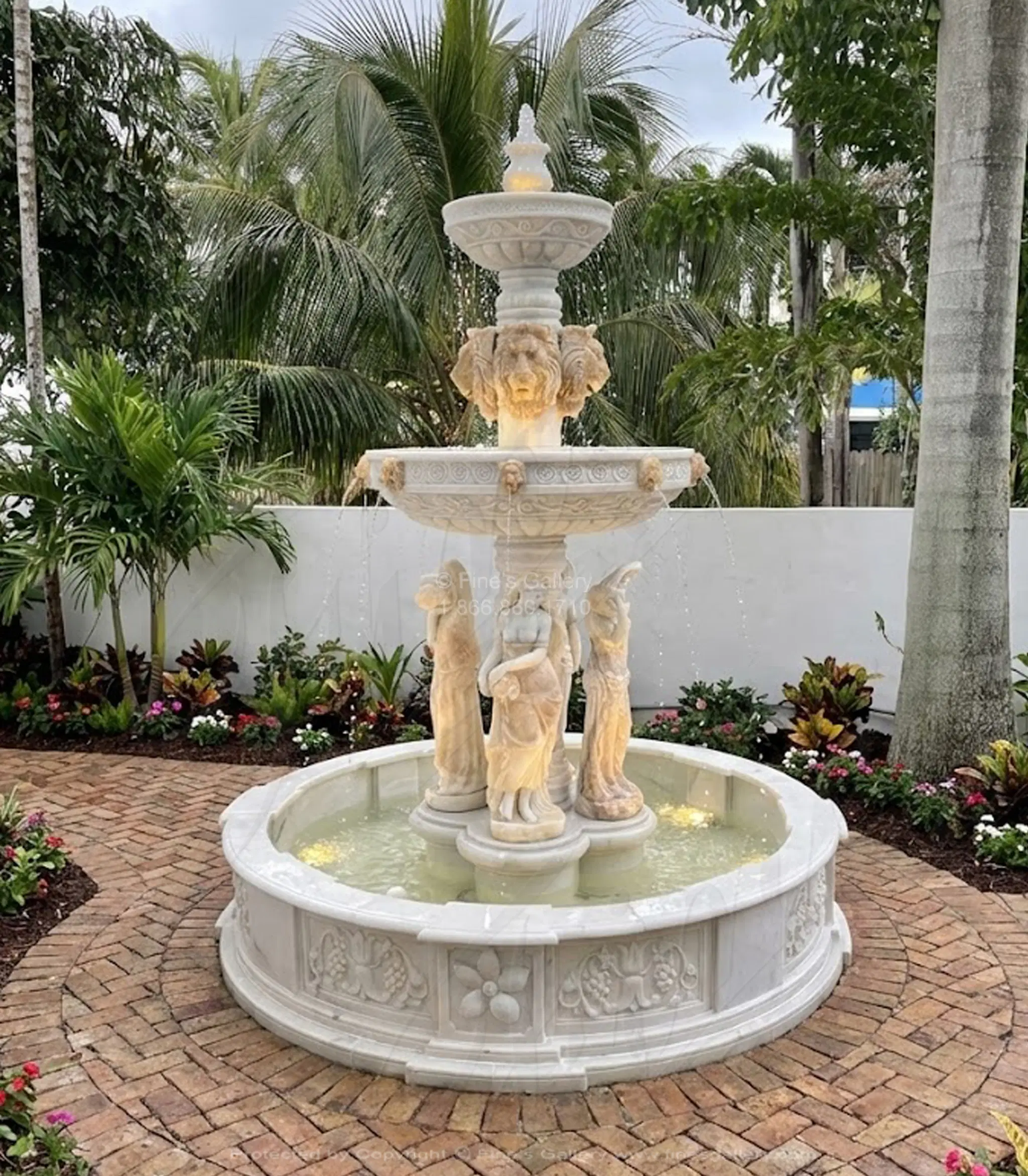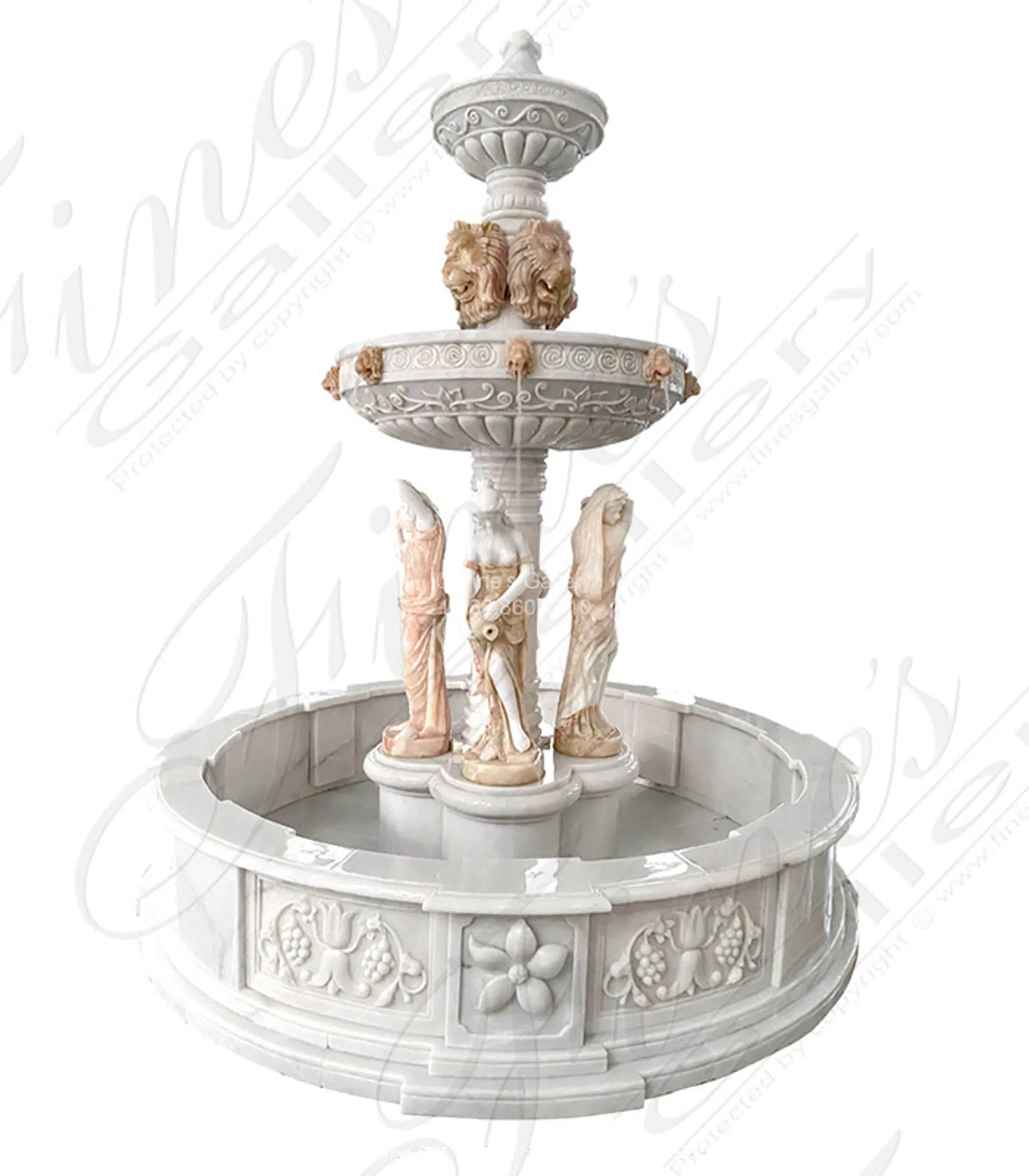 Multicolored Marble and Onyx Greco Roman Fountain featuring lion heads and maidens. Designed at a compact size of 100 inches round. Customize your natural stone fountain feature today. 1.866.860.1710