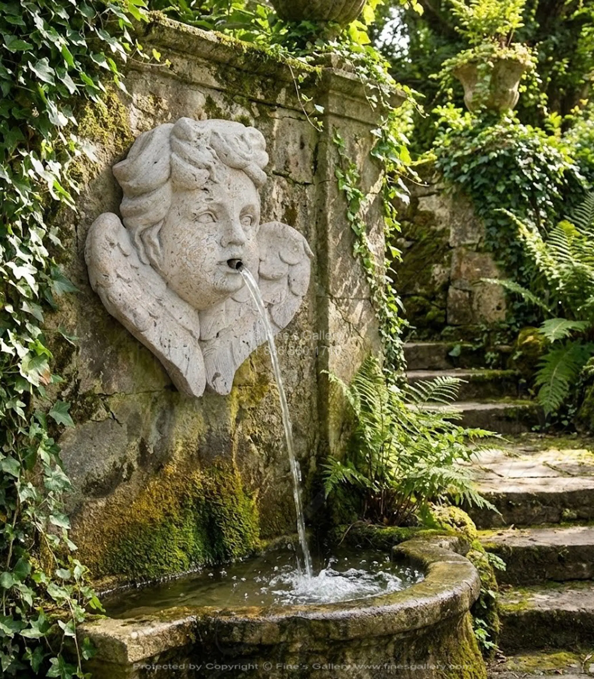 Cherub w/Wings Wall Mount Fountain in Travertine. This adorable hand carved cherub wall mount fountain is awe inspiring. Carved from a hand picked light beige travertine.
