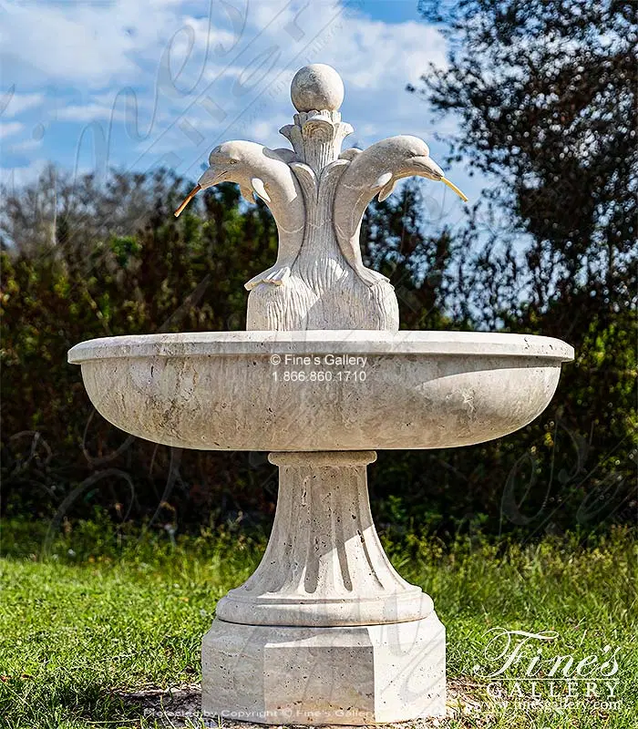 Dolphin Themed Fountain in Hand Carved Light Travertine Stone. Features include three spouting dolphins, a 60 Inch diameter tier, a 72 Inch total height. Optional catch basin and commercial grade stainless water jets are available, sold separately.