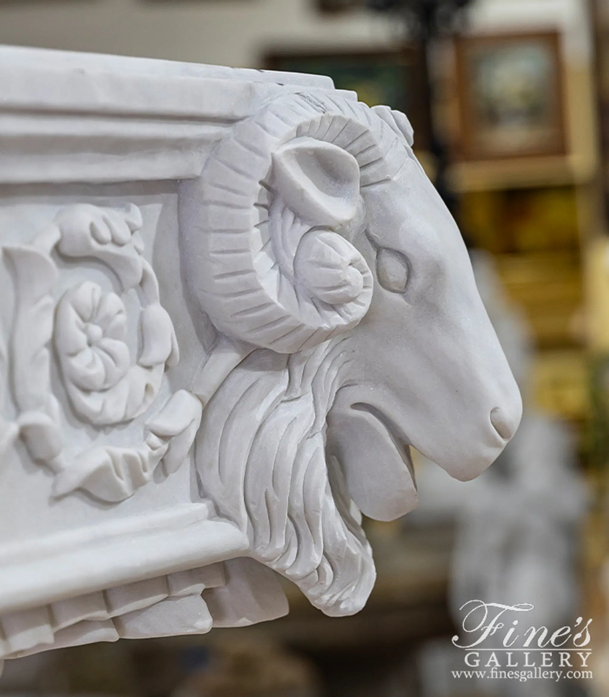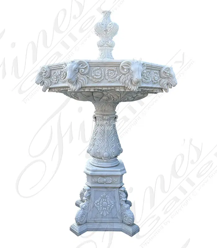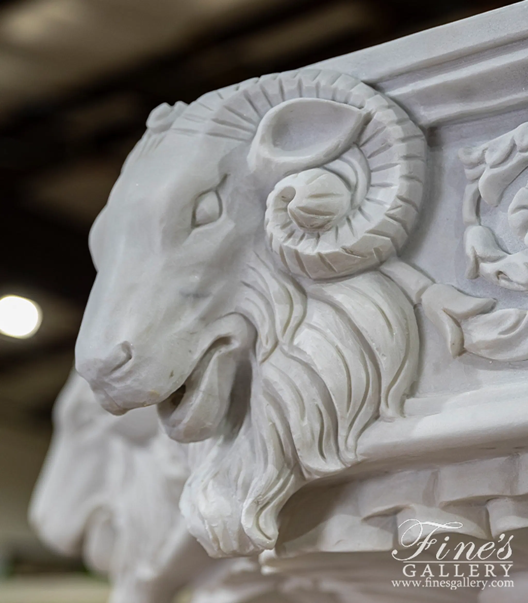 Ornate Italian Countryside Fountain in Statuary Marble. This 108 Inch tall masterpiece features hand carved rams and elaborate deep scrollwork throughout the entire structure. All carved from a hand selected statuary marble. A rare and unusual fountain. Optional pool basin and stainless water jets available sold separately.