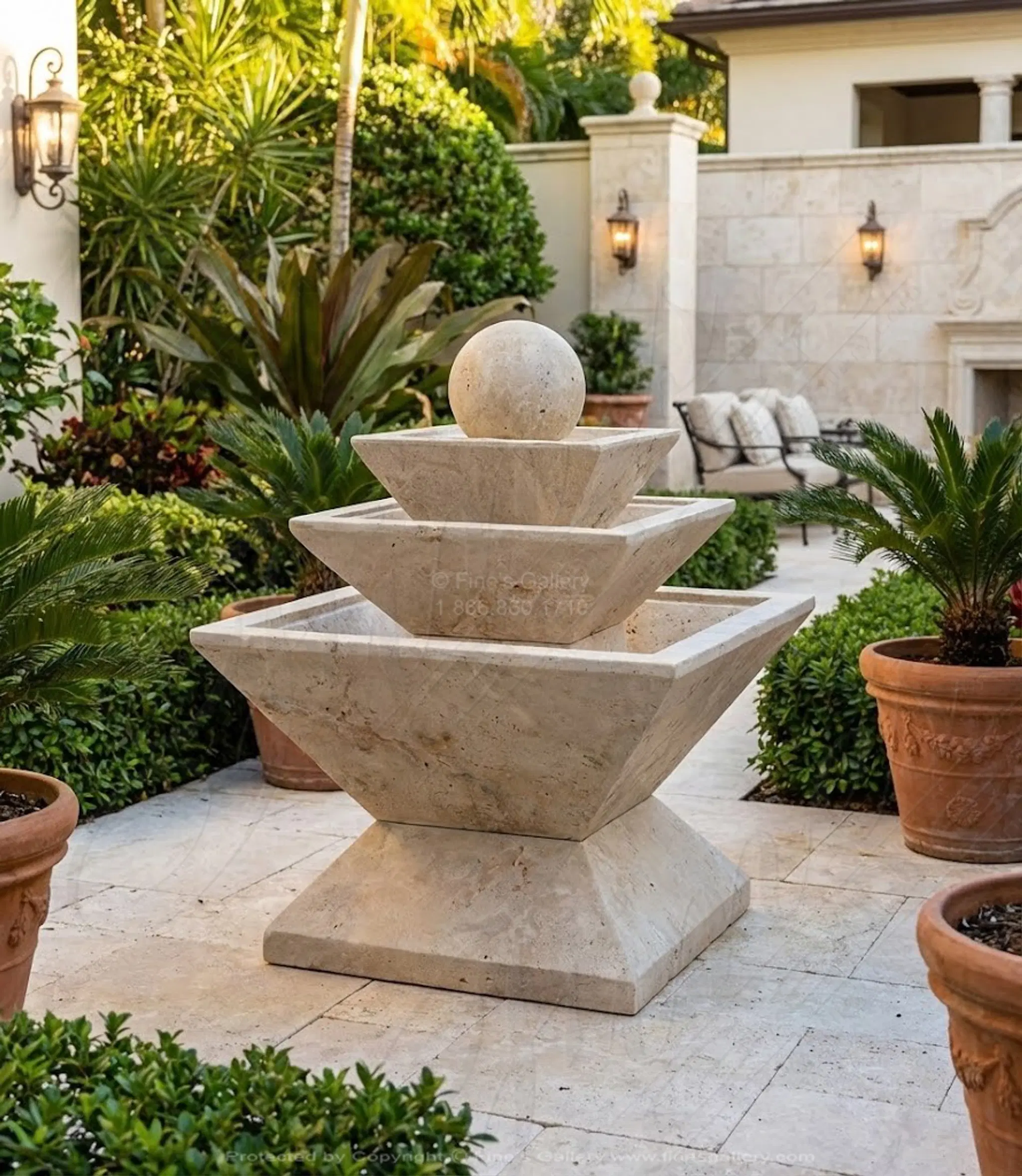 Contemporary Sphere Fountain in Light Travertine.