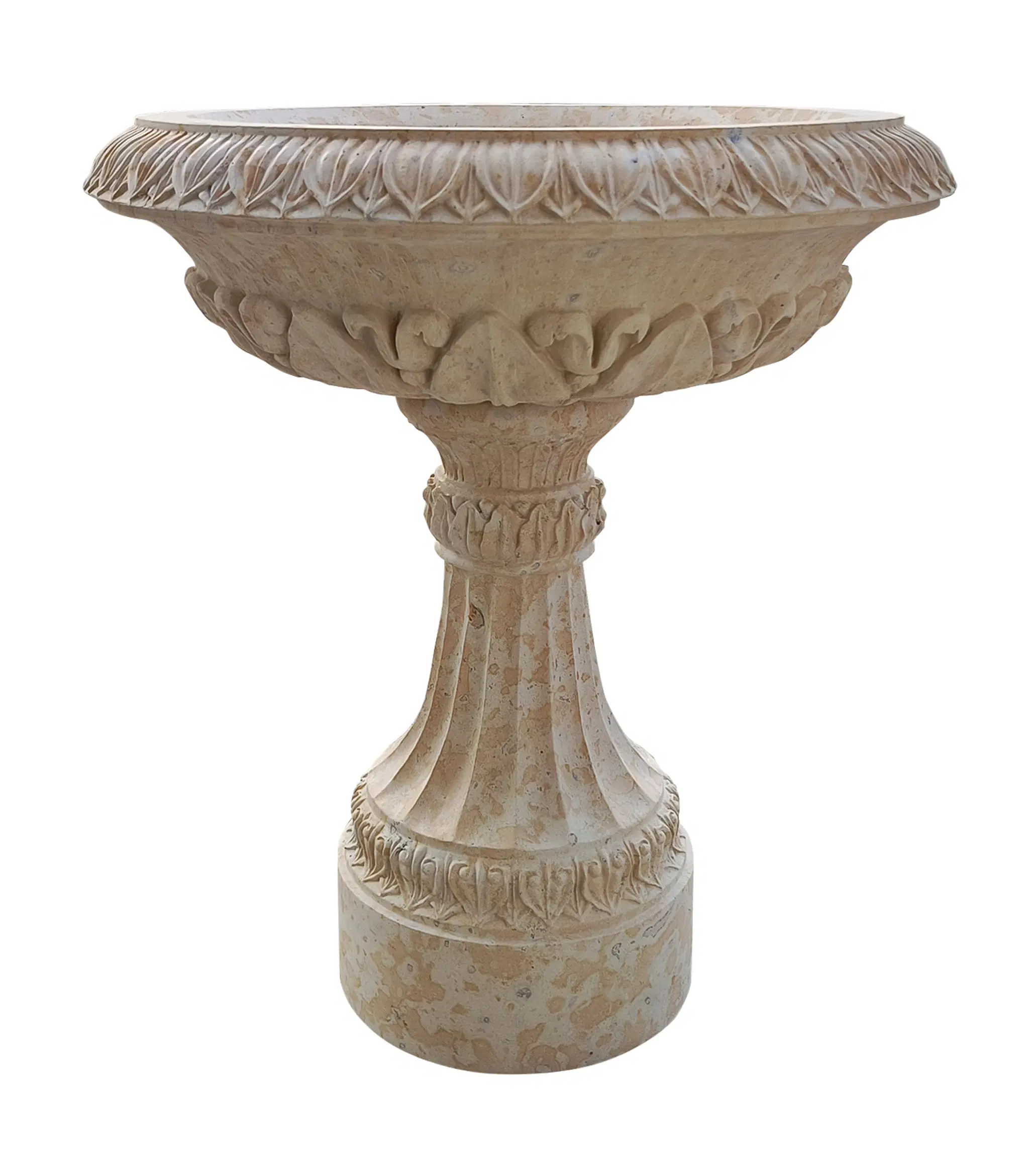 Single Tiered Fountain in a hand picked, hand carved miele verona limestone. Commonly used as a baptismal font or birdbath in addition to a fountain.