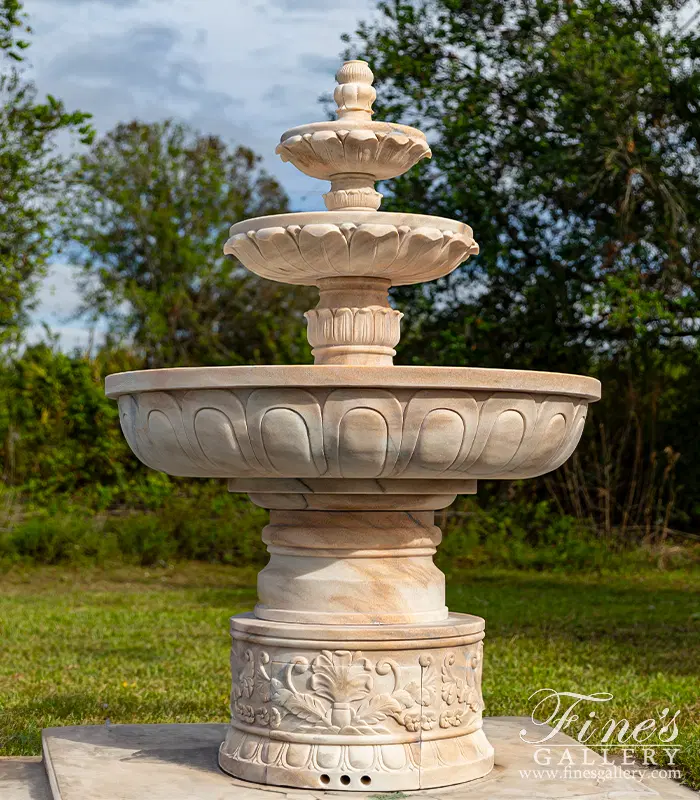 Charming Three Tiered Fountain with Ornate Floral Base in Rosetta Marble. Set includes 64 inch x 55 inch x 55 inch three tiered marble fountain and 16 inch x 30 inch highly ornate floral scrollwork marble pedestal with removable pump access door!