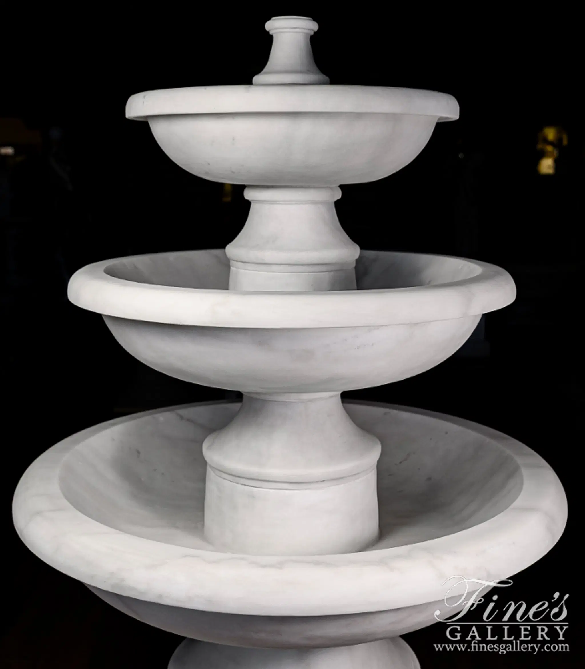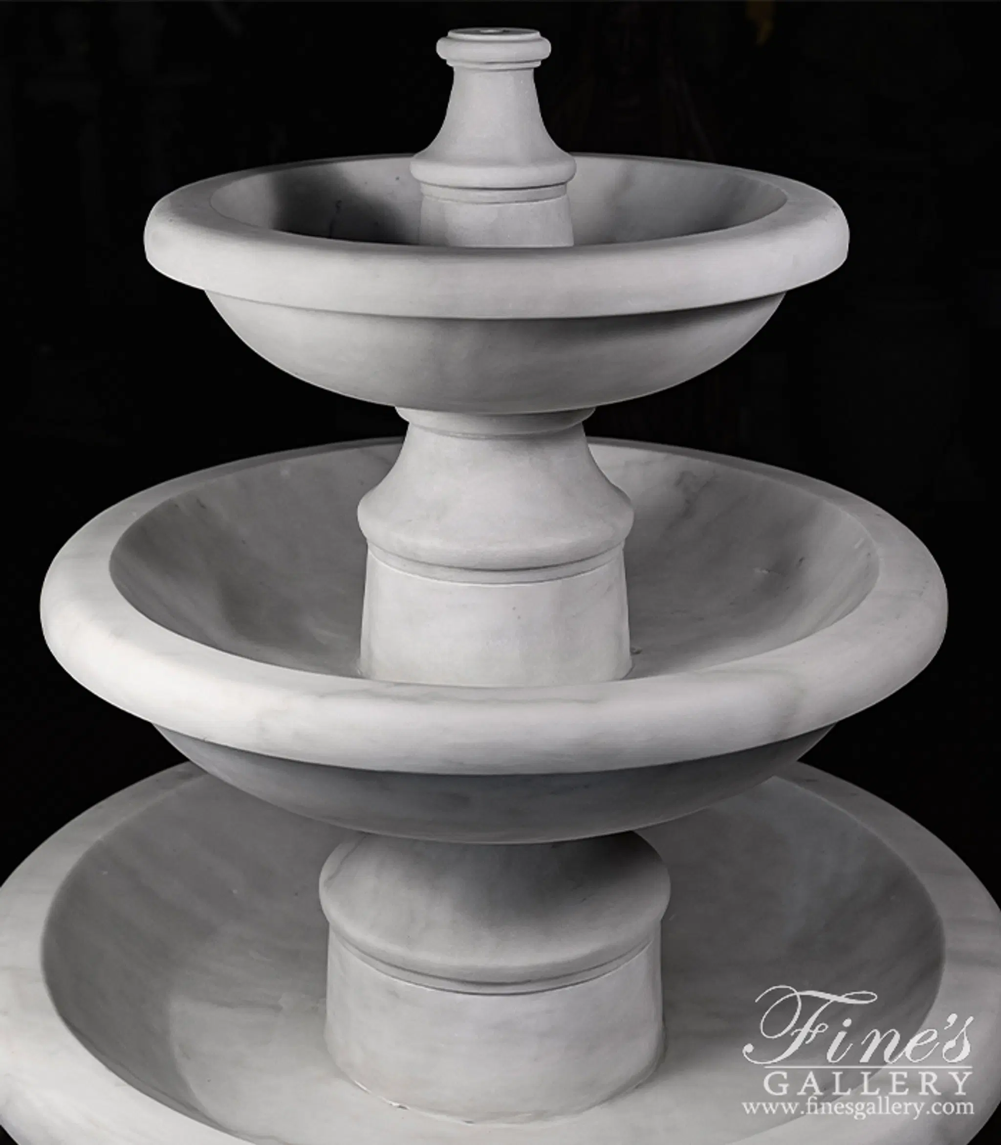 A Transitional Three Tiered Fountain in Statuary Marble. Carved from AAA grade hand picked Statuary Marble. 15" tall x 29" diameter hollow marble base available sold separately.