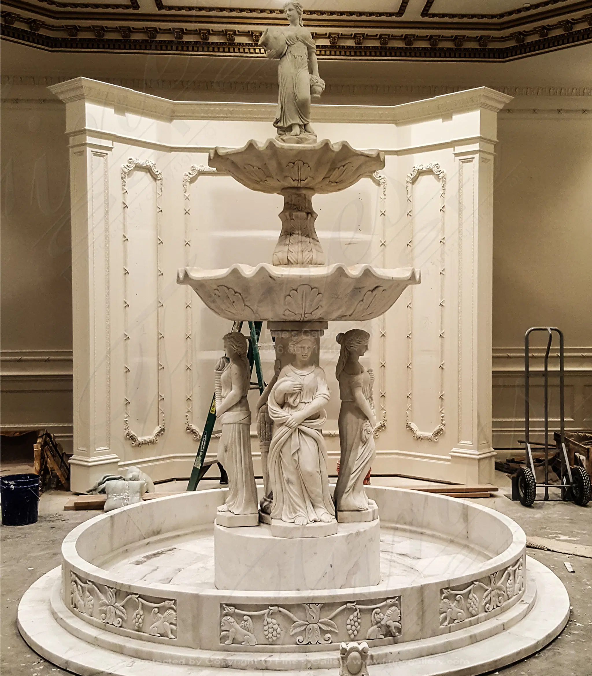 The Four Seasons Fountain carved from pure white marble. Featuring LED lighting. Installation located at a Northern NJ Castle! Four pristine grecian female statues are the focal point of this magnificent fountain feature.