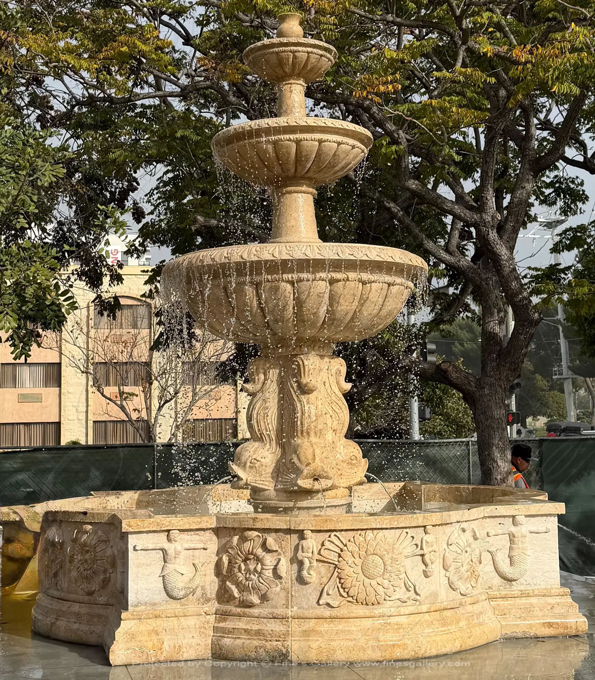 This charming Old World Italian Style Fountain is carved from gold travertine. Sea themed relief detail carved into pool wall.