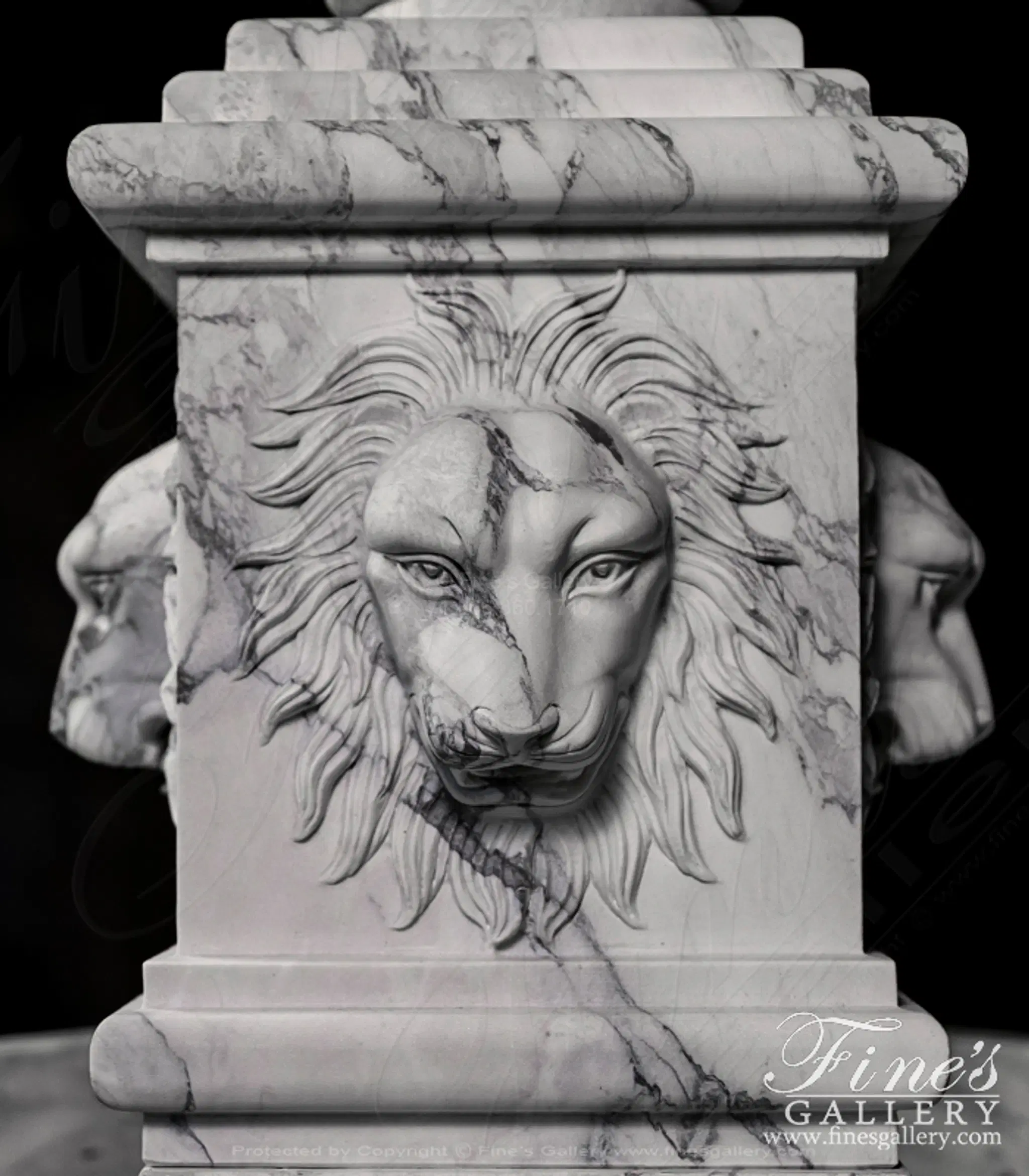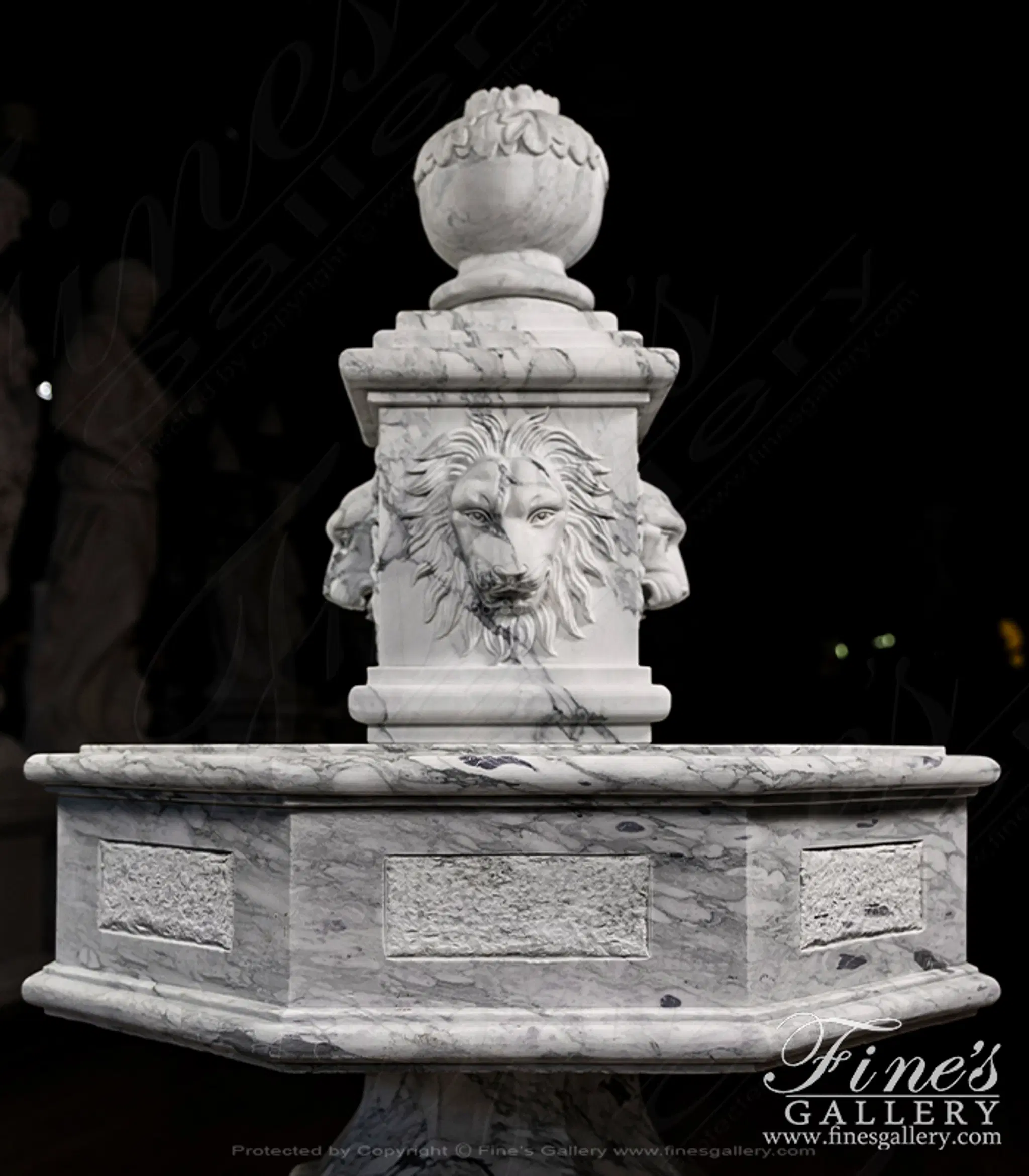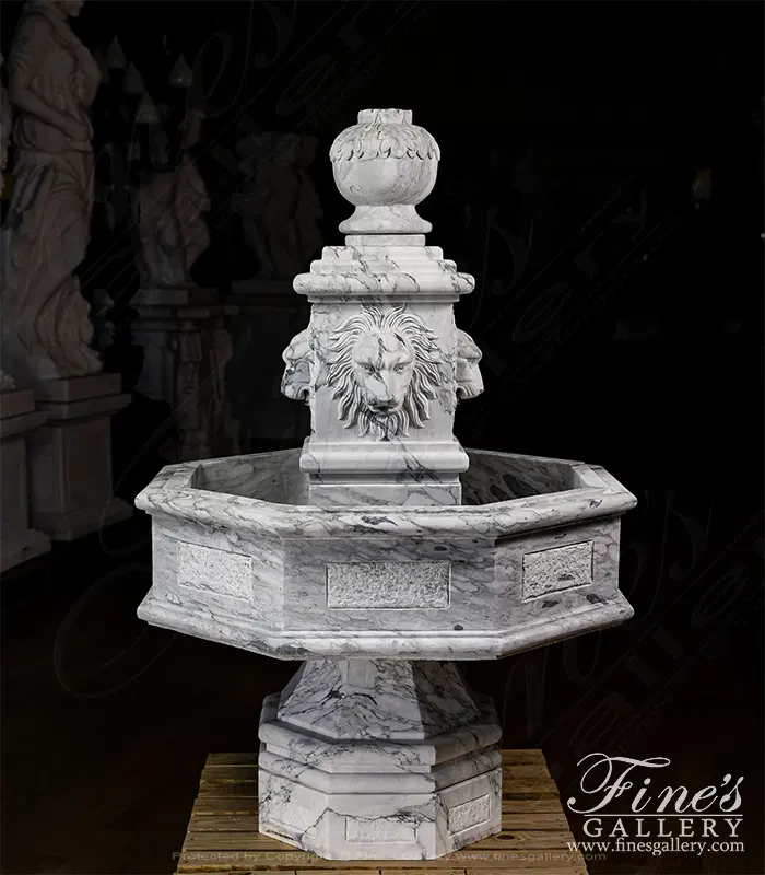 An octagonal shaped fountain carved from an exotic Arabascato marble. Features four lion heads and an acanthus leaf finial. Lion themed fountains are symbols of protection, strength, authority, and serving as public gathering places.