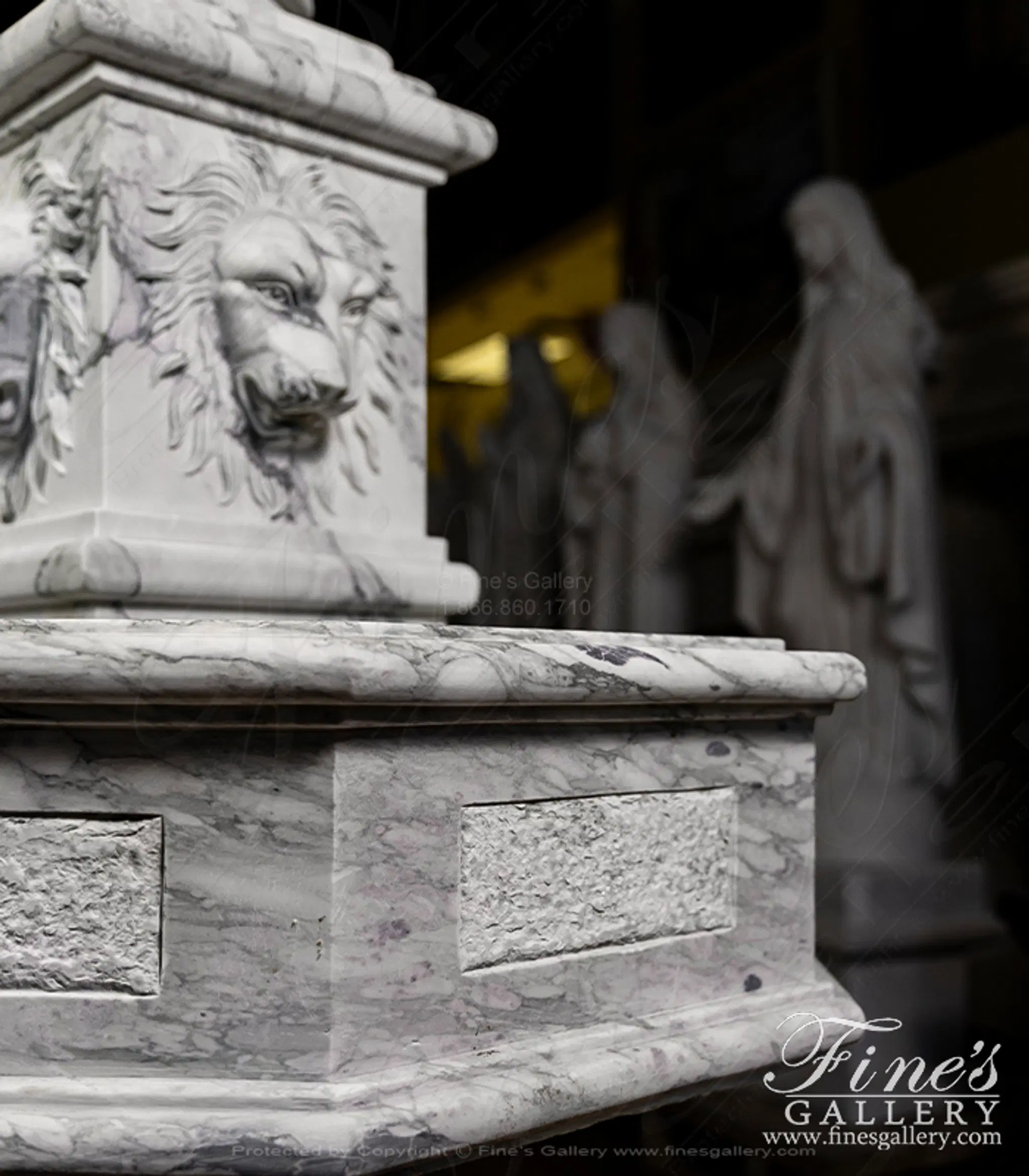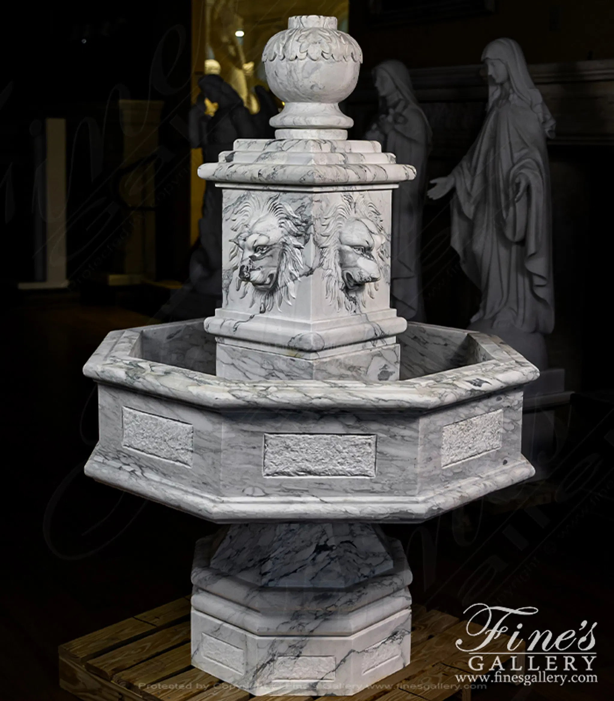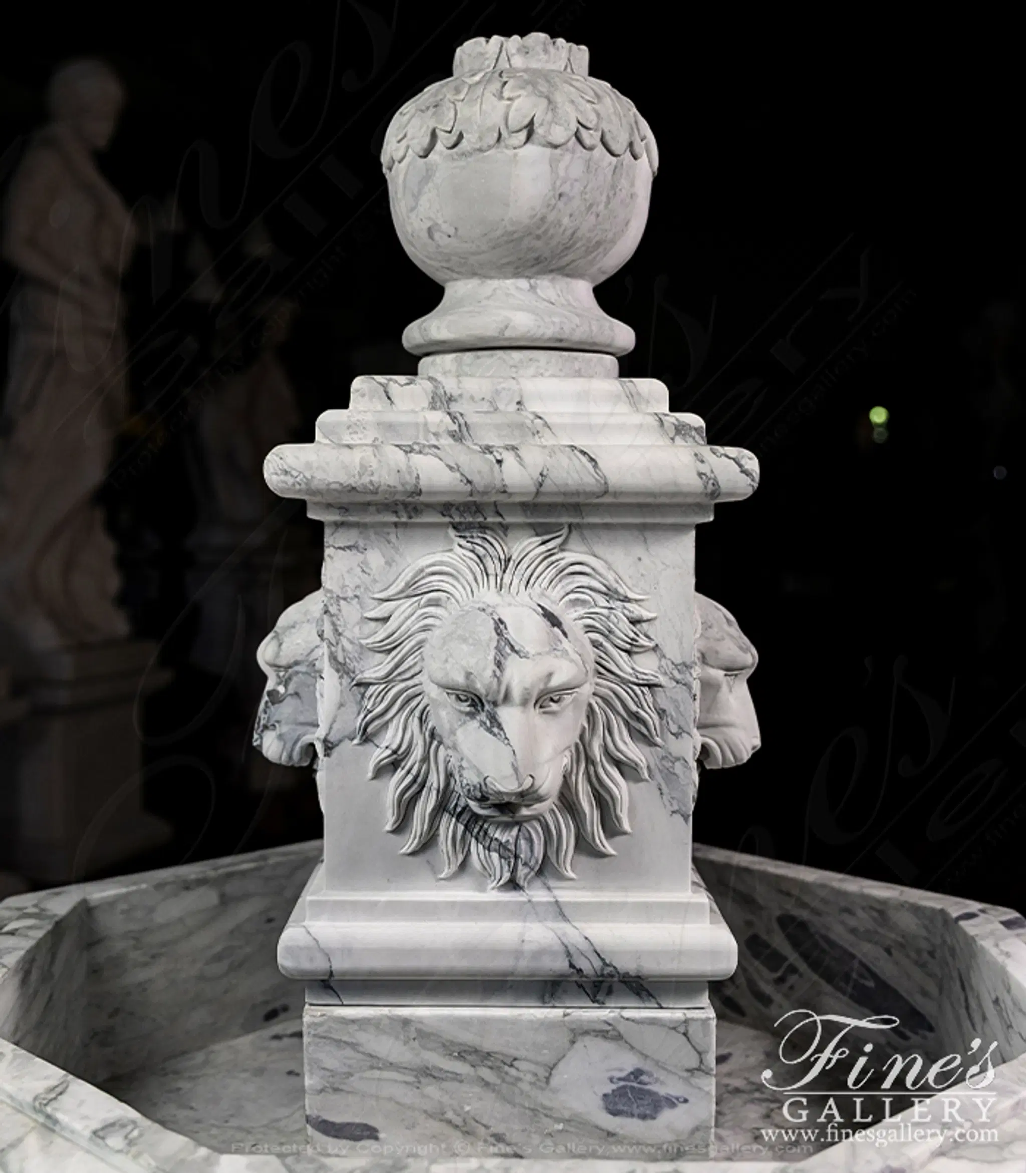 An octagonal shaped fountain carved from an exotic Arabascato marble. Features four lion heads and an acanthus leaf finial. Lion themed fountains are symbols of protection, strength, authority, and serving as public gathering places.