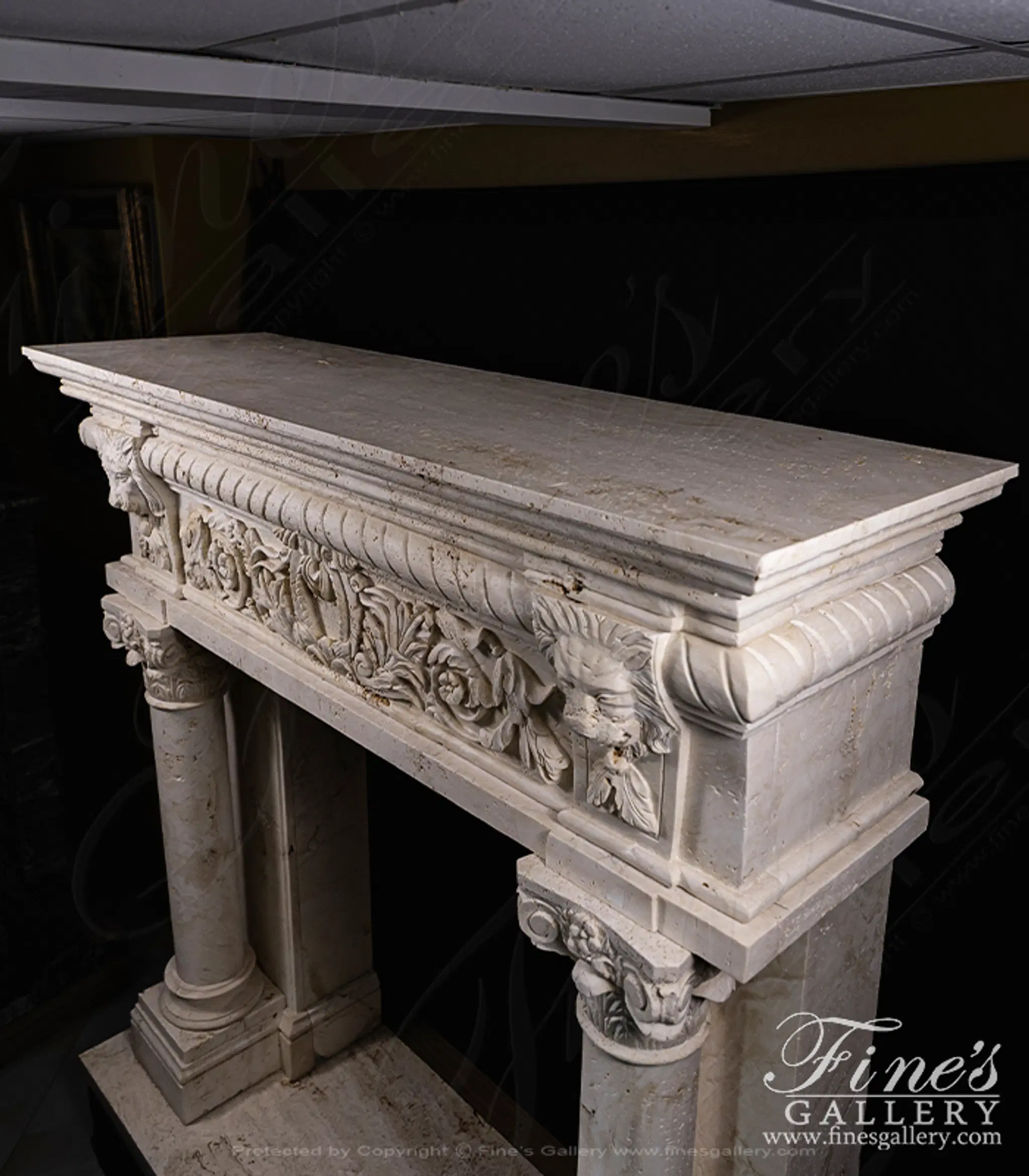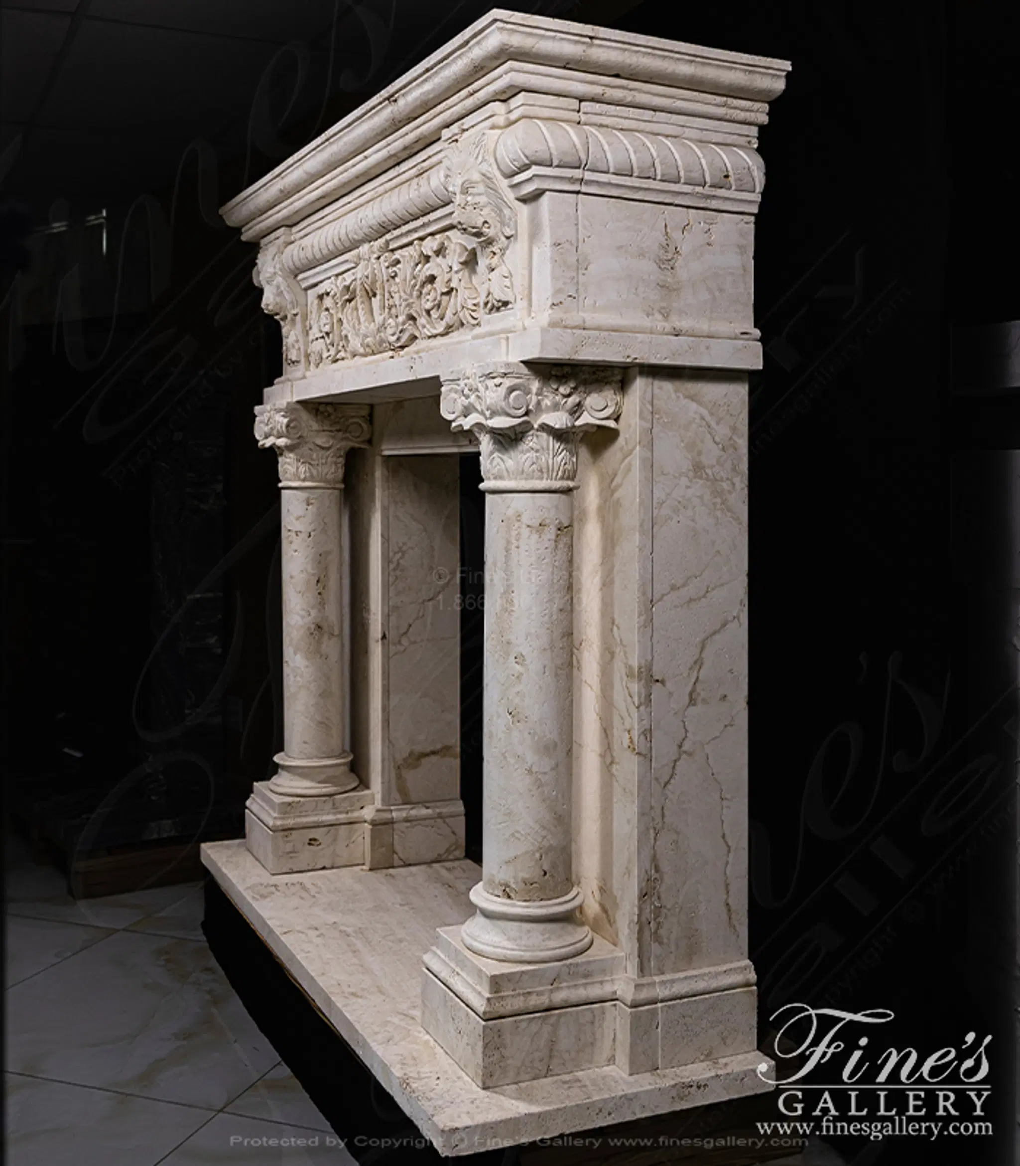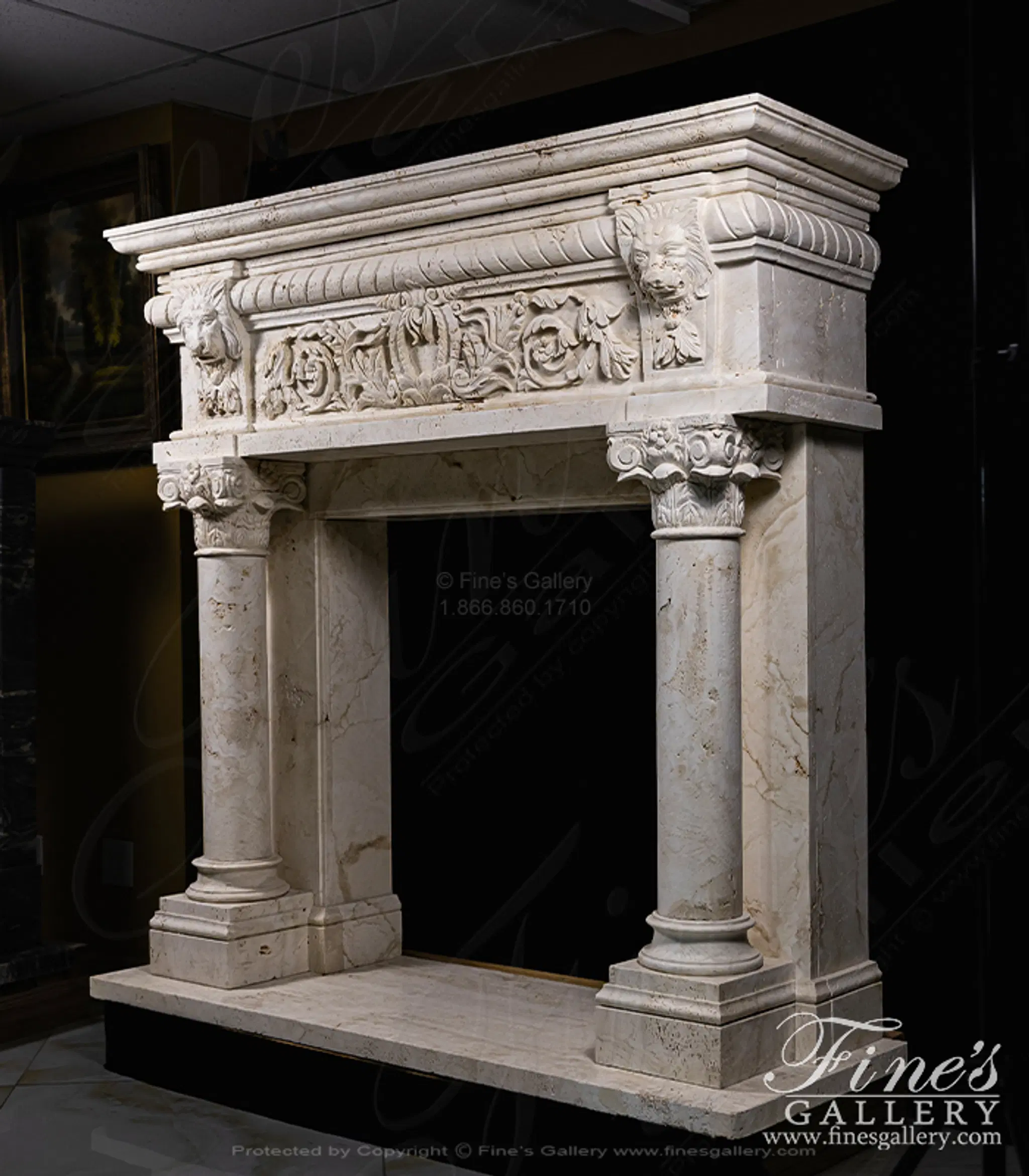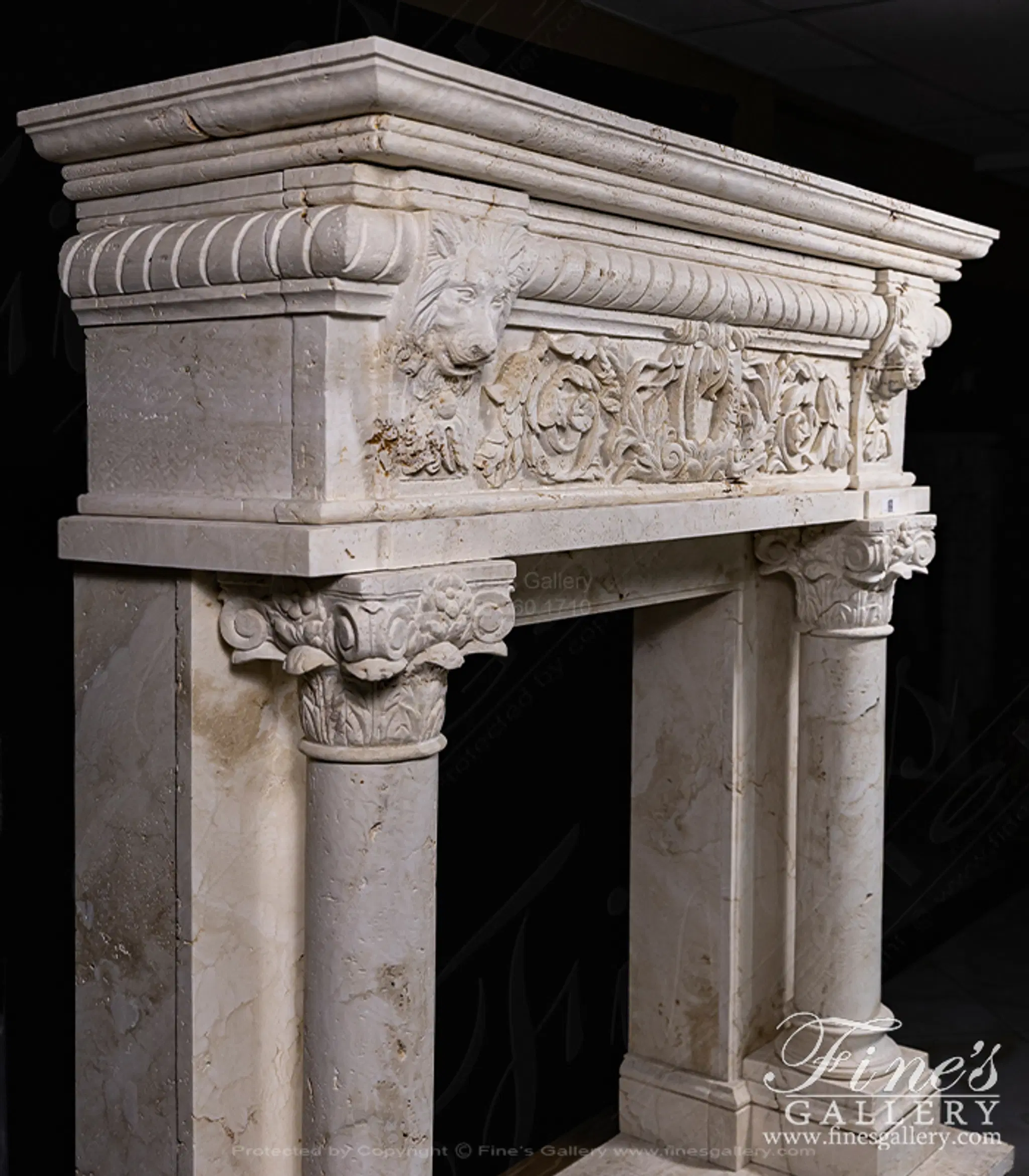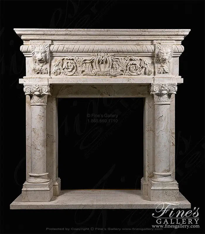Lions Den Surround carved from natural solid italian quarried Ivory travertine. This stunning master piece features regal lions and corinthian columns. A one of a kind design, originating from Italy!