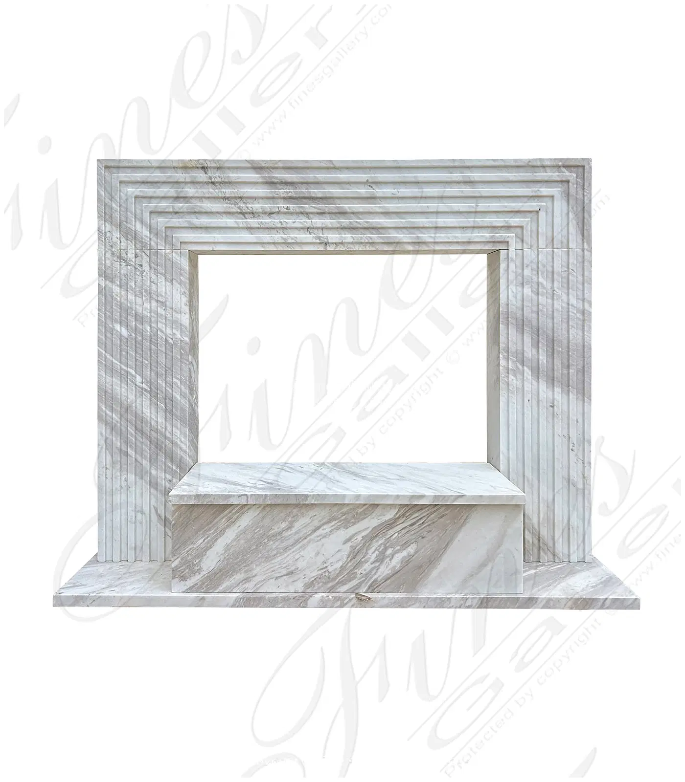A modern style mantel in grecian volakas marble. Optional raised hearth structure and backsplash are included with purchase.