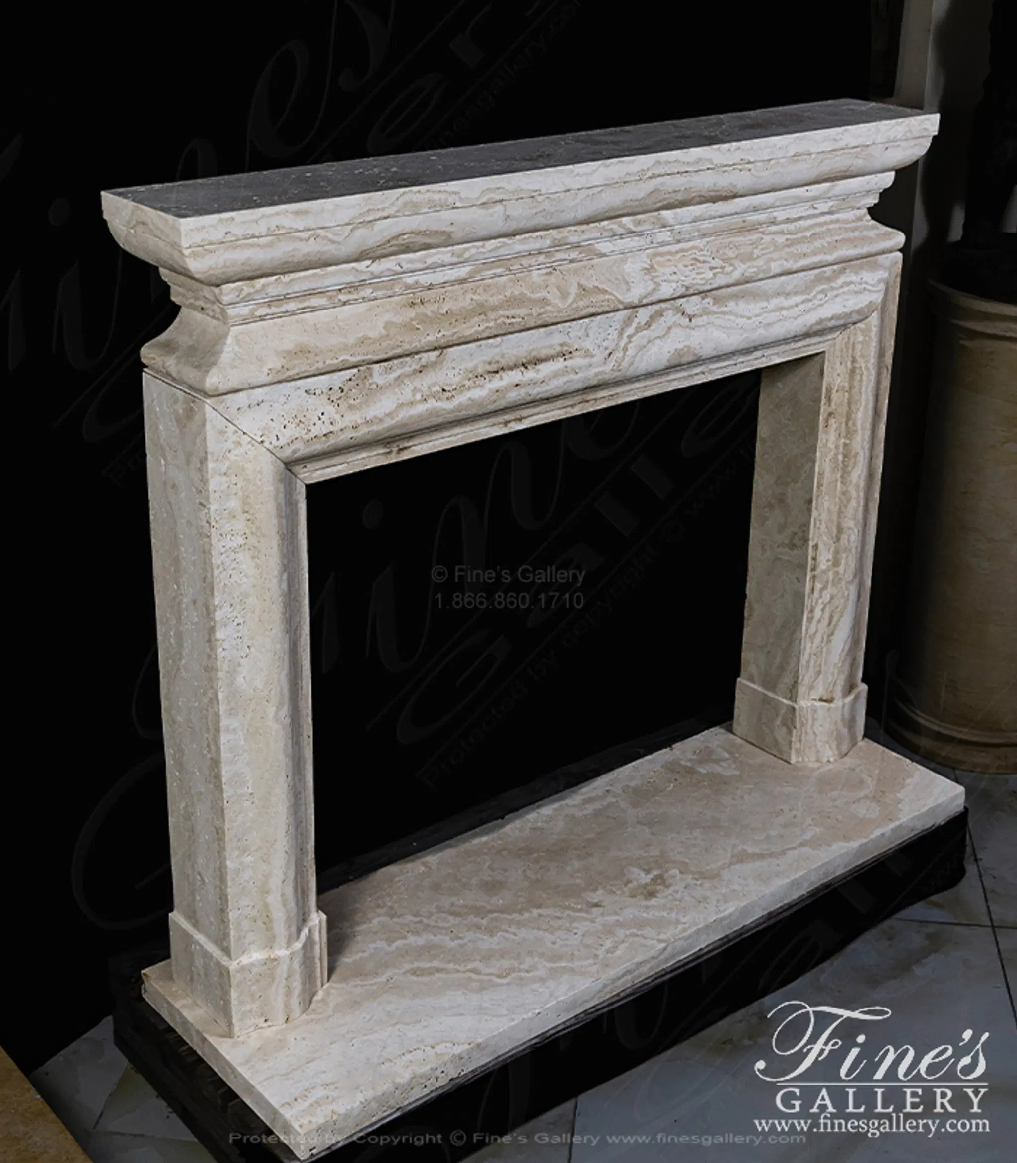 A Bolection Style Mantel in Exotic Italian Ivory Travertine. Design features include a shelf and mitered corners.