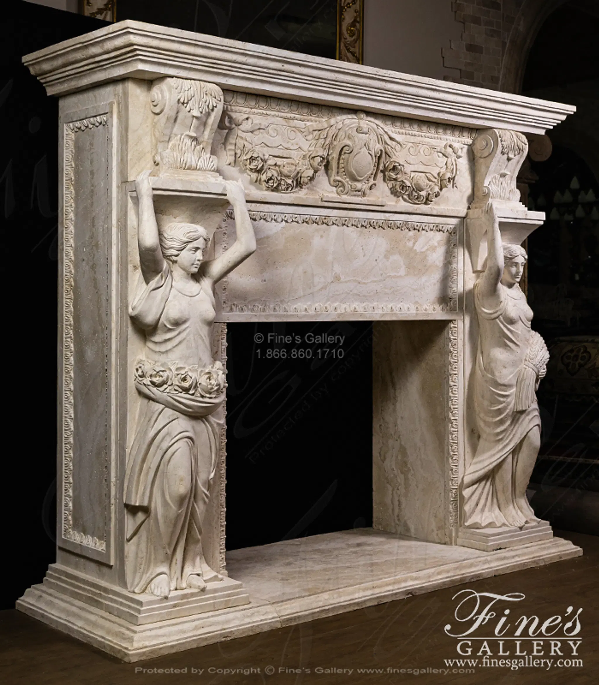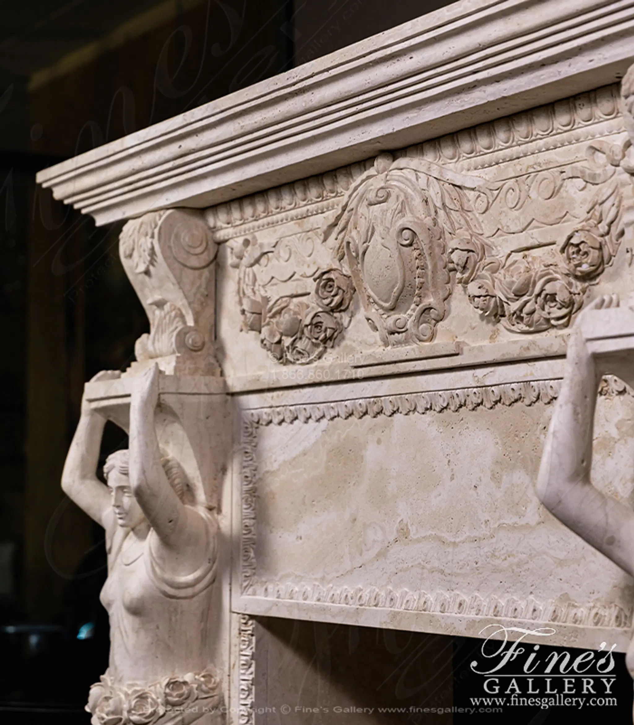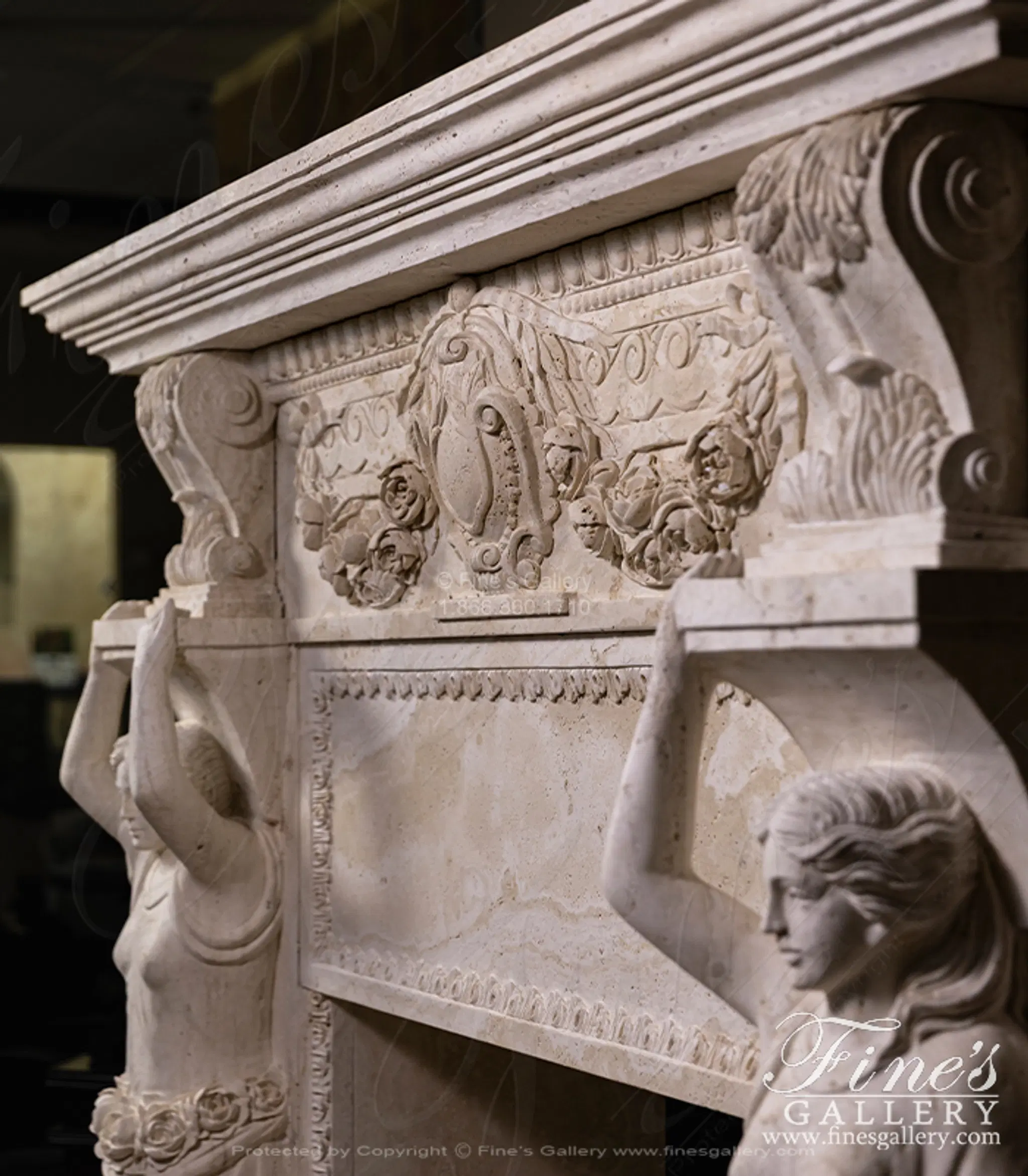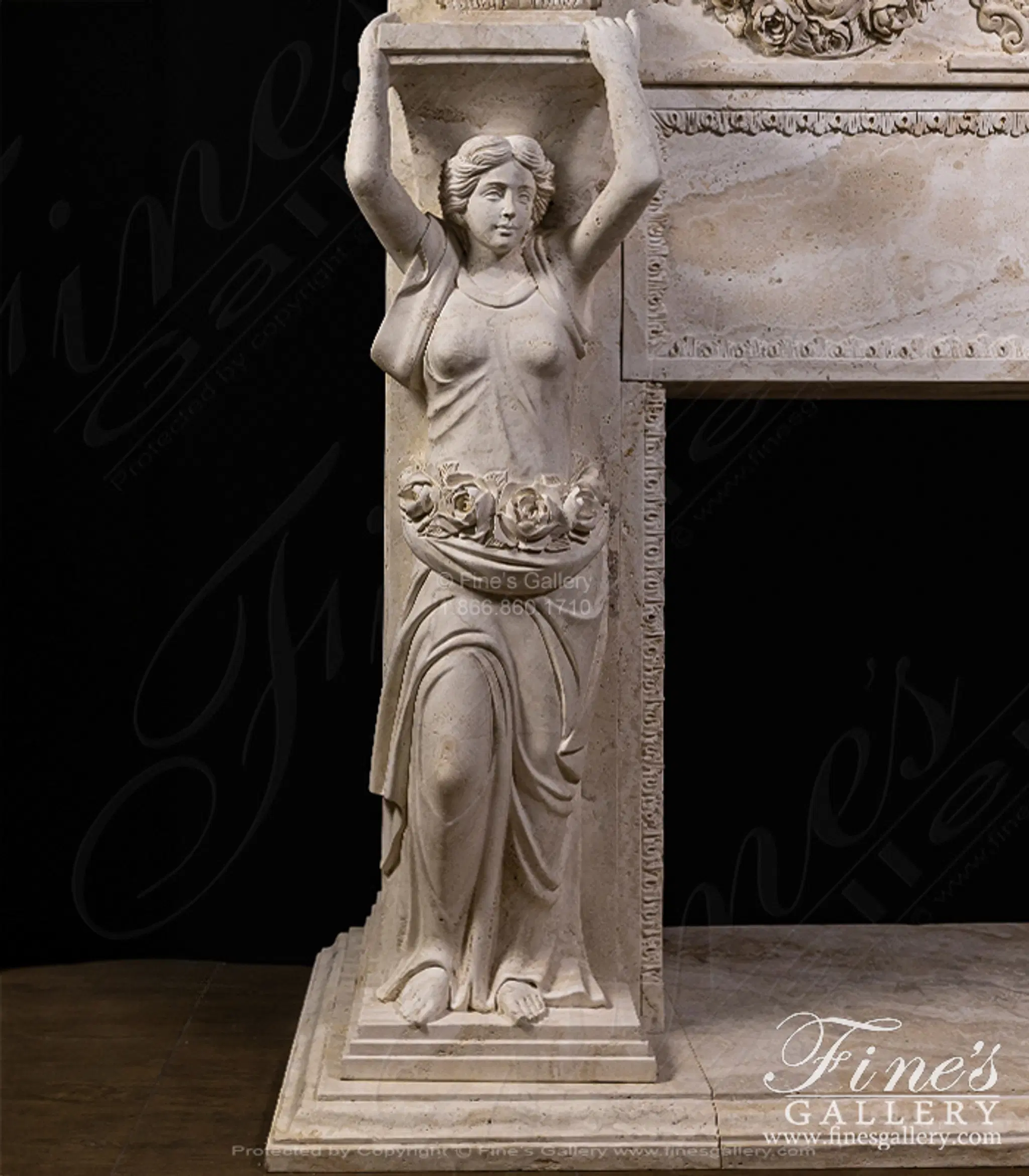 Oversized Figural Maidens with Rose Garlands Mantel in Italian Ivory Travertine - MFP-2695