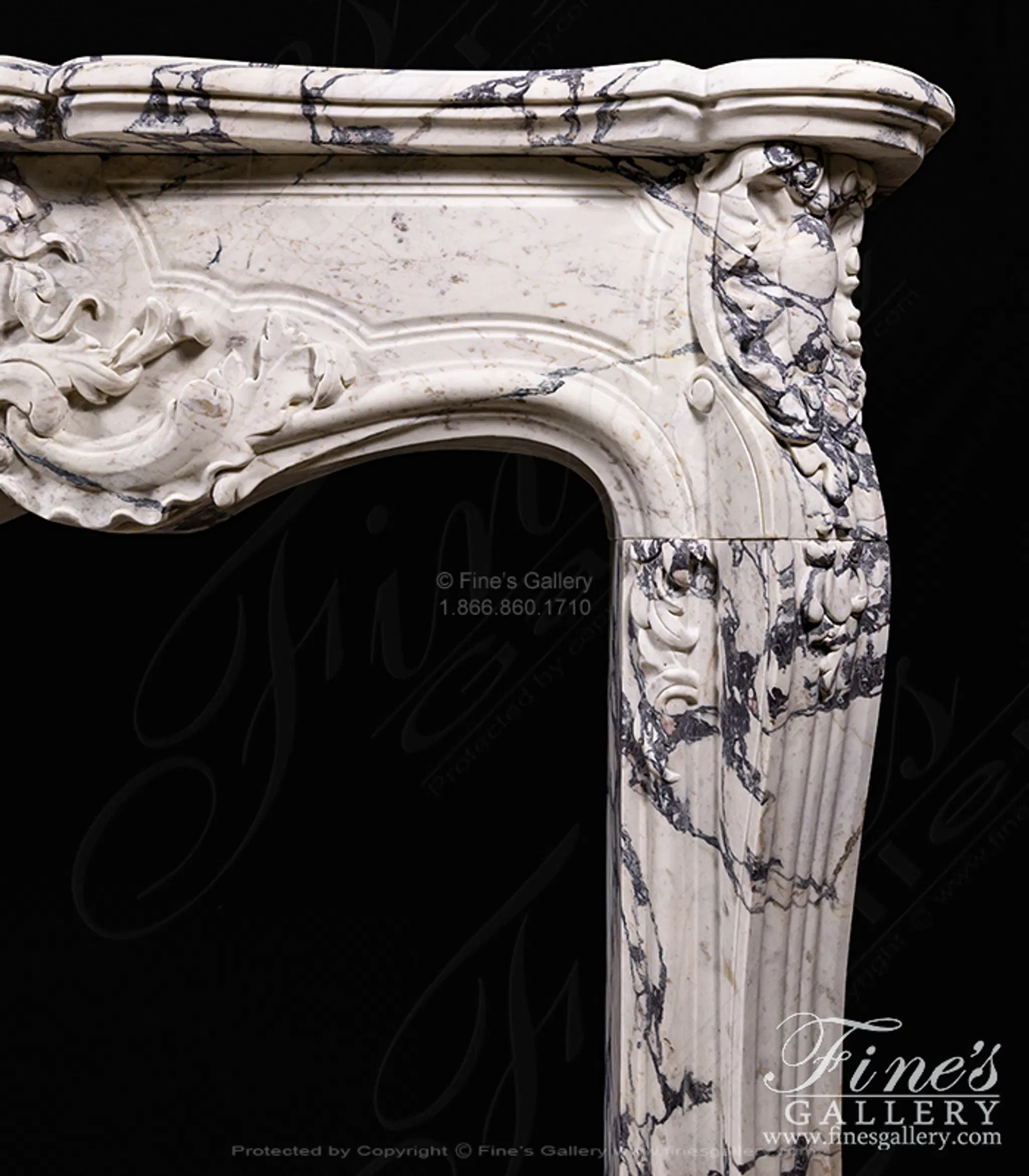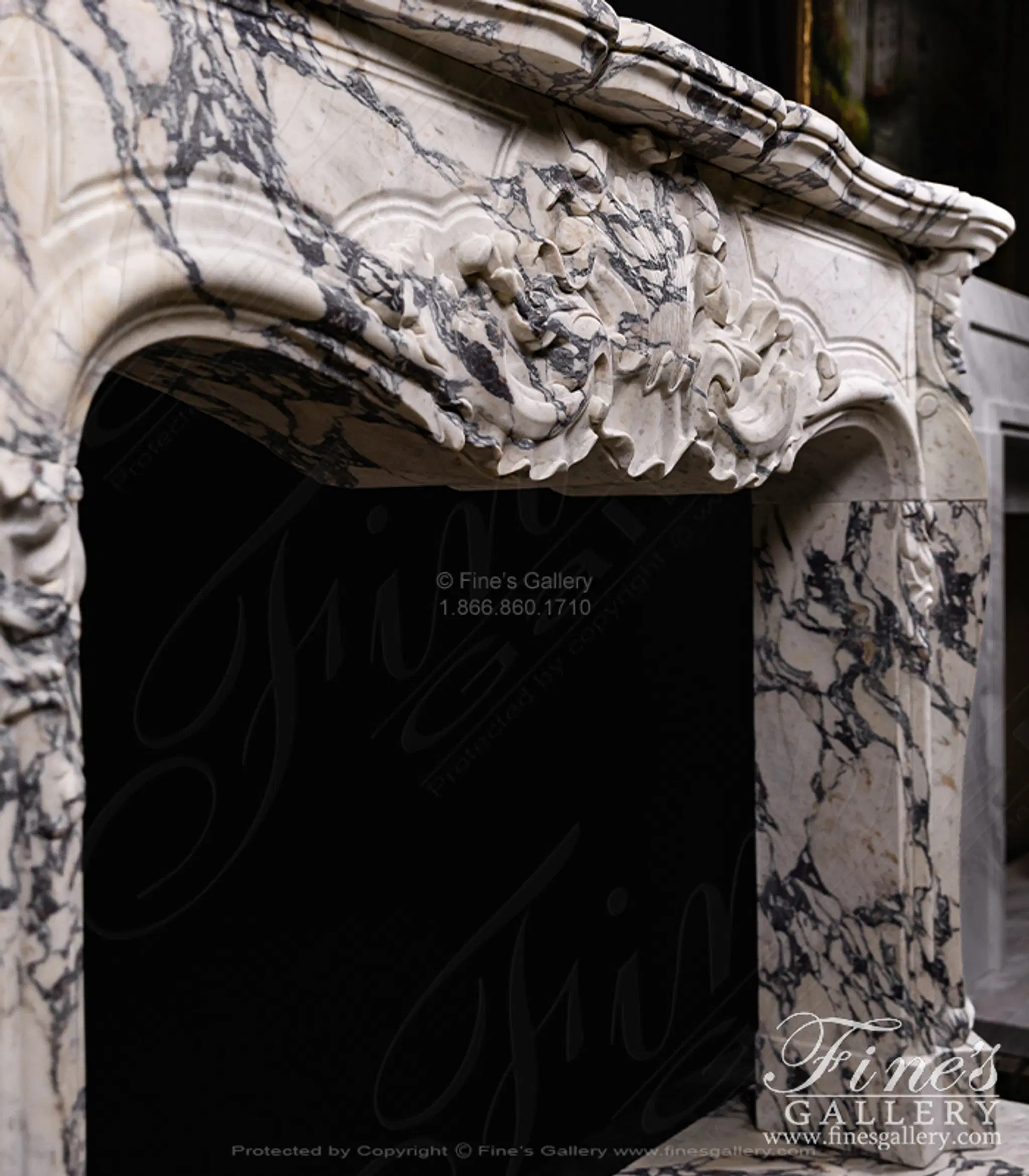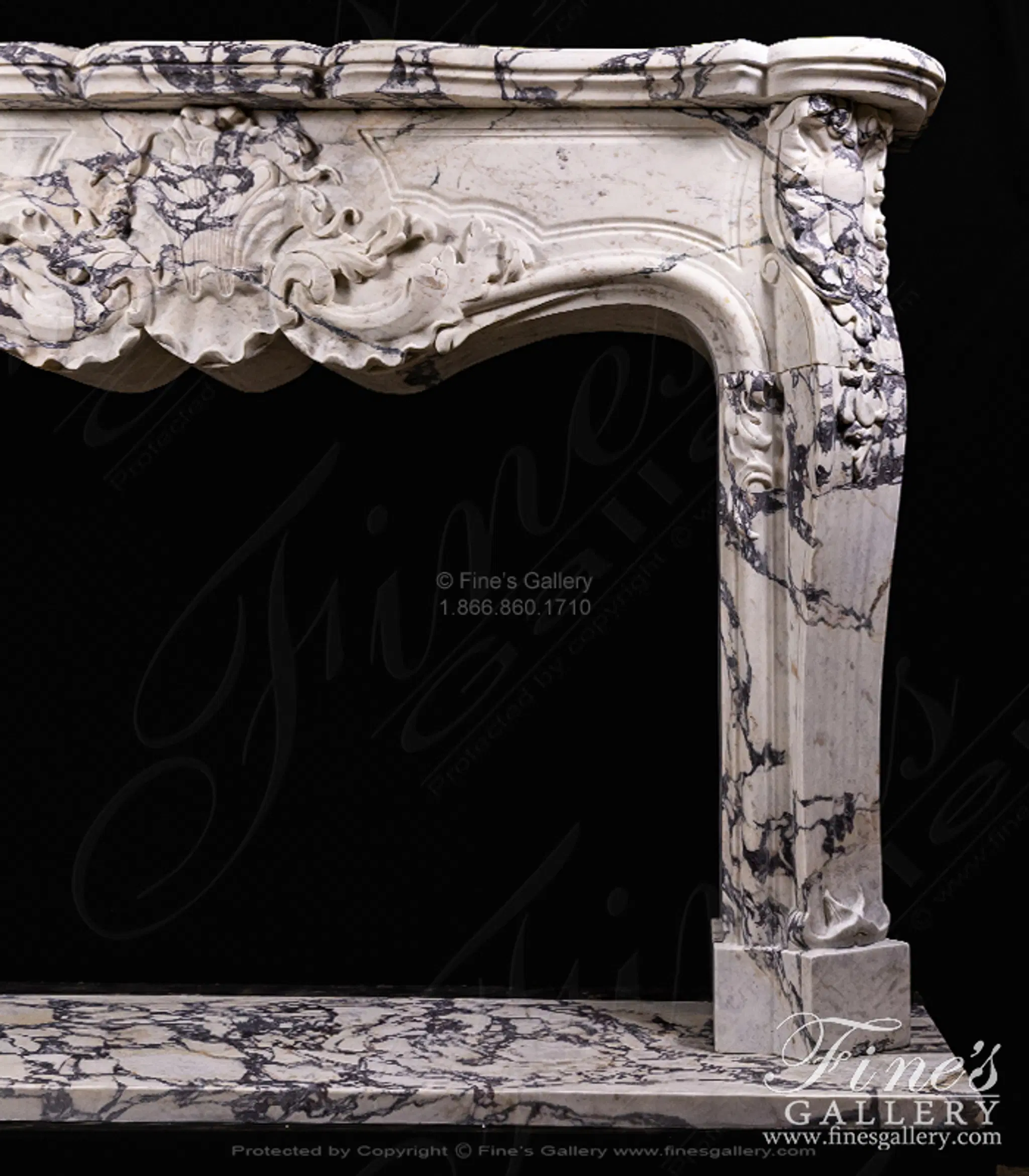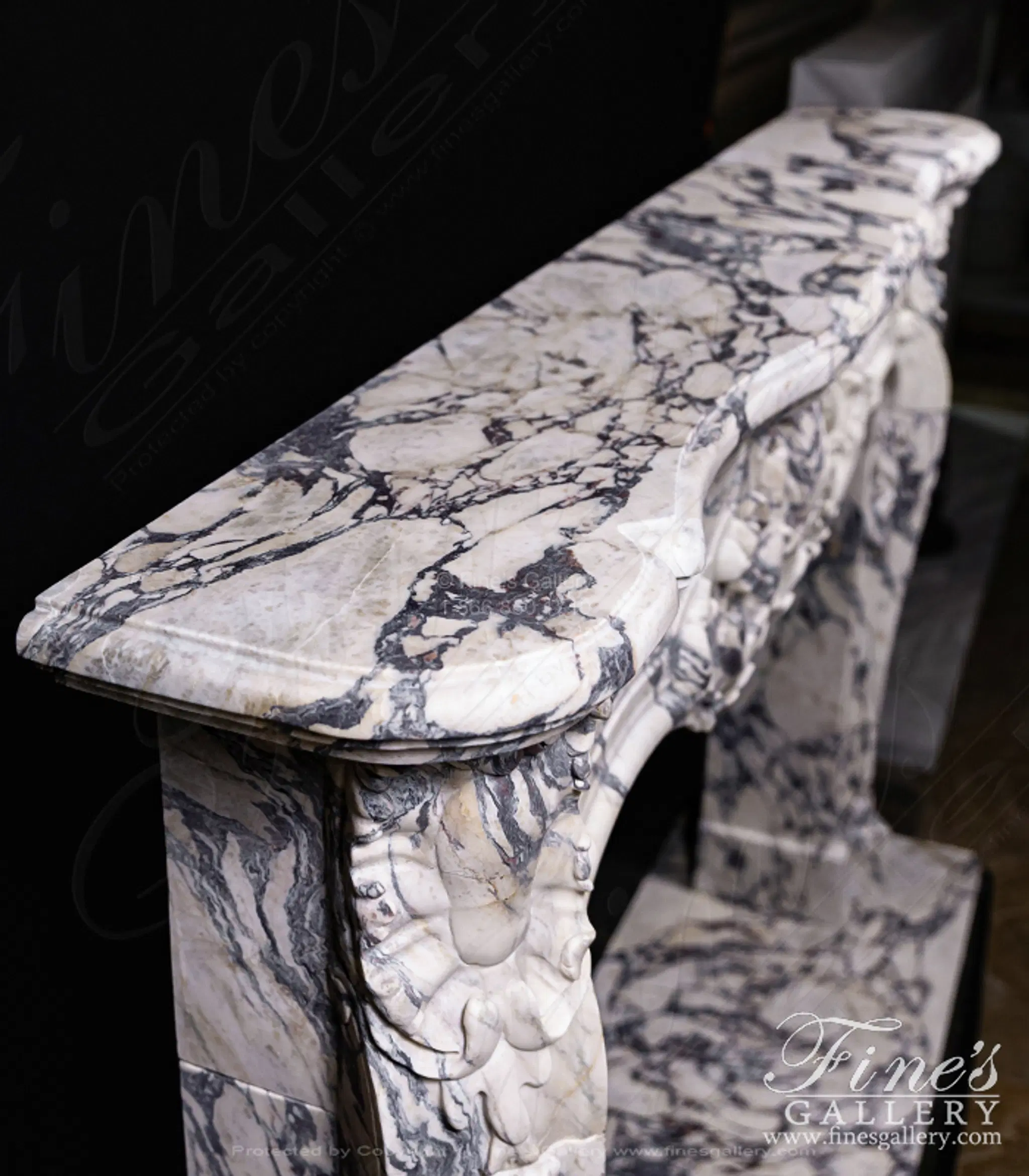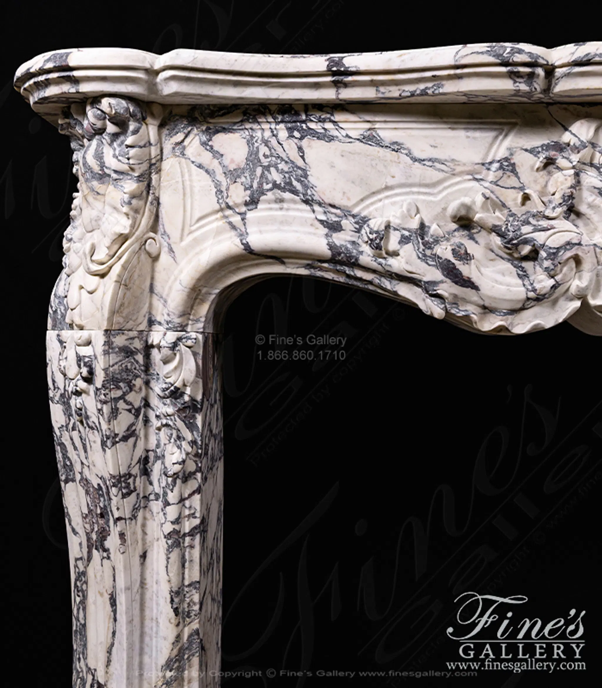 Rare French Style Mantel in Italian Breccia Viola Marble. The mantel includes deep relief carved from solid blocks of marble. Solid, not hollow construction!