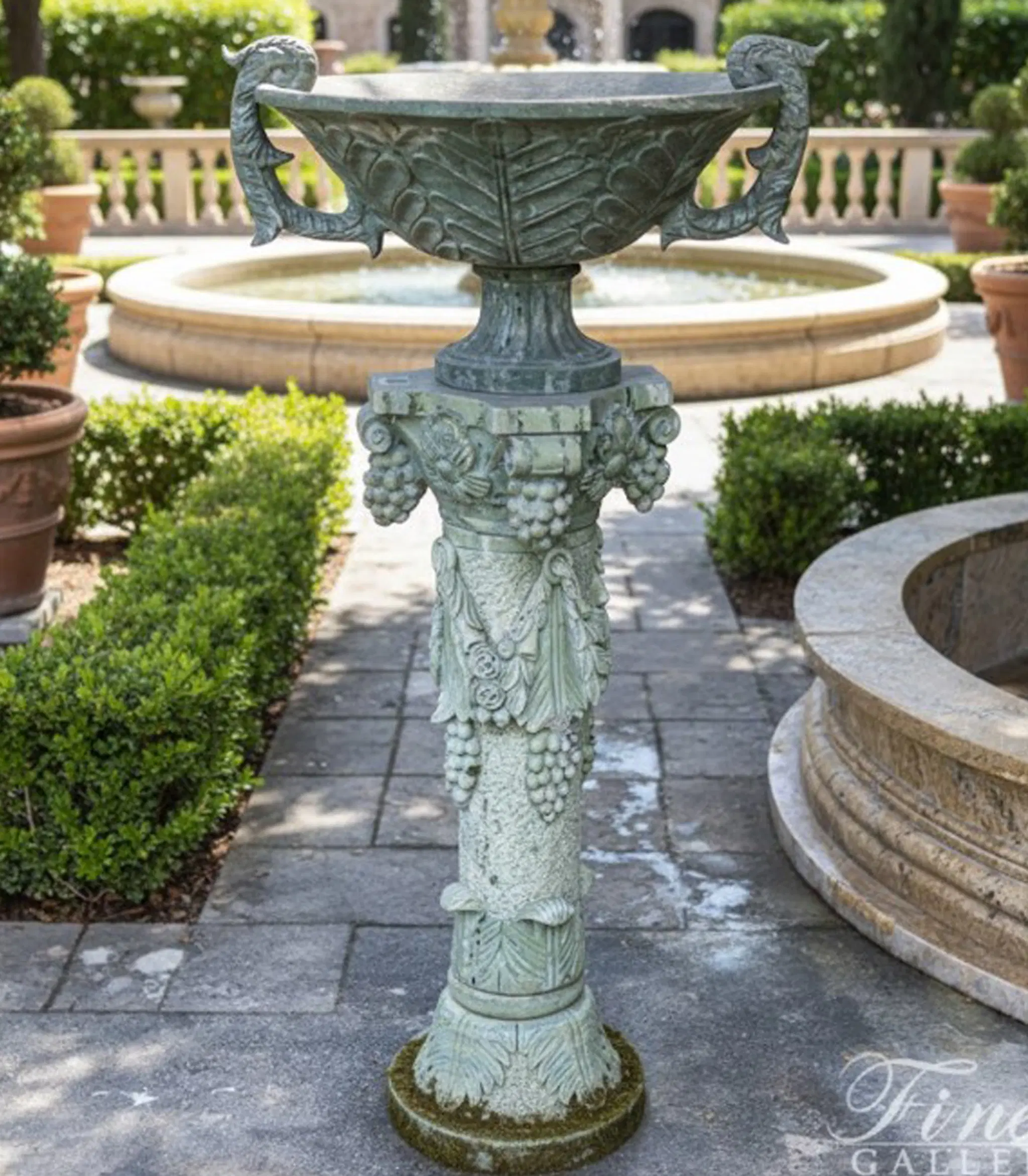 Ornate Green Marble Planter with Grape & Leaf Design - Handcrafted Decorative Urn with Pedestal Base