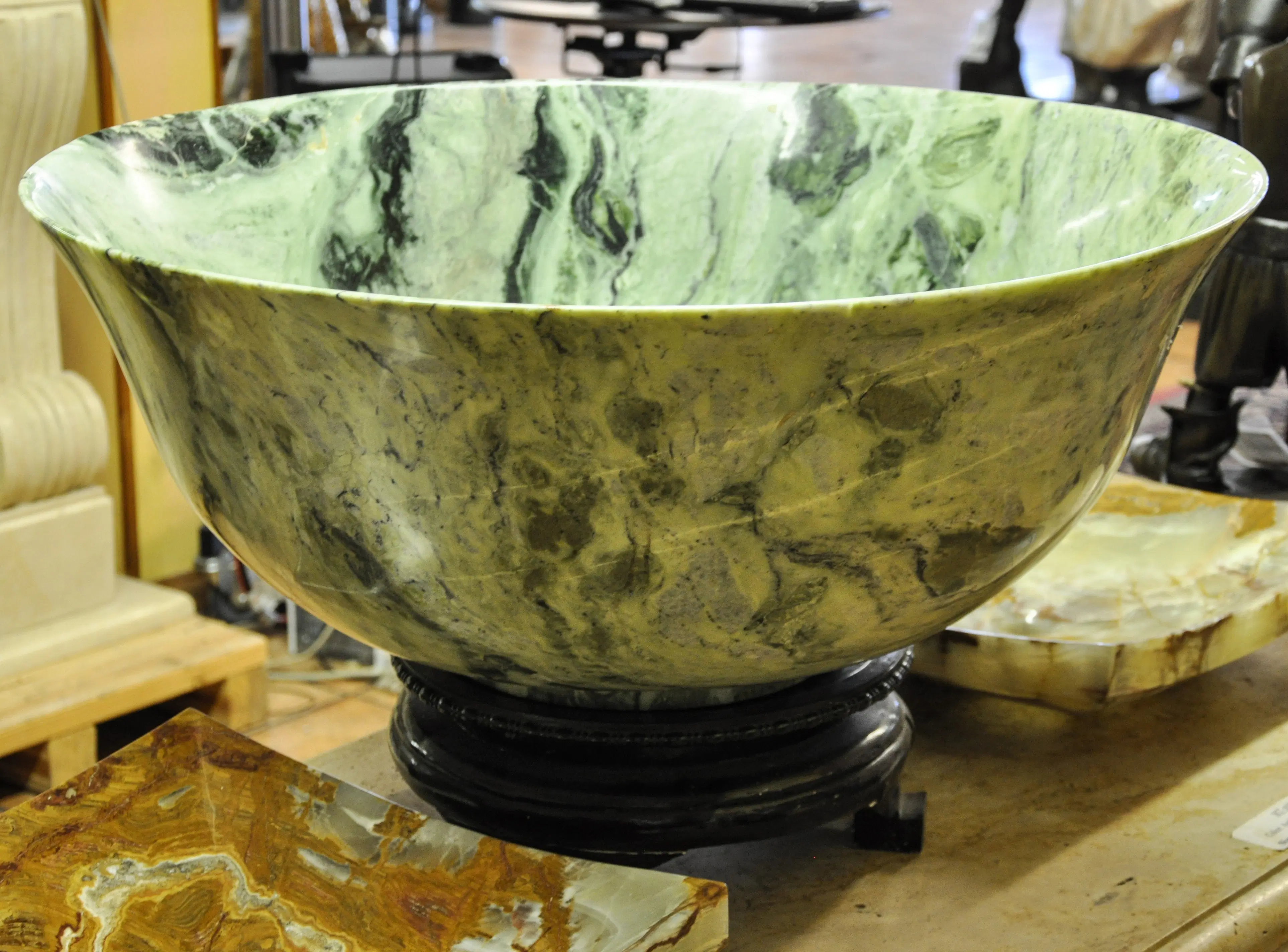A magnificent piece to display in your home and treasure for years to come! This large round planter is carved from elegant dual toned green marble and set upon a dark black base.