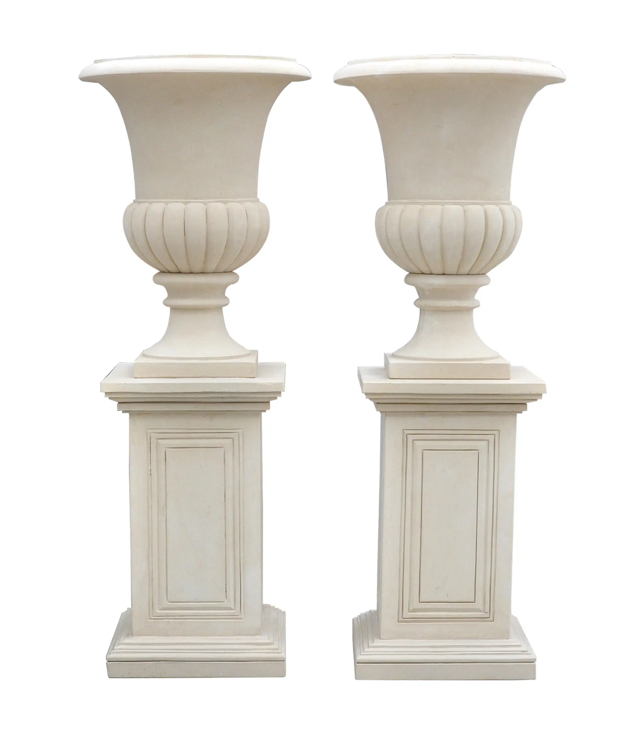 Elegant Pair of Limestone Planters with Matching Pedestals (MP-502) - Timeless Garden Decor Handcrafted from Premium Natural Stone - Perfect for Indoor or Outdoor Luxury Spaces - Exclusive Design from Fine's Gallery Collection of Custom Marble Accents