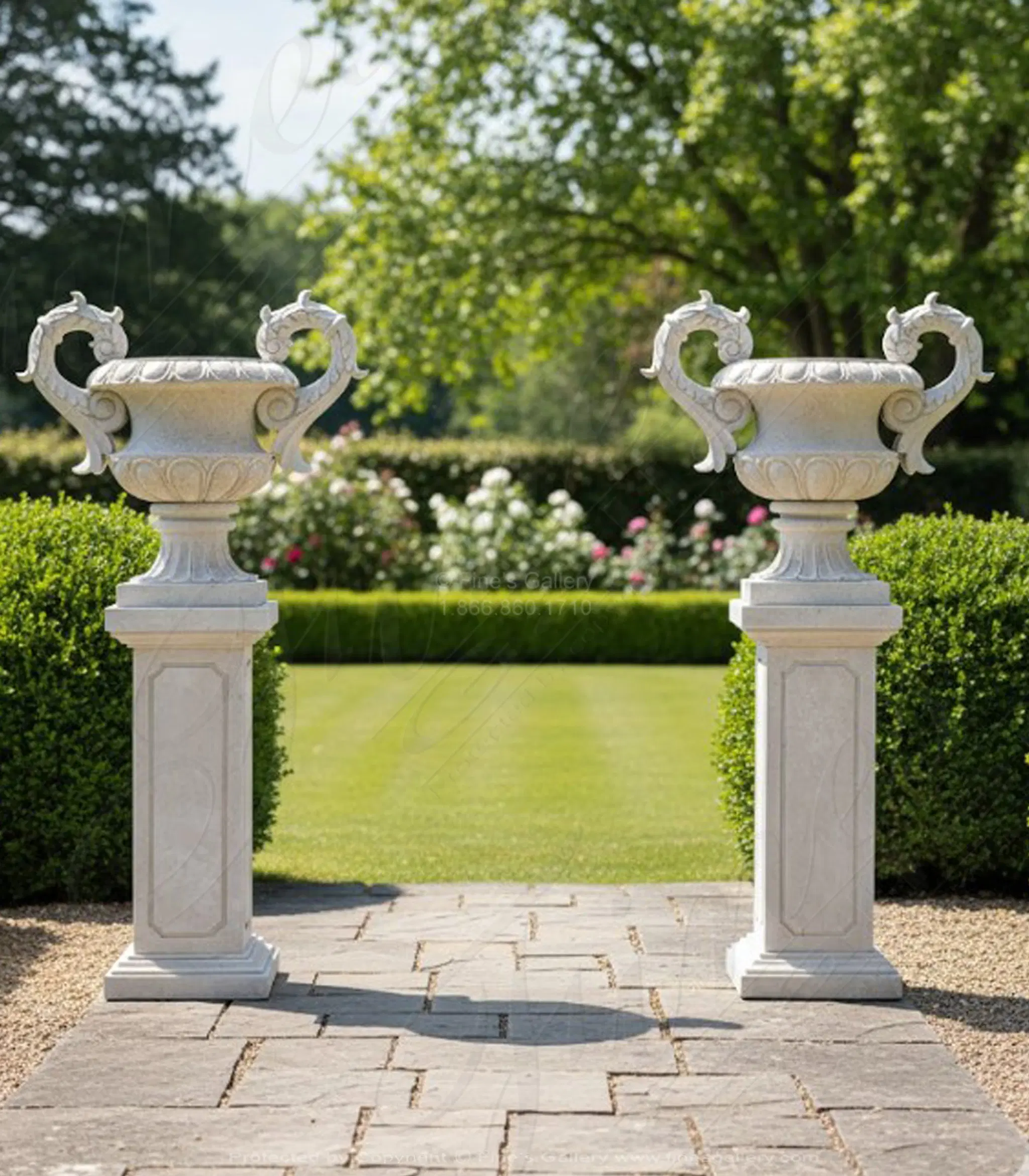 Light Travertine Planter Pair with Pedestals.