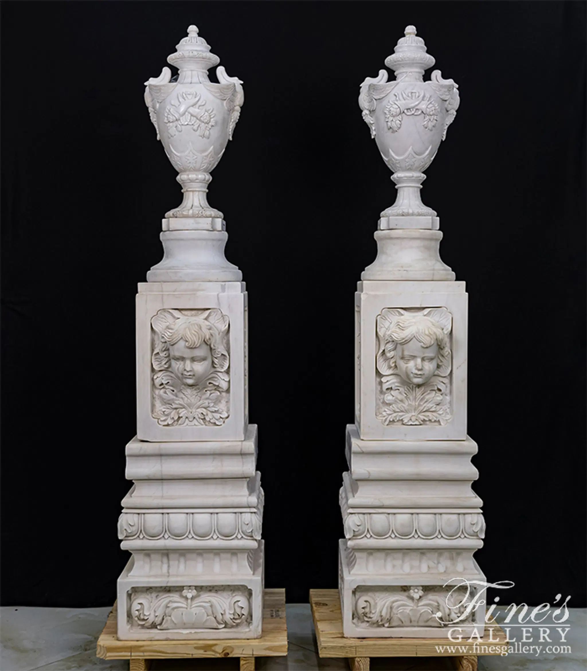 Rare, Vintage Highly Ornate Urn and Pedestal Pair in Statuary Marble. Hand carved deep relief features include cherubs, floral, egg and dart, traditional fluting and capped with a dual swan carving detail flanking each of the carved urns.