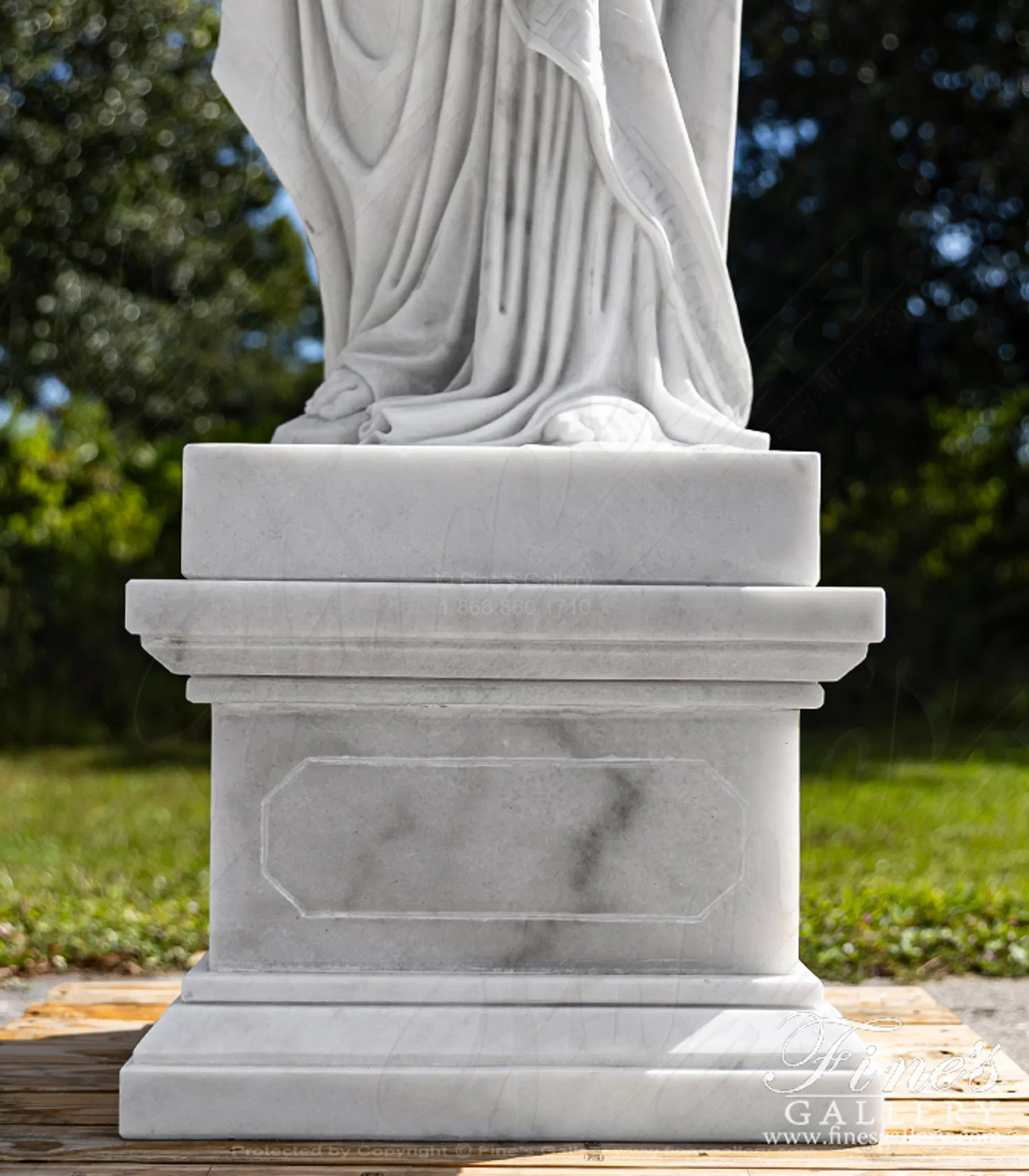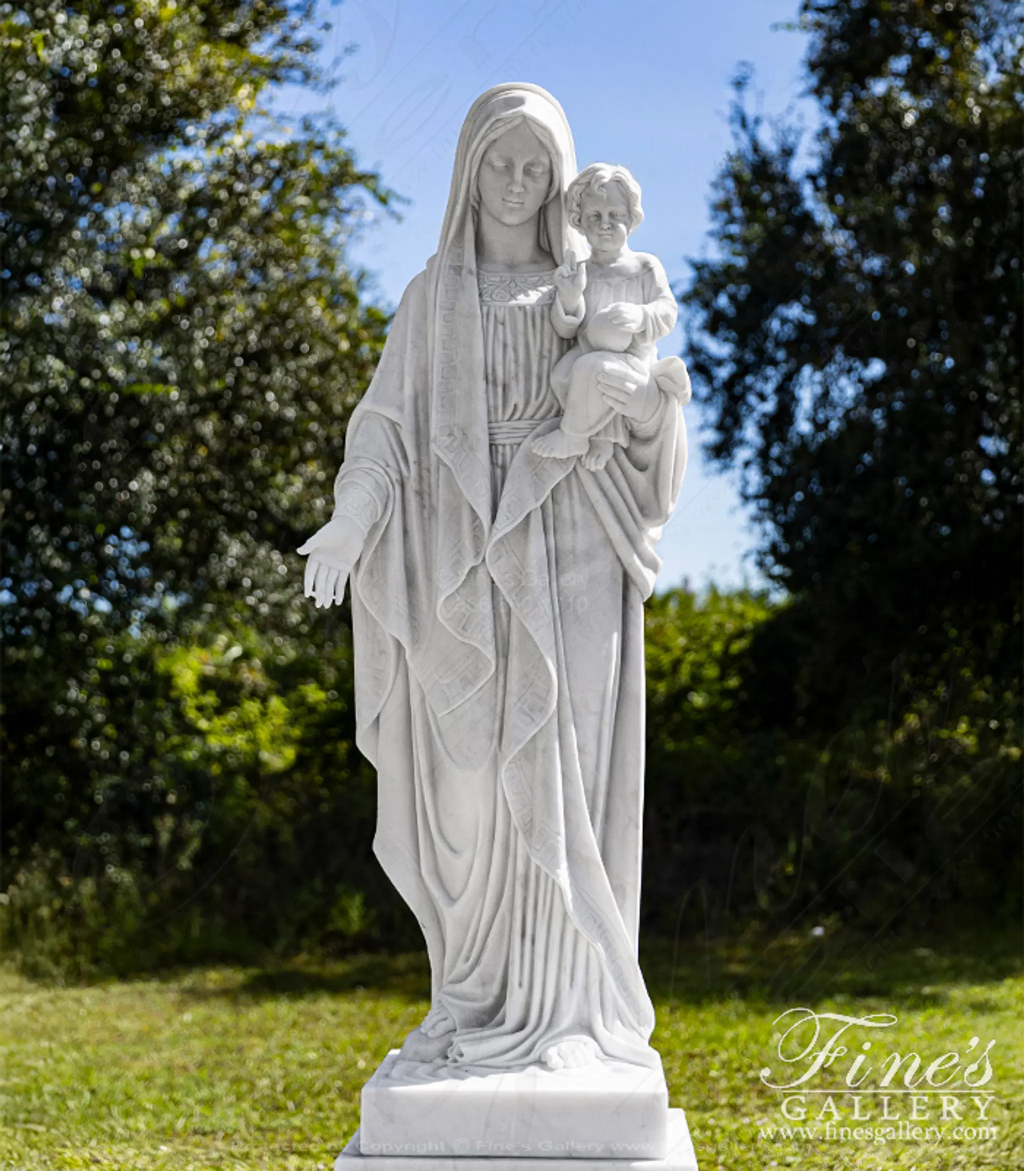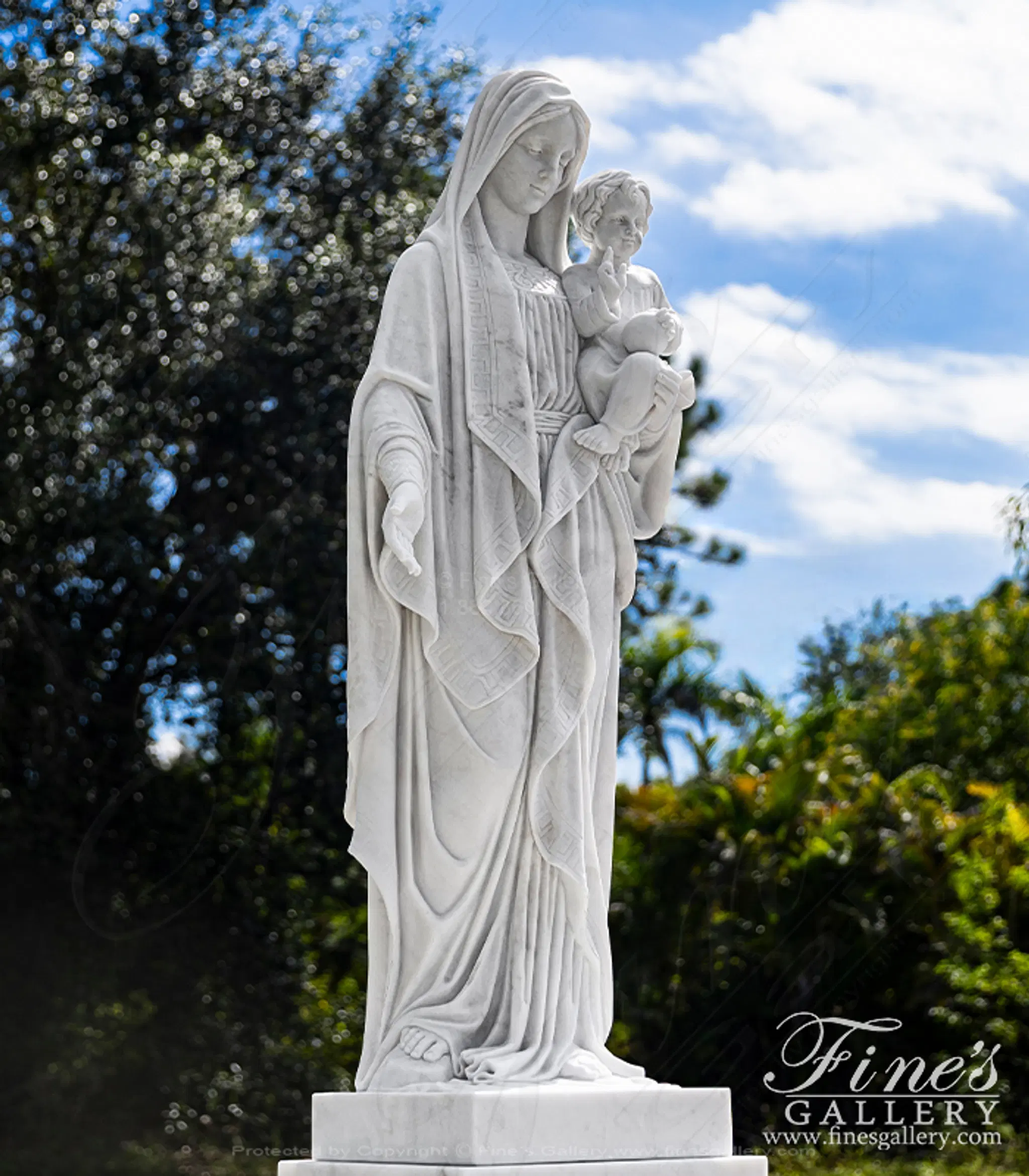Exquisite hand-carved Mother Mary and Baby Jesus statue crafted from premium statuary marble, with remarkable detail capturing their sacred bond. Includes complementary 14" marble pedestal for elegant display in churches, homes, or gardens. This timeless religious sculpture serves as a spiritual centerpiece radiating peace and devotion, meticulously created by skilled artisans from the finest quality marble.